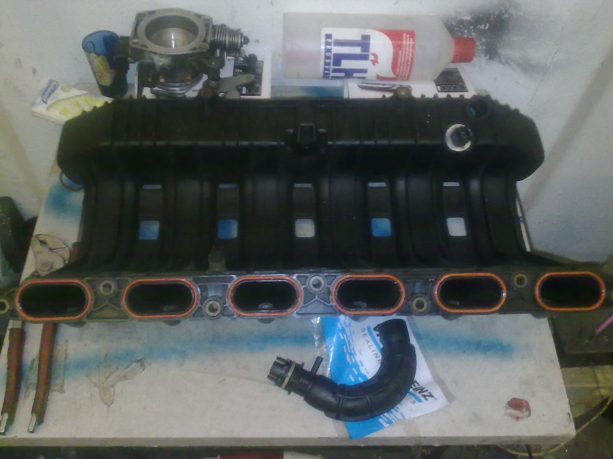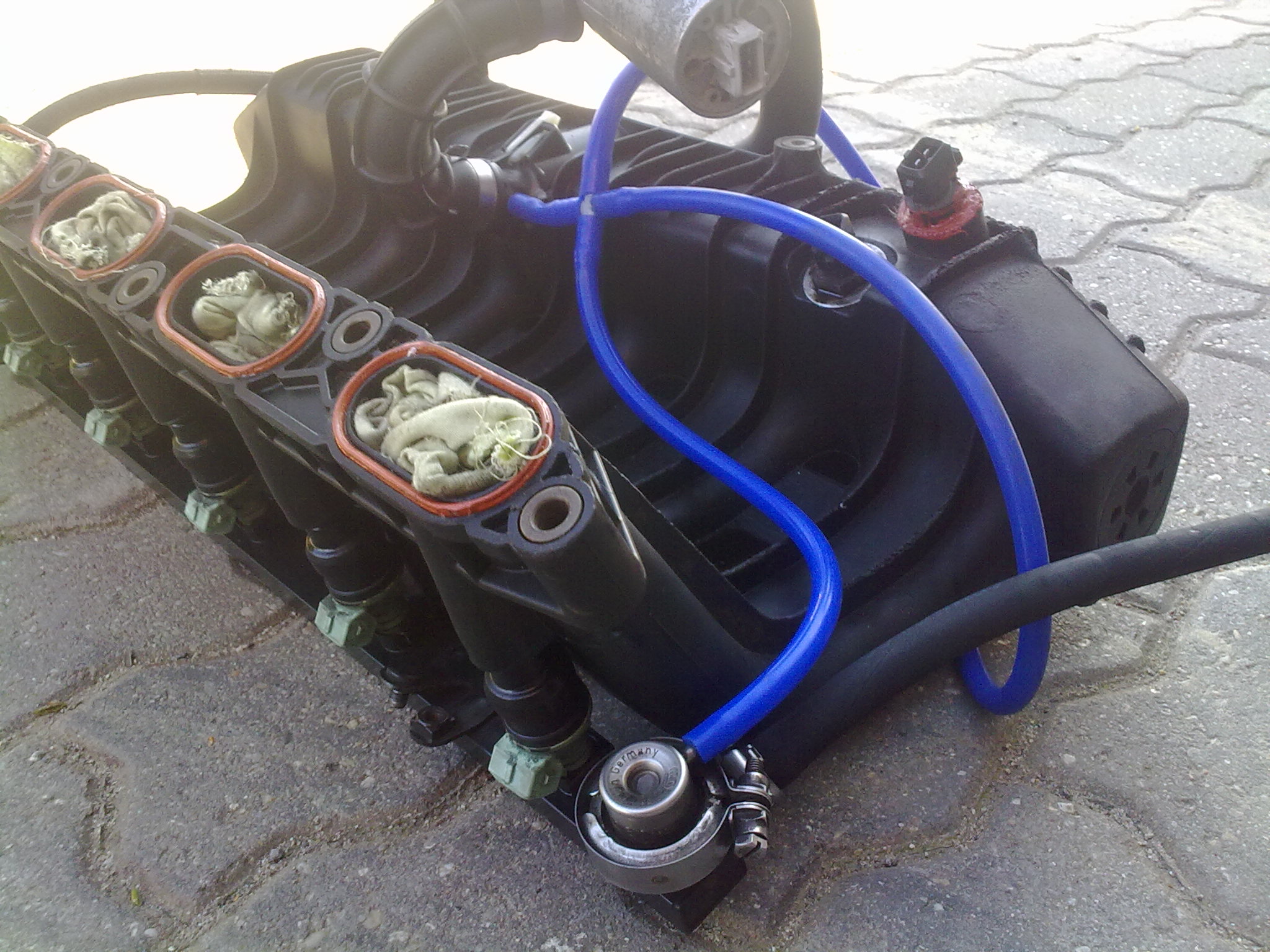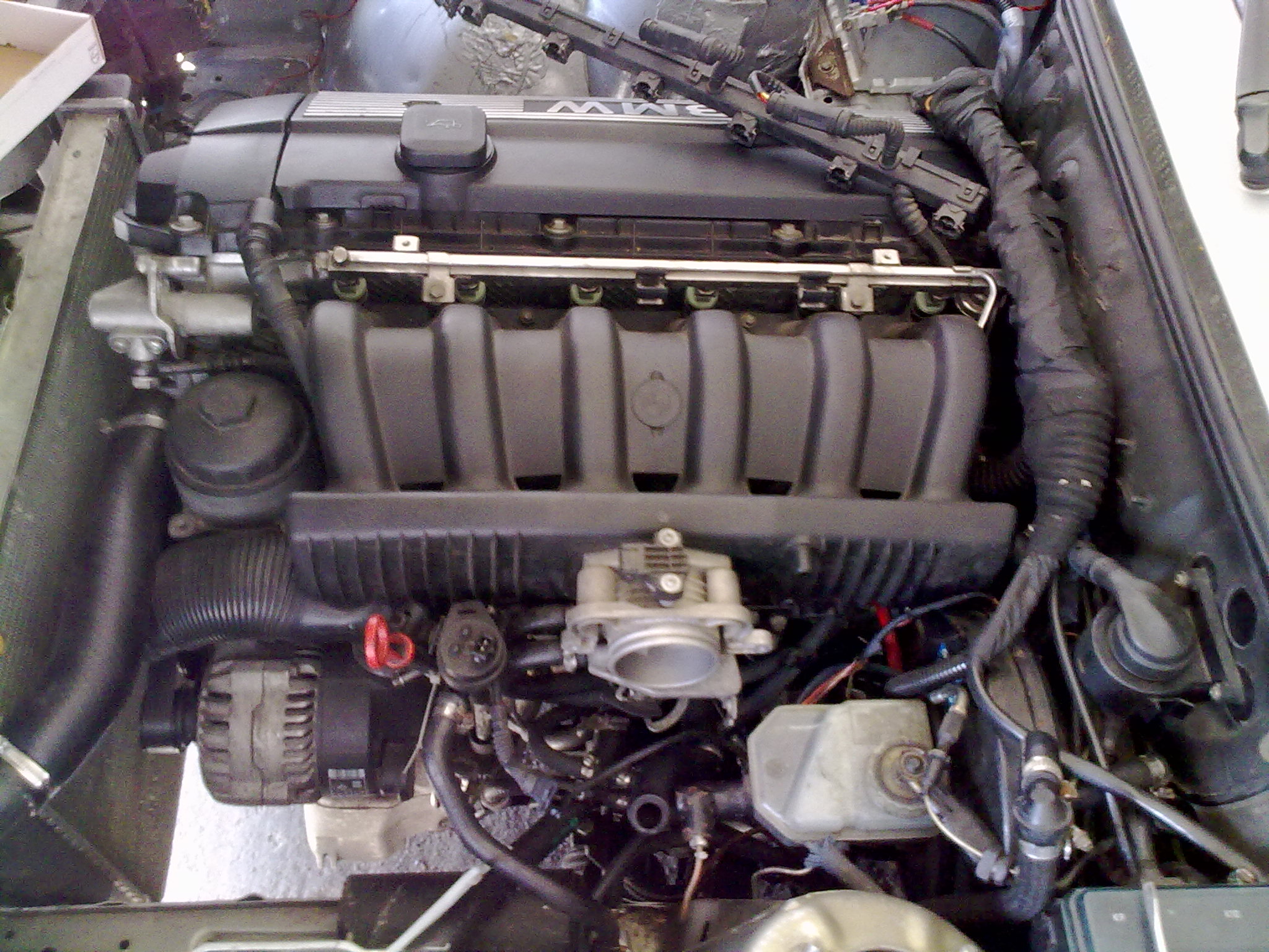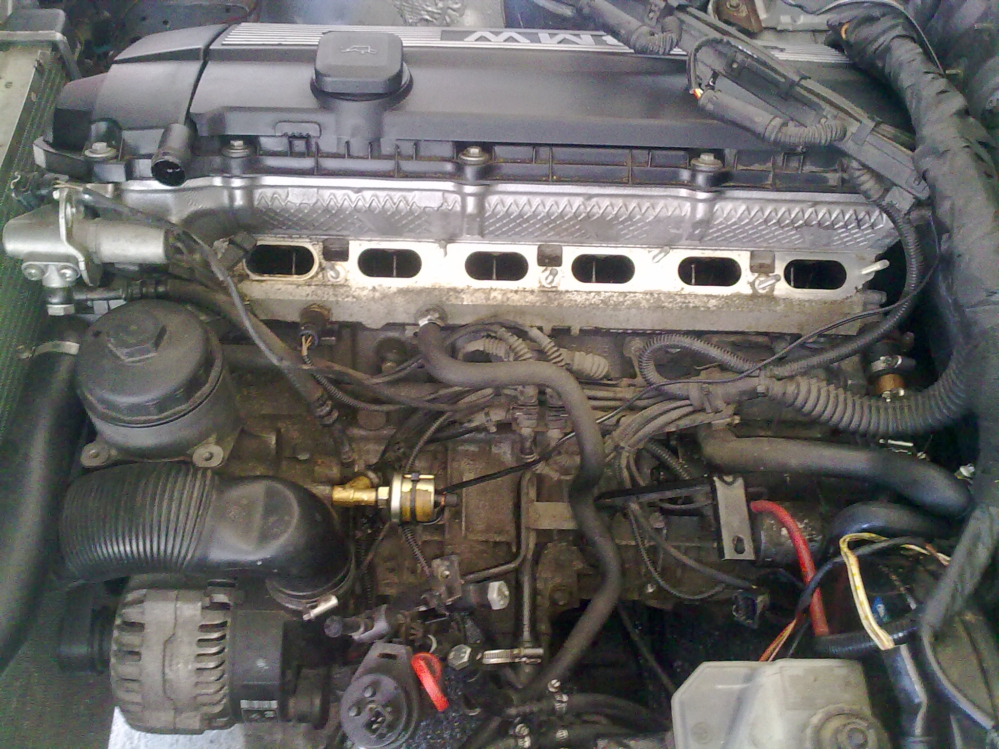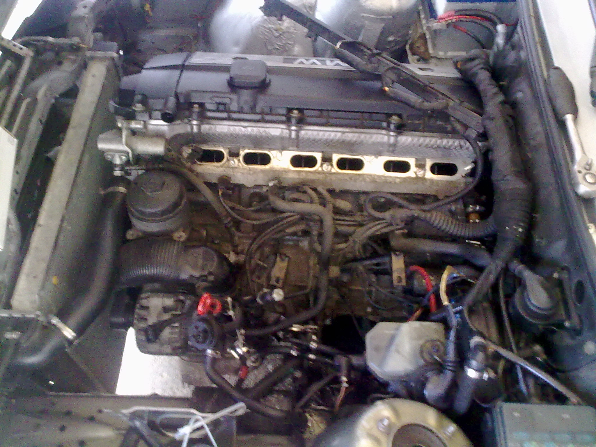 No, vratme sa k mojmu bombastickemu High HP m50 intake manifold performance swapu, z ktoreho sa ludia na nete rozplyvaju akoby presadli z m40 do v8. Zacal som od skoreho rana, hned ako som sa zobudil, vonku bola este tma (aspon myslim), bolo totiz len 11:00 doobeda. Po zaparkovani do garaze som sa pustil na cestu do neznama - neprebadany motor m52 ktory som zatial poznal rozobraty akurat z fotiek. Elektrika vstrekov odpojit, benzinove hadice, nejake dve hadicky na vodu do klapky, lanko, a nejake podtlakove hadicky takytak. Povolit samotne sanie a uz to slo dole. (musim uznat ze tento motor je aspon co sa tyka takychto praciciek rozumnejsie rieseny nez m20. Netreba pchat ruky pod sanie a po hmate triafat nejake matice :-) ). Po zhodeni sania som zacal riesit ako ten hadickovy system prehodit na m50 sanie kedze rezat do sania som nechcel z dovodu pretlaku v blizkej buducnosti. Hoc to na zaciatku vyzeralo mierne komplikovane, je to jednoduche. Na vsetky podtlaky kde sa to dalo som pouzil moje oblubene modre silikonove hadicky, ktore sa mi zatial osvedcili. Medzitym dorazila slecna pre ktoru je takato uprava uplna banalita tak si sla zdriemnut (na fotke zachyteny tazky zivot priatelky petrolheada