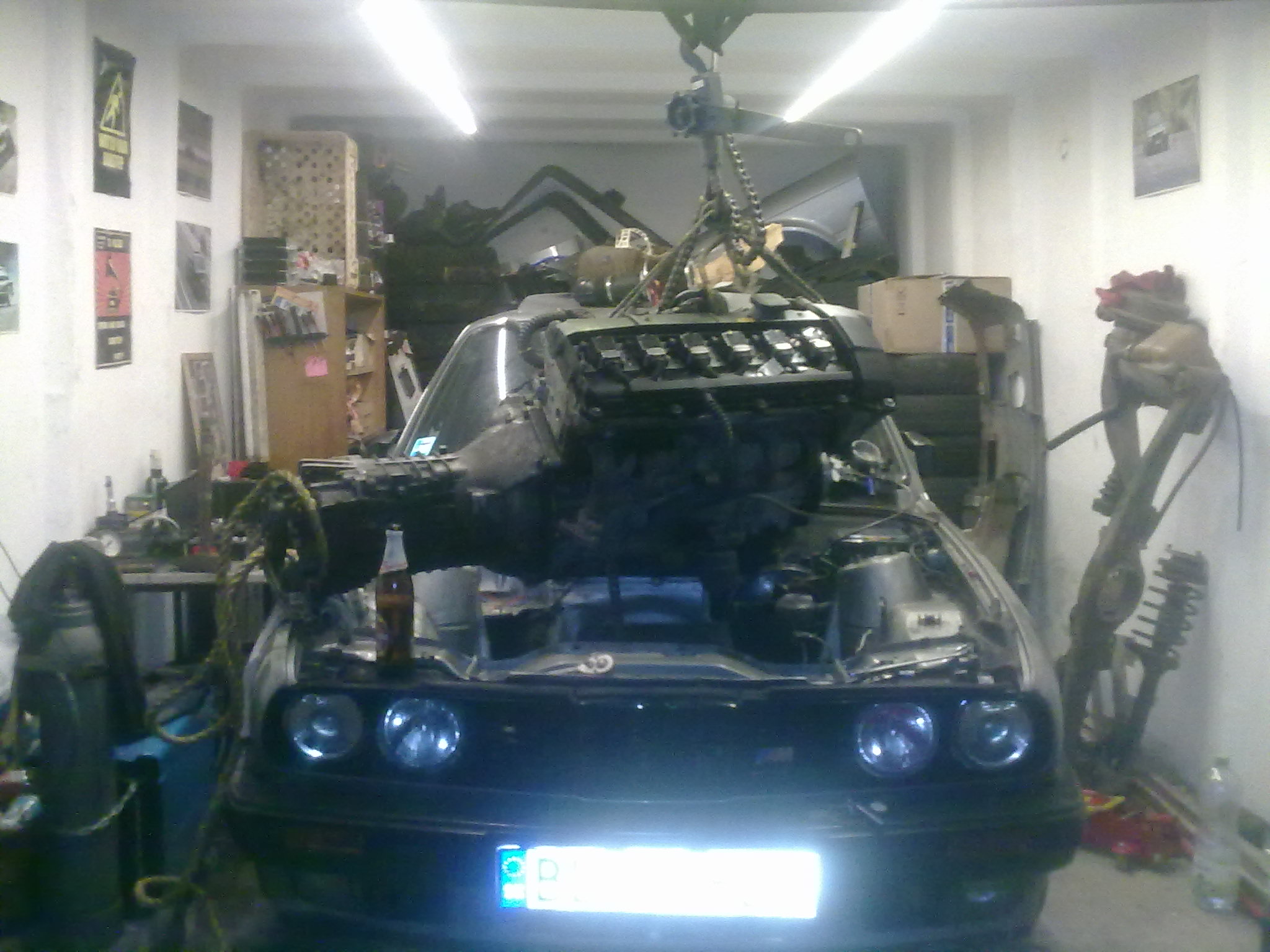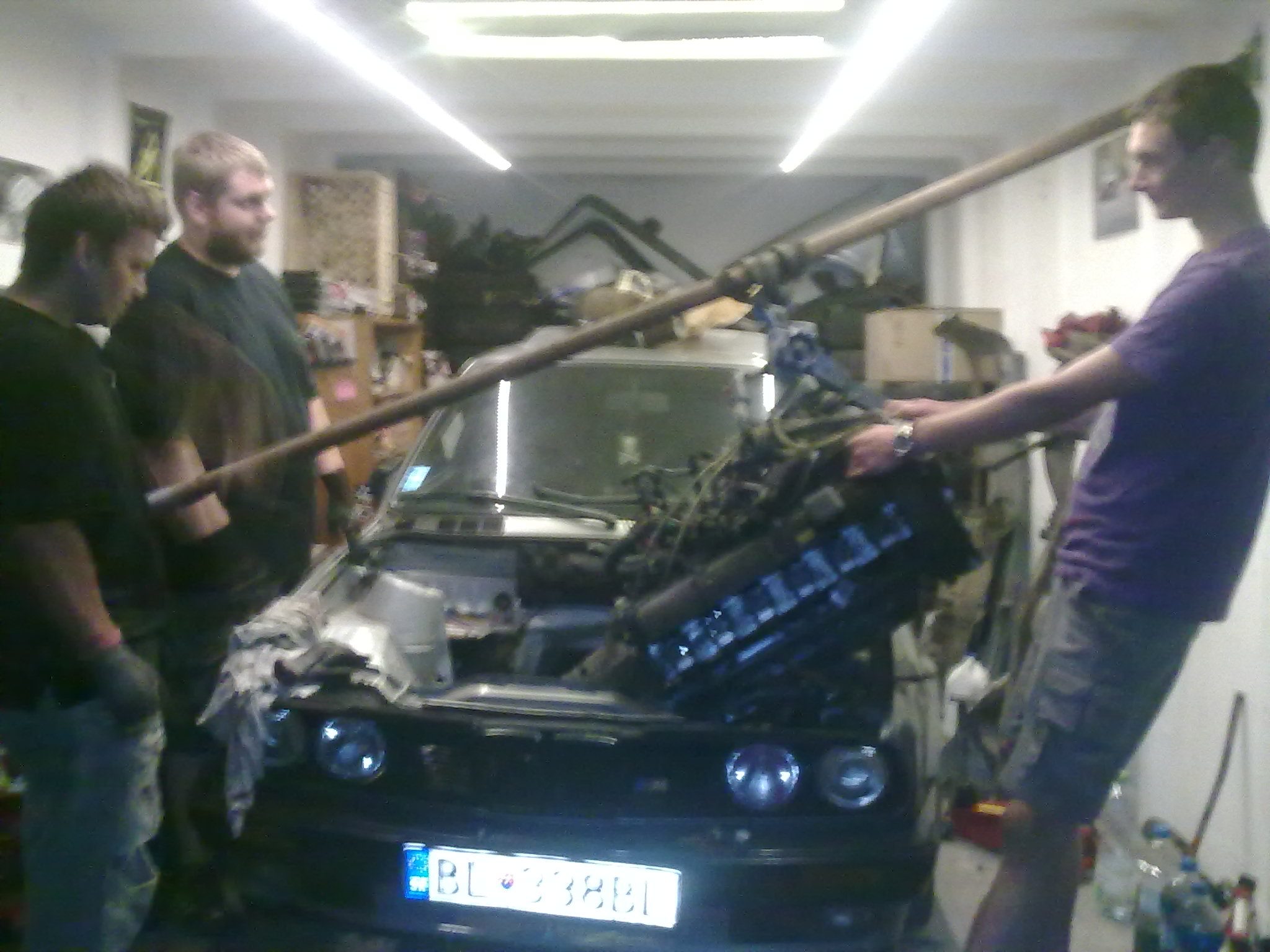 , tak som sa rezignovane zvrtol na päte a odkracal do krcmy naproti po dvanastku capovanu do plastu. Na dalsi den som dokoncil odpajanie elektriky, vypustil vodu, vybral chladic, vybral vyfuk (ako uz tolkokrat), odmontoval kardan, kulisu, a dalsie a dalsie veci. Skutocnost ze musim dat dole aj sanie aby som sa dostal k trubkam na kurenie uz som prijal ako holy fakt a sanie som za par minut dal dole(I love you m50 intake). To uz zasa dorazili pomocnici a motor sme zavesili na lano a hupcuk a zacali ho vytahovat von. Ked uz bol nad autom a potrebovali sme ho dostat tak ako je na poslednej fotke, sme motorom hybali a zrazu ze daco... Ta lesenarska trubka na ktorej to bolo zavesene sa na jednom konci vytiahla zo steny, motor padol na auto a padajuca trubka (ktoru tahal zcasti este aj motor) Trafila vsetkych pracantov okrem mna