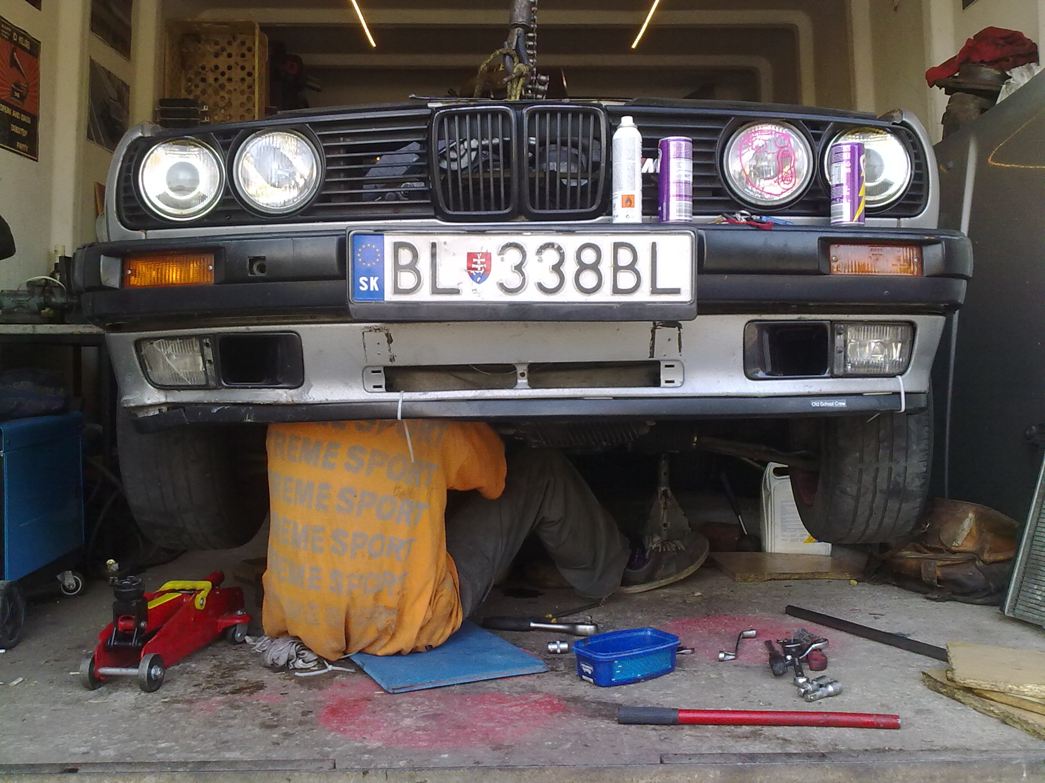. Z povodnych zvodov sa kamosovi podarilo uplne v klude vymontovat lambády a potom sme to uz nechali tak. Dnes najprv uprava lesenarskej trubky proti vypadnutiu, a potom dole prevodovka, spojka, zotrvak, vana, atd. Momentalne je auto viac rozobrate ako ked sme robili zastavbu
