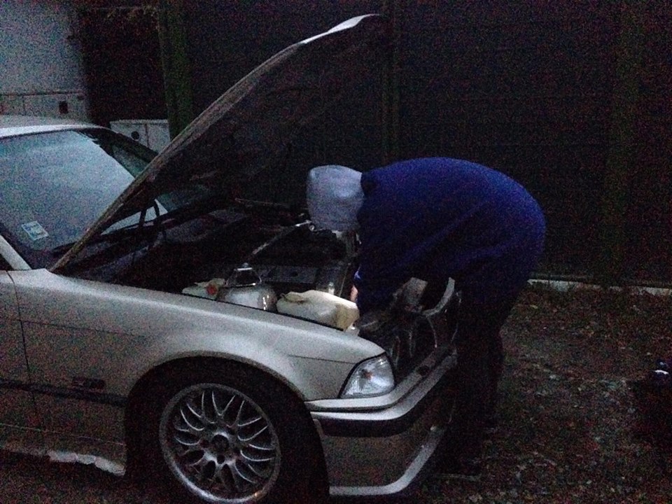 Takto to vyzeralo, keď som v novembri? na ulici menila chladič, vôbec som nevedela, čo vlastne robím. 3tisíc mikín na sebe.. Keď sa zotmelo, svietila som si baterkou, ktorú som držala v ústach, kedže mám len dve ruky :D ...Ako veľká hrdinka, veď ja na to prídem, uvidím aká hadica kam ide :D Po asi dvoch hodinách ked bol chladič vymenený, trebalo to ešte odvzdušňiť. Jediné čo som o tom vedela bolo to, že ked to rýchlo nespravím a nezakúrim si, umrznem :D Naštastie sa vždy nájde niekto, kto ochotne poradí. Na facebooku si neviem vynachváliť e36 slovensko skupinu, žiadne hejty ako v bmwfans, každý tam vždy poradí :)