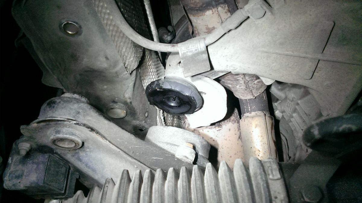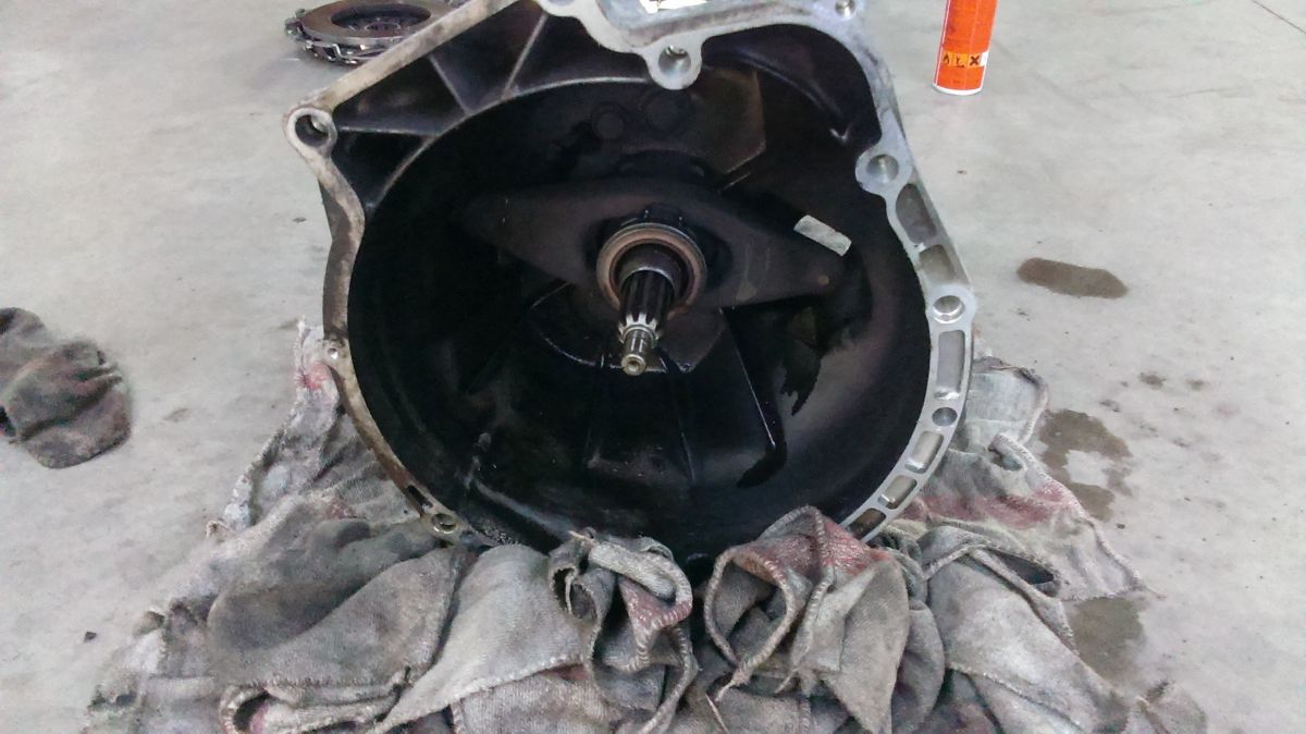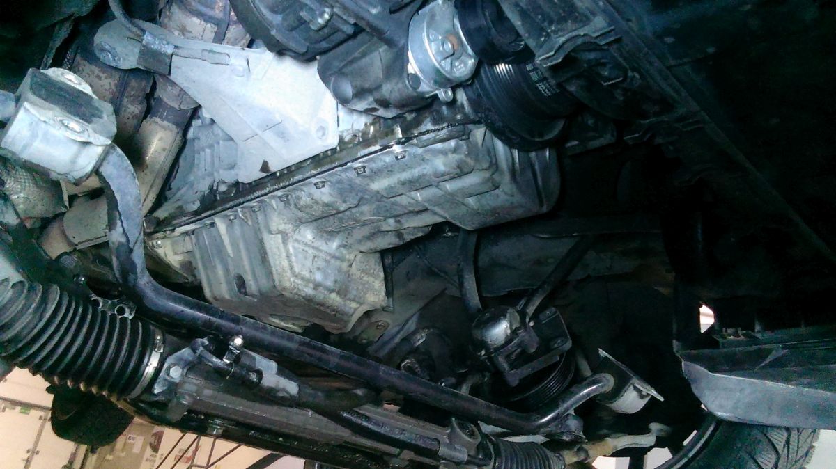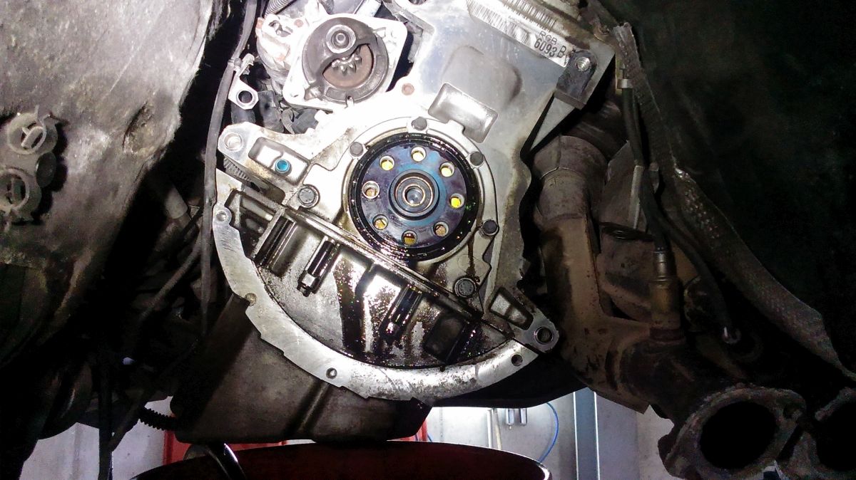 Flasho motor odspodu kompletne vyčistil od oleja, aby mohol identifikovať kritické miesta, kade olej uniká. Verdikt ma veľmi nepotešil - gufero klukovky medzi motorom a prevodovkou. Je to síce niekoľkoeurová záležitosť, ale pri výmenie musí ísť dolu prevodovka.