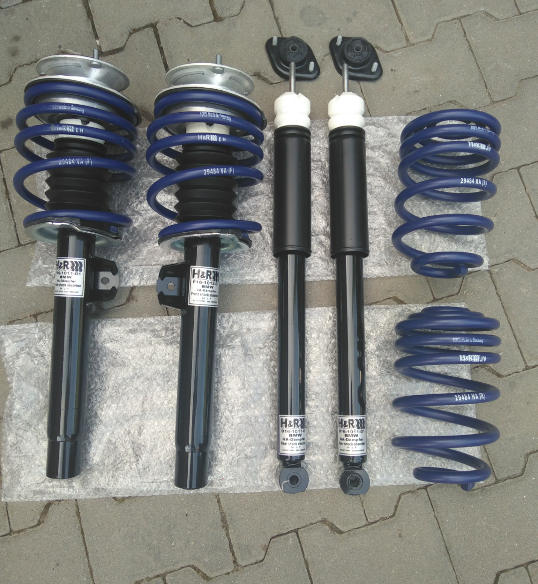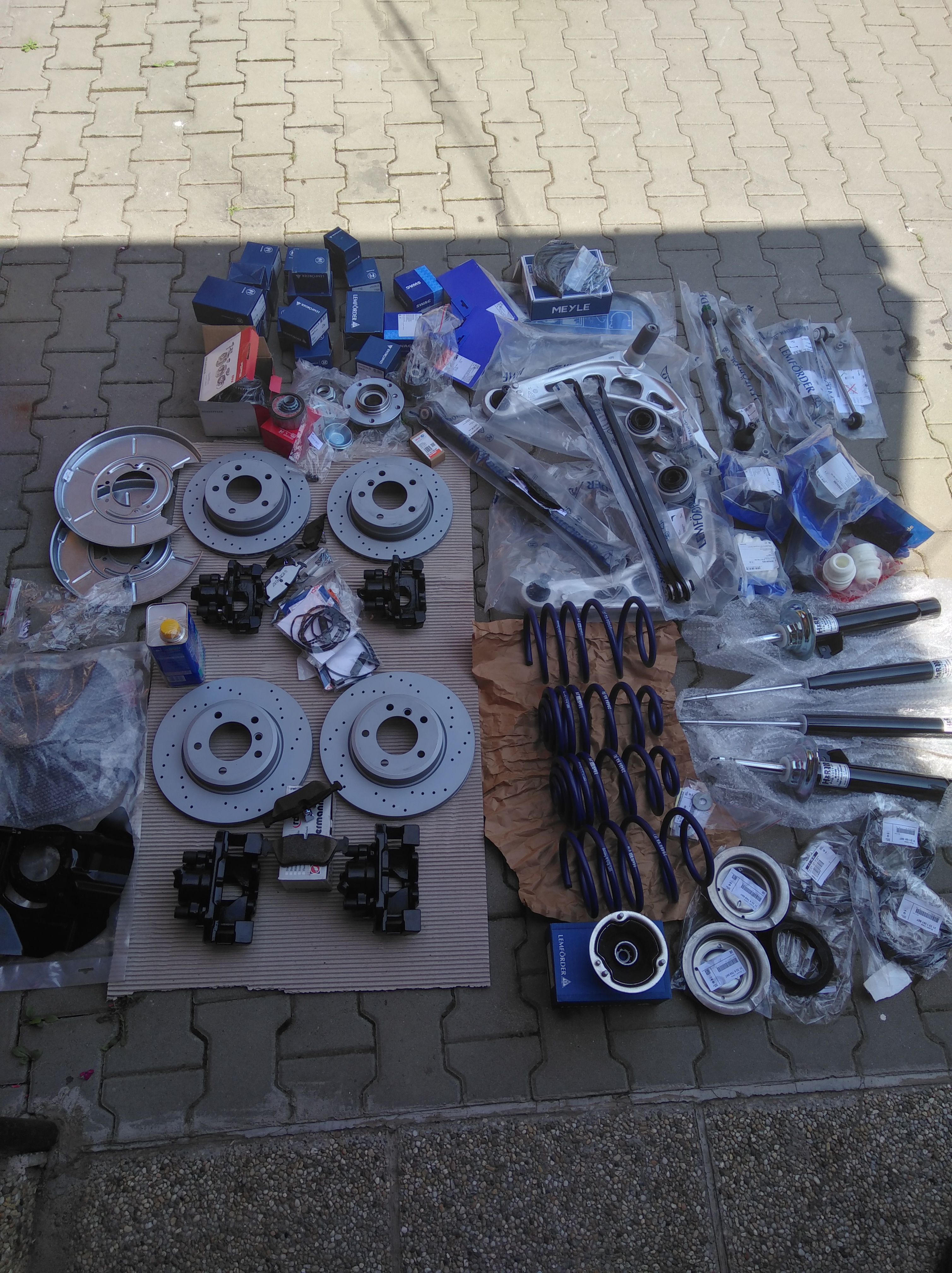 Vpredu nové dorazy swag, prachovky febi, gumené pružné podložky pod pružinou aj nad origo bmw, horný tanier nad pružinou origo bmw, podložka origo bmw, prachová podložka pod uloženie tlmiča origo bmw, uloženie tlmiča lemförder