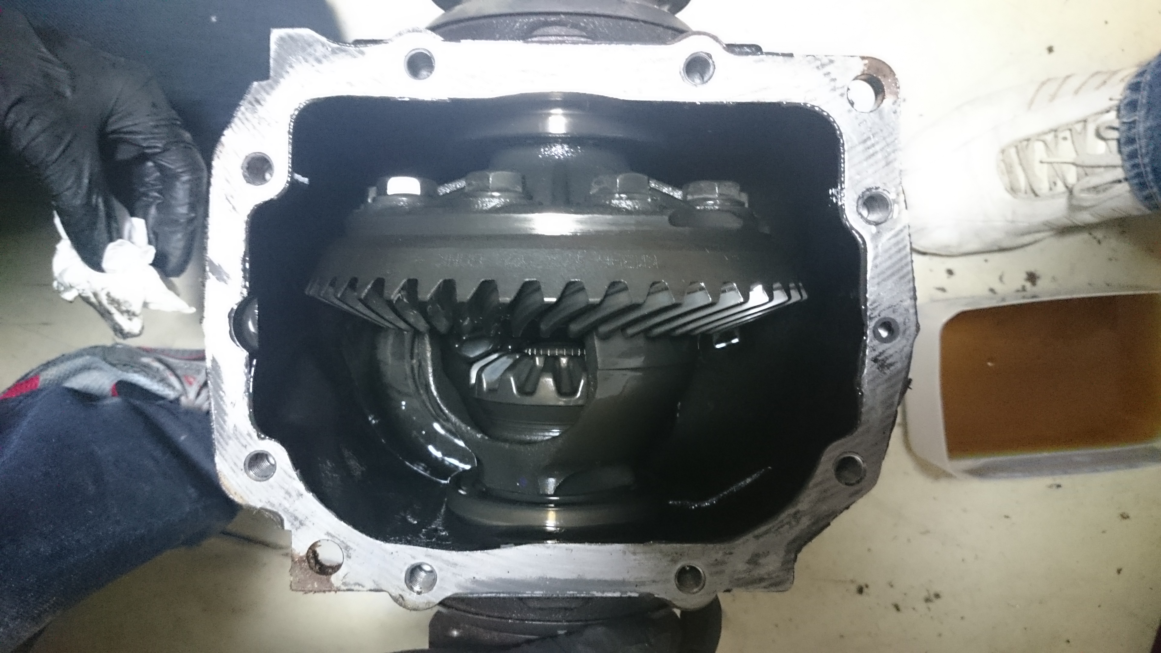 Čo sa preskladania diferenciálu týka, so správnymi nástrojmi je to pomerne jednoduché. Problémom bolo akurát vytiahnutie vymedzovacích sekeriek, na ktoré sme nemali vhodné kliešte ale vynaliezavosť nakoniec zvíťazila. Okrem toho menšie komplikácie predstavovalo zlisovanie krúžkov na ktorých sú ložiská (bearing race) a dotiahnutie kolesa na nový diferenciál s odporúčanými 110 Nm, čo však nakoniec s momentovým kľúčom nebolo až také náročné. Ako je vidno na fotke, vôla je v odporúčanom intervale s hodnotou desať stotín milimetra. Najdôležitejšie na koniec a to magnet na vypúšťací šrób. :D