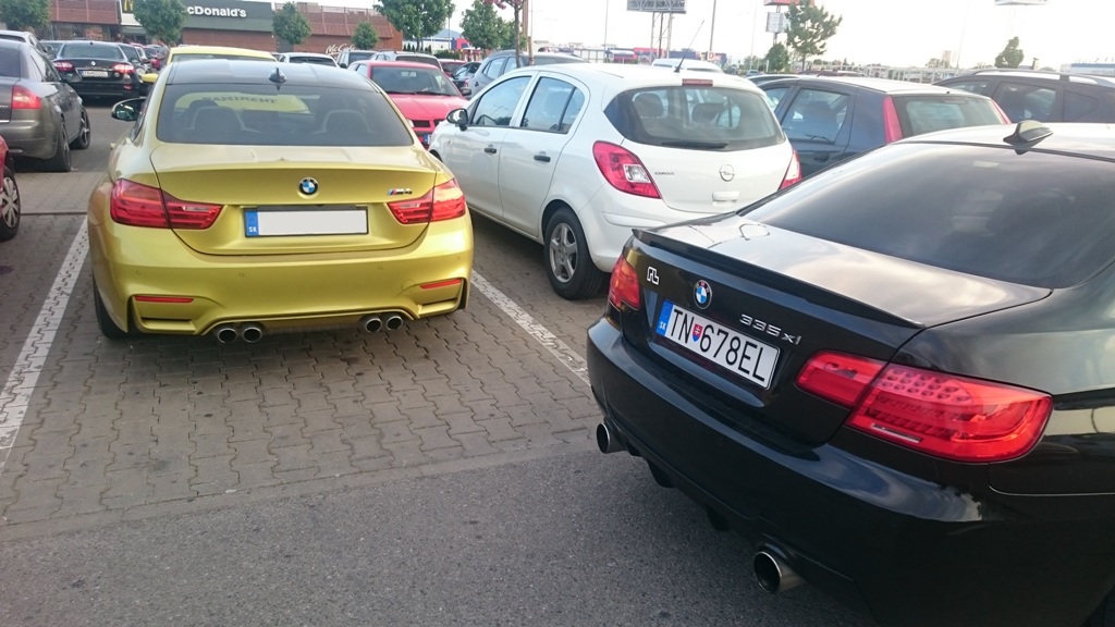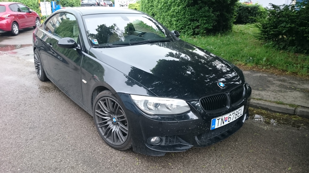 Klasické M3 lipko som vymenil za väčšie Performance krídlo, pretože zadok sa mi zdal trošku nevýrazný. Teraz je to krásne vyvážené. Ak budú niekde za dobrú cenu M3 zrkadlá a M3 prahy ( čo asi nebudú