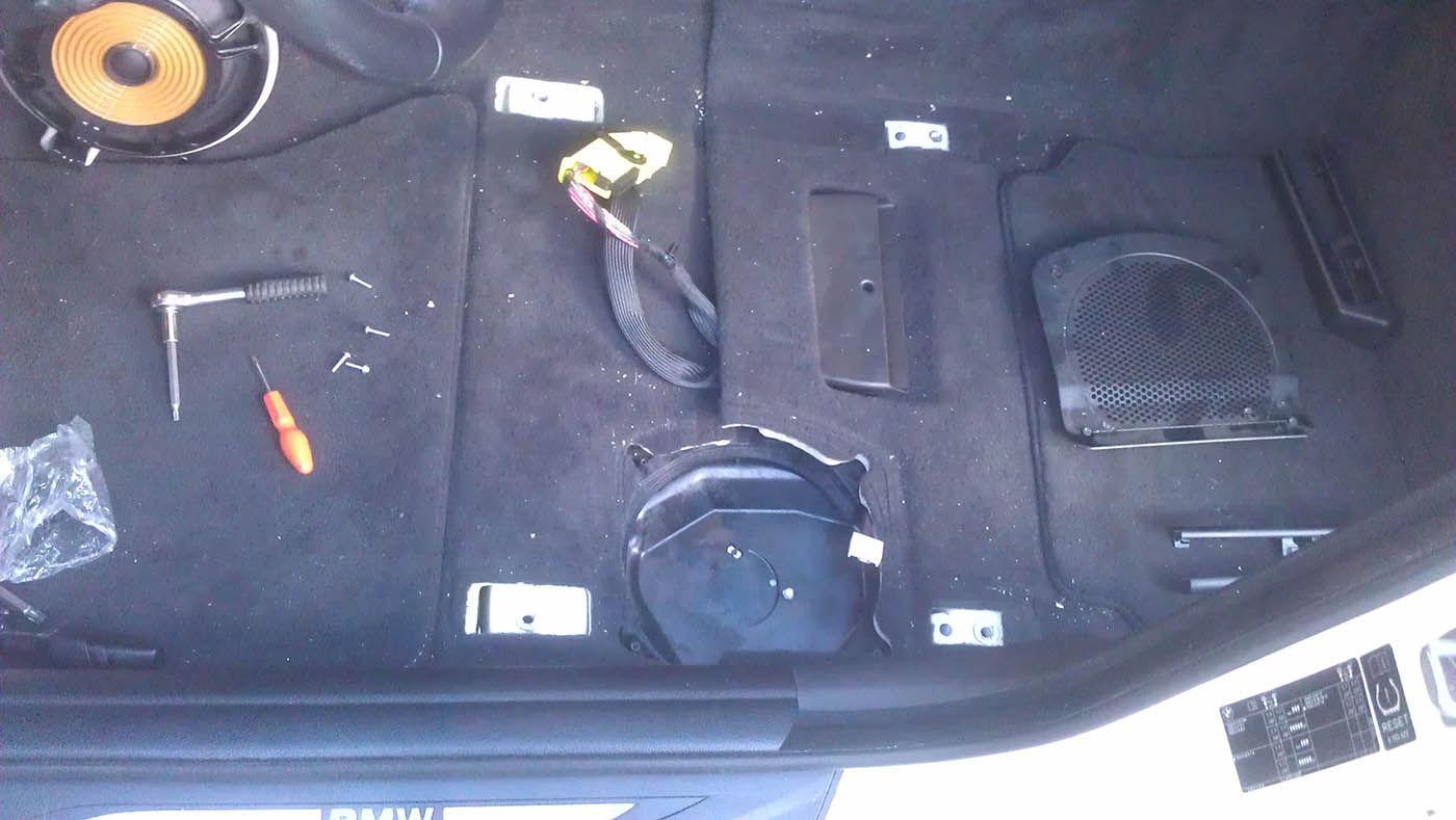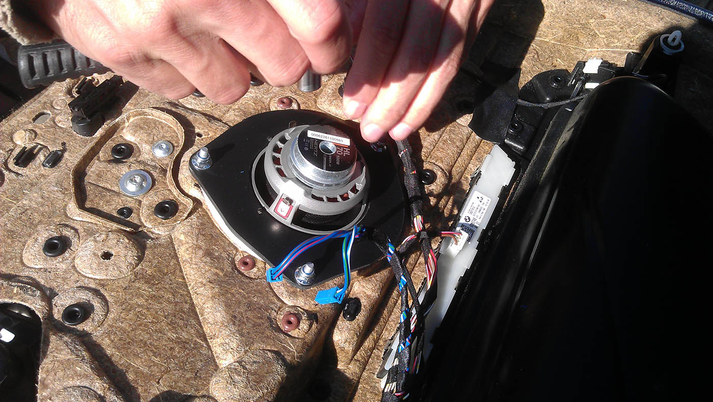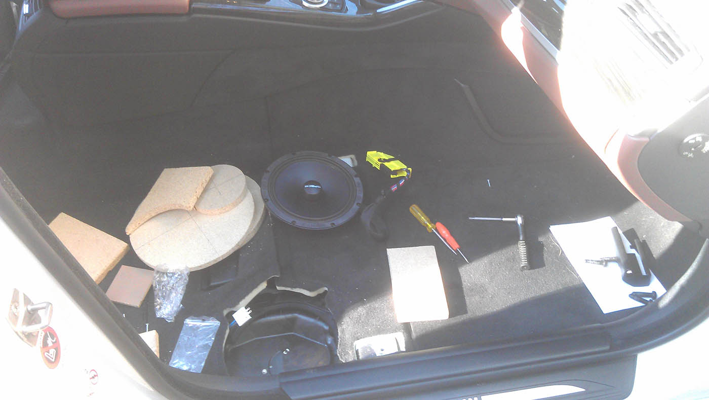 Na stredy sa vyrobila podložka, aby sa dali uhcytiť na miesto pôvodných repro. Na rozdiel od E6x je v F1x dosť malá hĺbka na montáž stredových repro, tak sa použili repro so 7cm priemerom, ktoré majú aj nižšiu montážnu hĺbku.