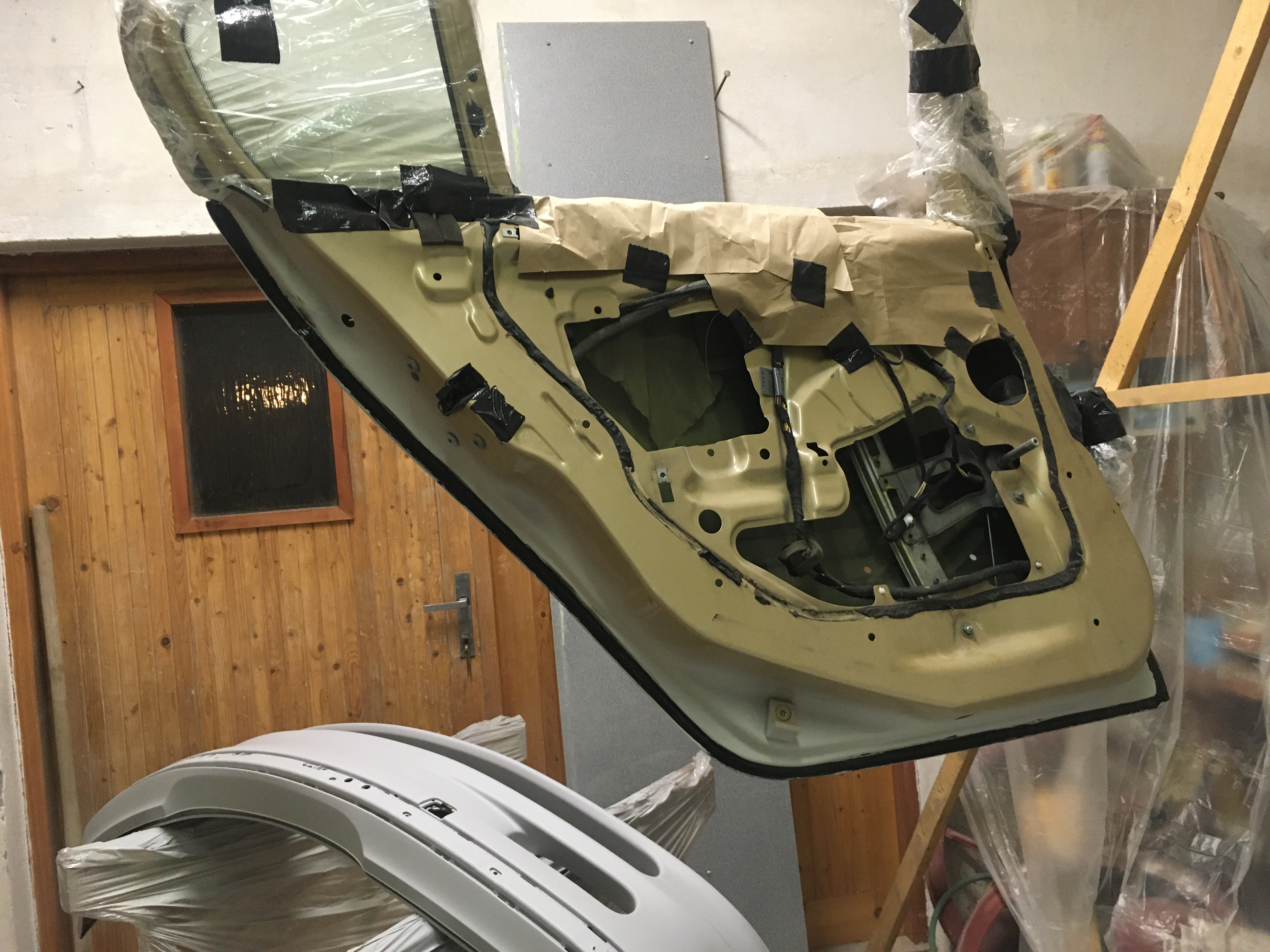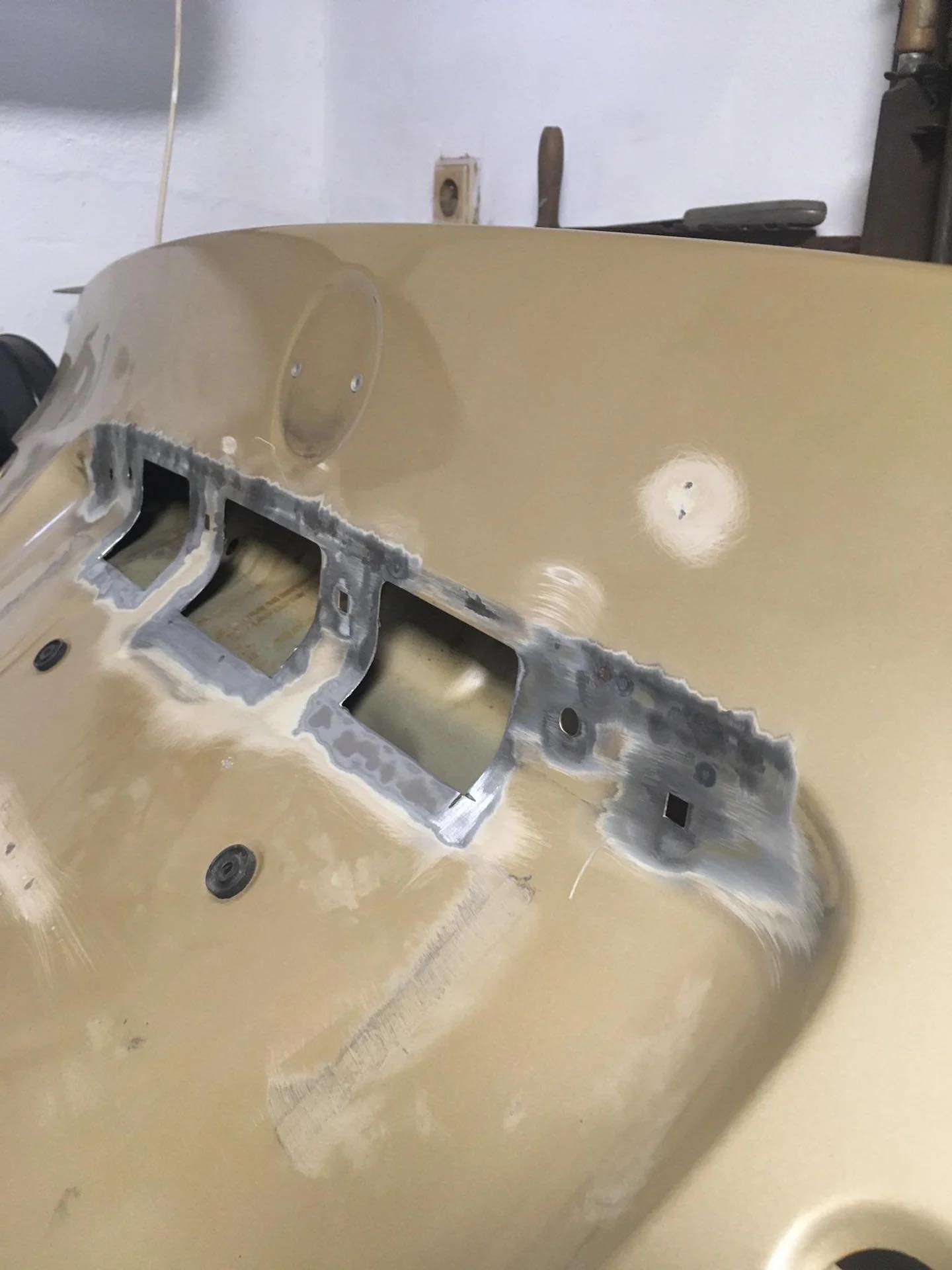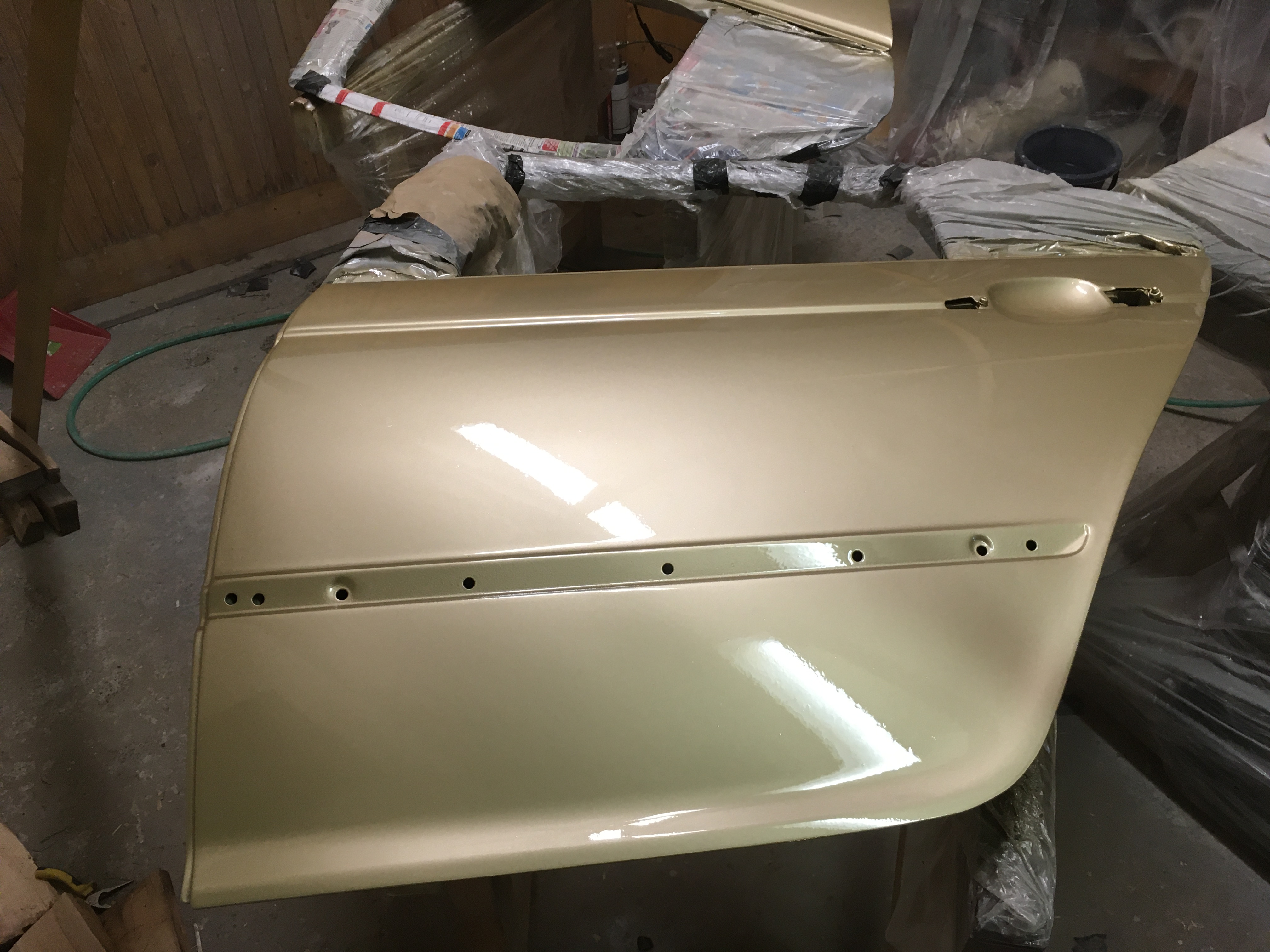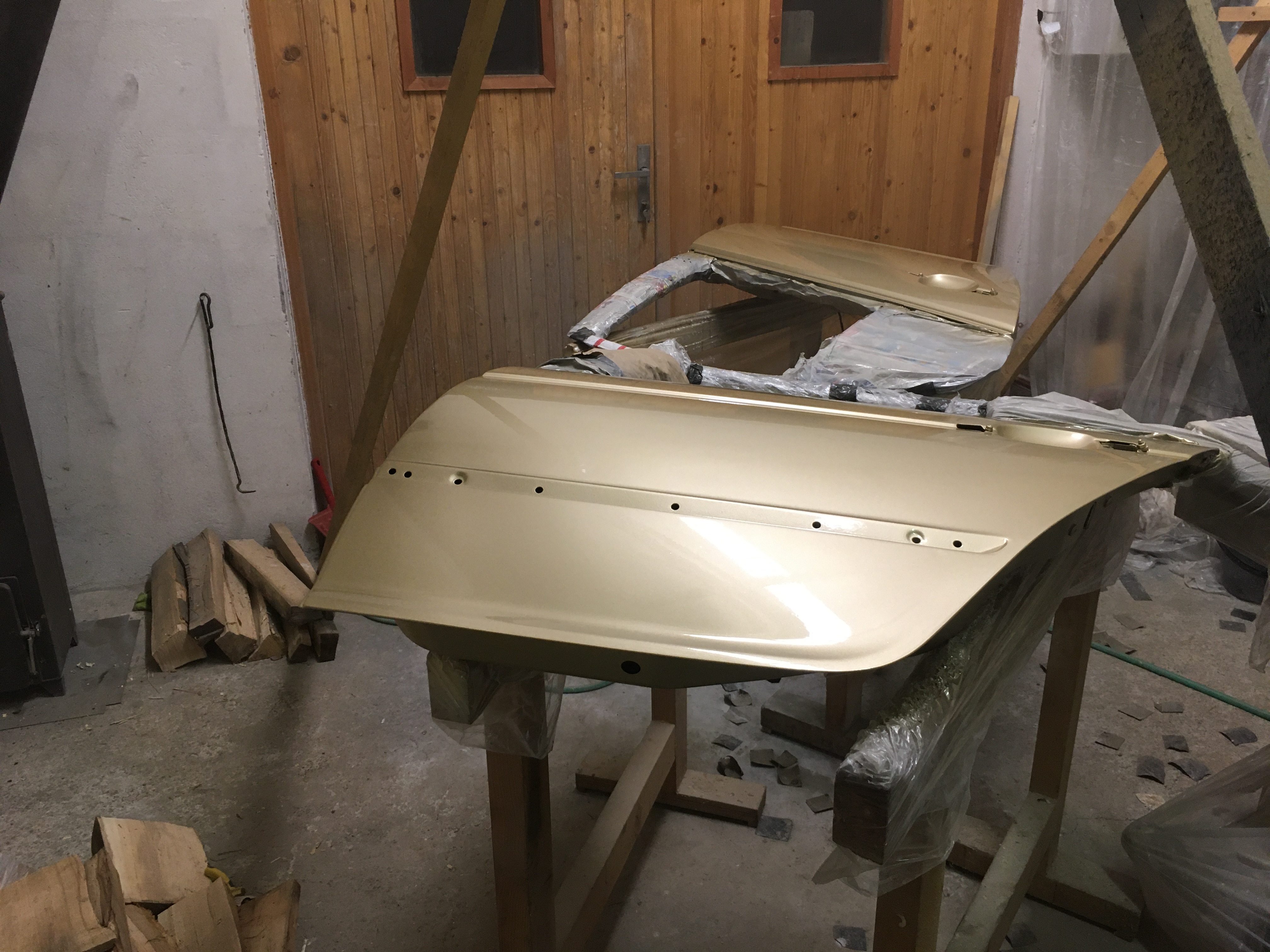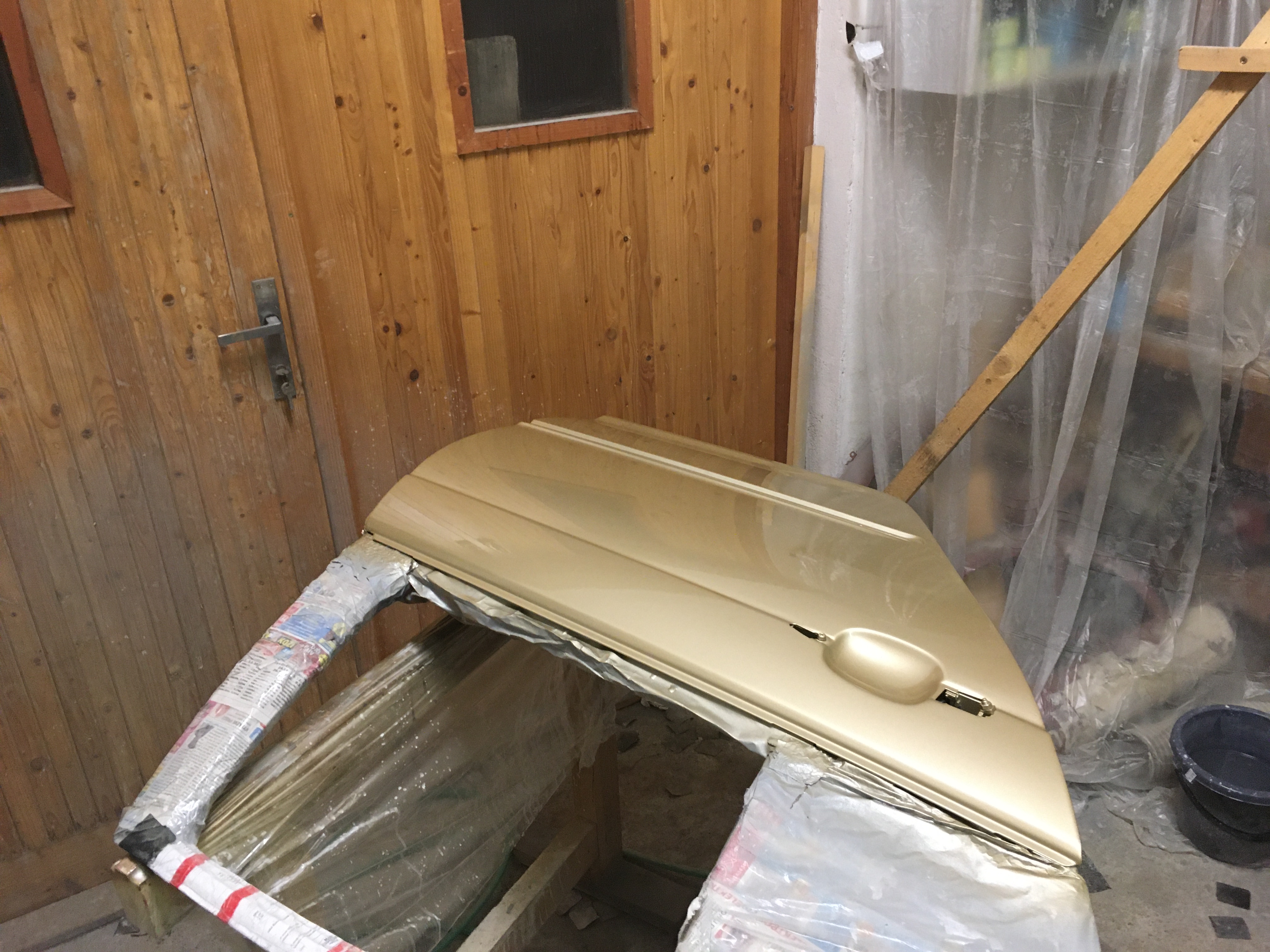Taakže ďalší update prác. Po dokončení prahov auto stálo nejaký čas vonku nedotknuté. Musel som vymyslieť čo ďalej. Myslím tým s čím ďalším začať, keďže roboty je tam ako na kostole. Voľba padla na lakovanie. Tu som sa rozhodol pokračovať v tradícii urob si všetko sám, a tak som sa do toho pustil. Bola to pre mňa asi najhoršia robota, nakoľko práca s tmelom a všetky tieto veci okolo toho naozaj nie sú mojou šalkou kávy. Nejaké skúsenosti s tým už mám, keďže som si niekoľkokrát robil komplet prípravu pod lak na mojich motorkách (základ, tmelenie, plnič, finalne brusenie) lenže konečnú fázu vždy zavŕšil lakýrnik. Tentokrát tomu tak nebolo. Chcel som získať nové skúsenosti, a tak som začal. Auto som lakoval po častiach ako sa dalo. Robil som to totiž v otcovej stolárskej dielni, ktorú som predtým vyčistil. Je to jediné miesto kde je piecka a tak nebol problém striekať pri 25 stupňoch zatiaľčo vonku bolo mínus 5. Tu by som sa chcel ale pozastaviť. Mojou snahou bolo docieliť to, že auto bude v jednom odtieni zlatej metalízy. Profesionálny výsledok som nečakal (ako by som aj mohol), no zas nie je to úplná “garážova” lakovačka sprejom z Obi. Pravdupovediac som sa pri tomto procese naozaj veľa naučil. Keď sa pustím niekedy do druhého auta, tak už budem presne vedieť na čo si dávať pozor. V tomto prípade by mi k naozaj top výsledku pomohlo len menej prašné prostredie (máme, nová dielňa, no je tam zima) a dať si pozor pri brúsení plniču, nakoľko pod určitým uhlom niekde vidno stopy po brúsení, no nie je to nič strašné. Hold…podcenil som schopnosť svetlej metalízy vyzdvihnúť aj sebemenšiu nedokonalosť.