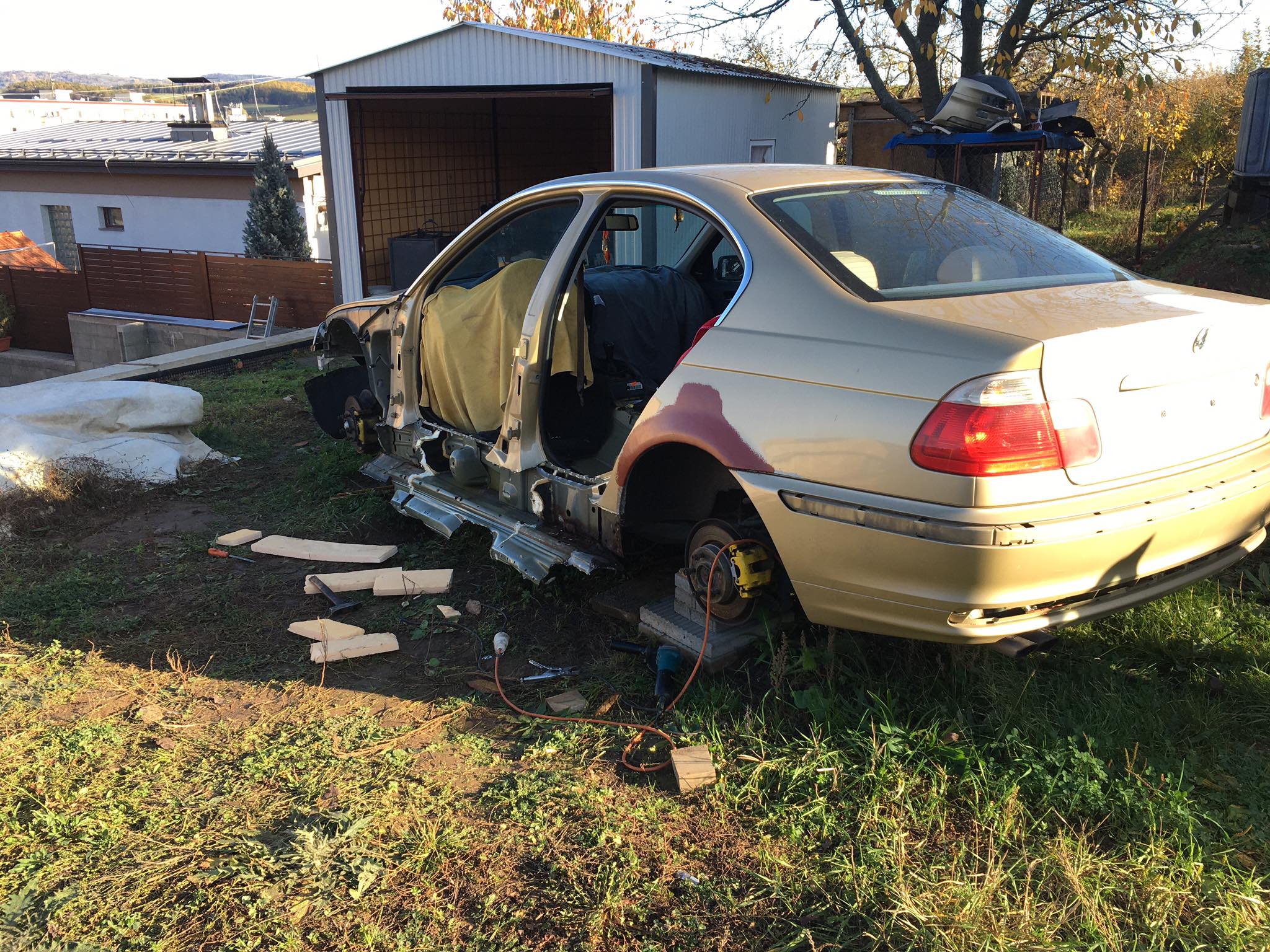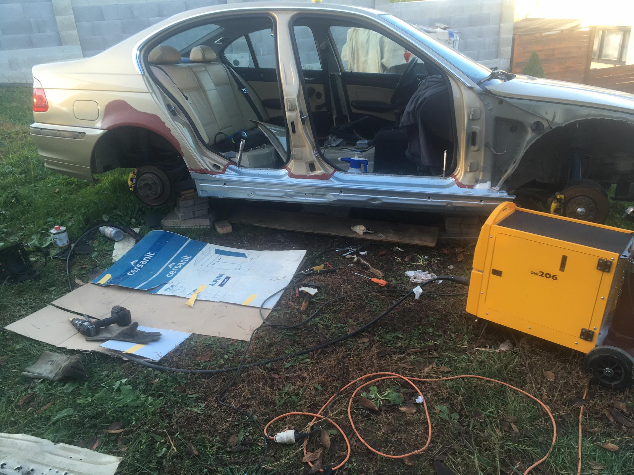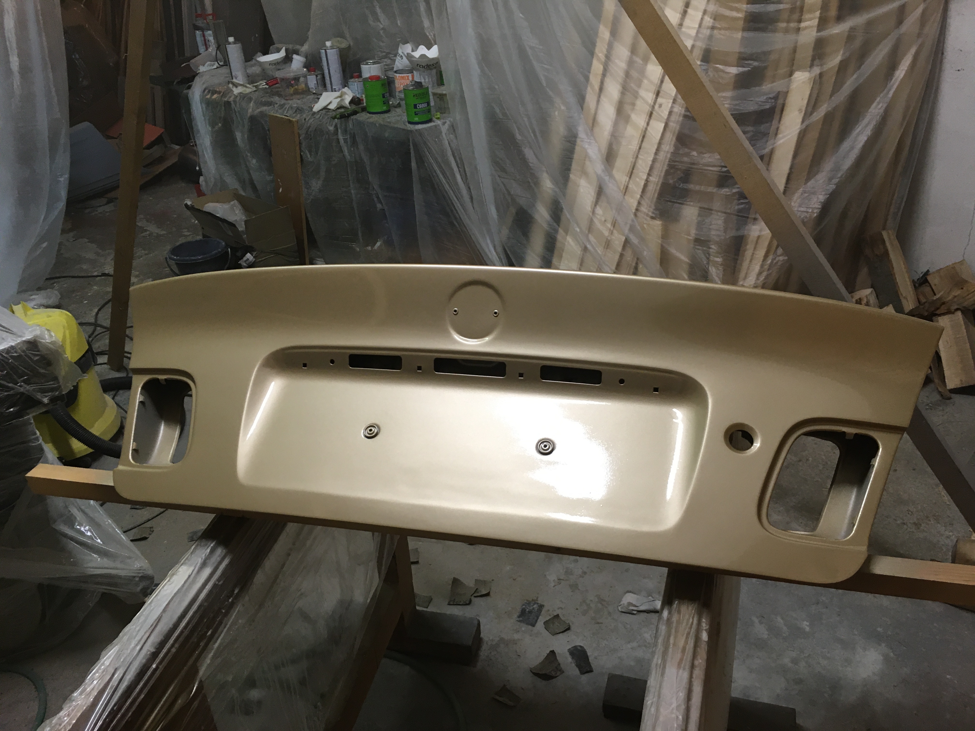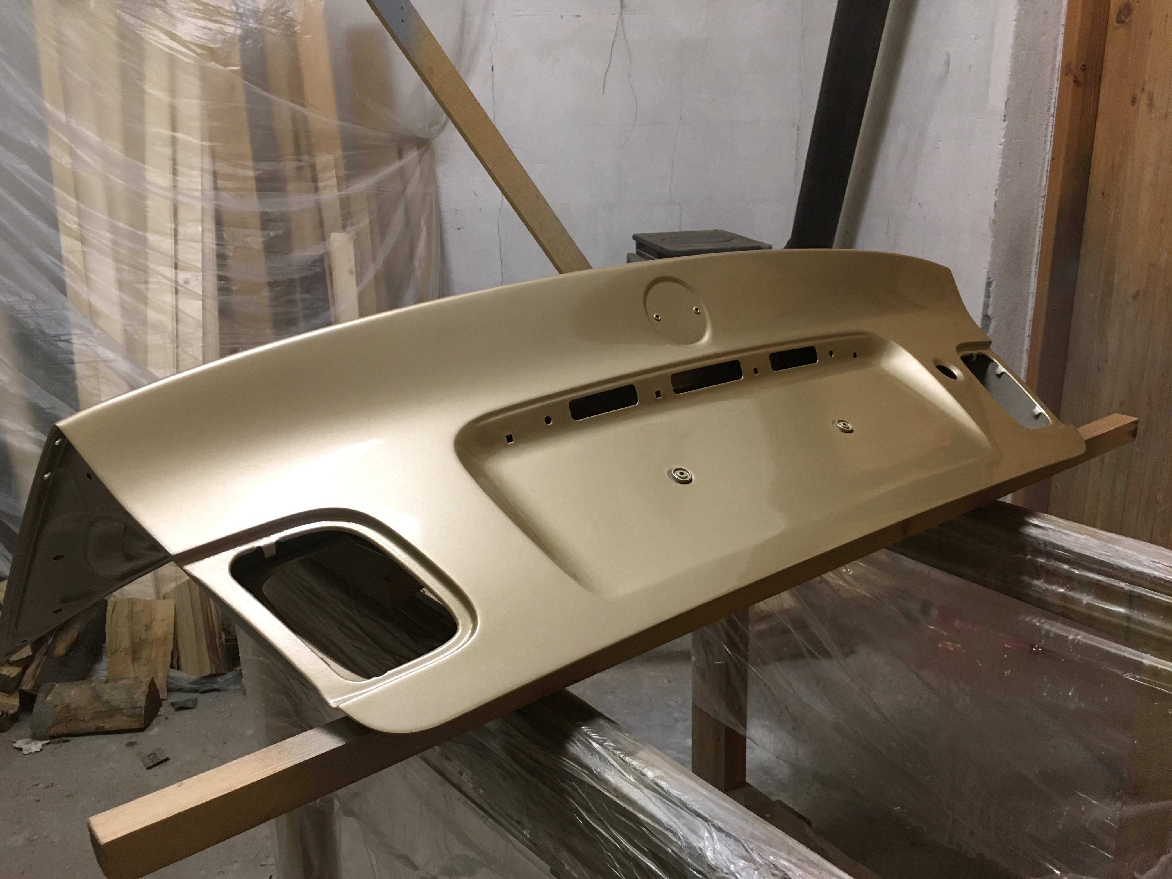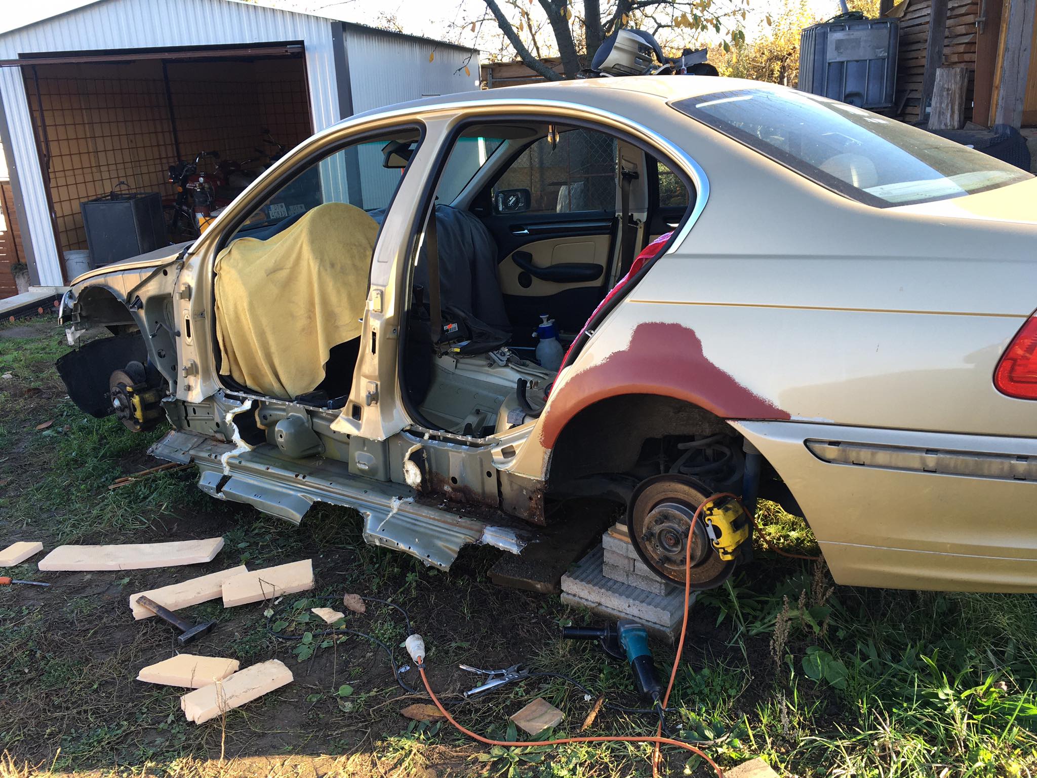 Taakže ďalší update prác. Po dokončení prahov auto stálo nejaký čas vonku nedotknuté. Musel som vymyslieť čo ďalej. Myslím tým s čím ďalším začať, keďže roboty je tam ako na kostole. Voľba padla na lakovanie. Tu som sa rozhodol pokračovať v tradícii urob si všetko sám, a tak som sa do toho pustil. Bola to pre mňa asi najhoršia robota, nakoľko práca s tmelom a všetky tieto veci okolo toho naozaj nie sú mojou šalkou kávy. Nejaké skúsenosti s tým už mám, keďže som si niekoľkokrát robil komplet prípravu pod lak na mojich motorkách (základ, tmelenie, plnič, finalne brusenie) lenže konečnú fázu vždy zavŕšil lakýrnik. Tentokrát tomu tak nebolo. Chcel som získať nové skúsenosti, a tak som začal. Auto som lakoval po častiach ako sa dalo. Robil som to totiž v otcovej stolárskej dielni, ktorú som predtým vyčistil. Je to jediné miesto kde je piecka a tak nebol problém striekať pri 25 stupňoch zatiaľčo vonku bolo mínus 5. Tu by som sa chcel ale pozastaviť. Mojou snahou bolo docieliť to, že auto bude v jednom odtieni zlatej metalízy. Profesionálny výsledok som nečakal (ako by som aj mohol), no zas nie je to úplná “garážova” lakovačka sprejom z Obi. Pravdupovediac som sa pri tomto procese naozaj veľa naučil. Keď sa pustím niekedy do druhého auta, tak už budem presne vedieť na čo si dávať pozor. V tomto prípade by mi k naozaj top výsledku pomohlo len menej prašné prostredie (máme, nová dielňa, no je tam zima) a dať si pozor pri brúsení plniču, nakoľko pod určitým uhlom niekde vidno stopy po brúsení, no nie je to nič strašné. Hold…podcenil som schopnosť svetlej metalízy vyzdvihnúť aj sebemenšiu nedokonalosť.