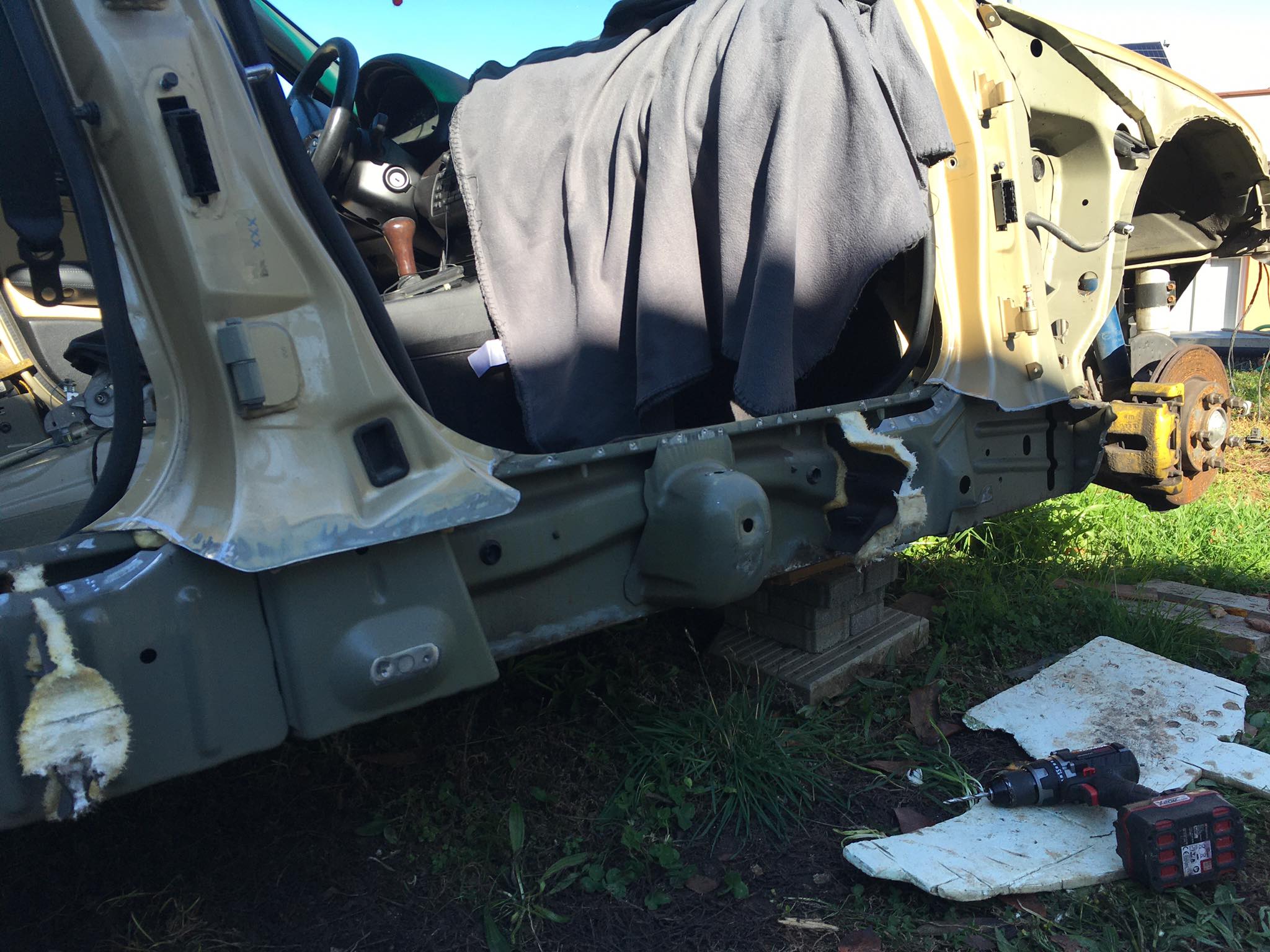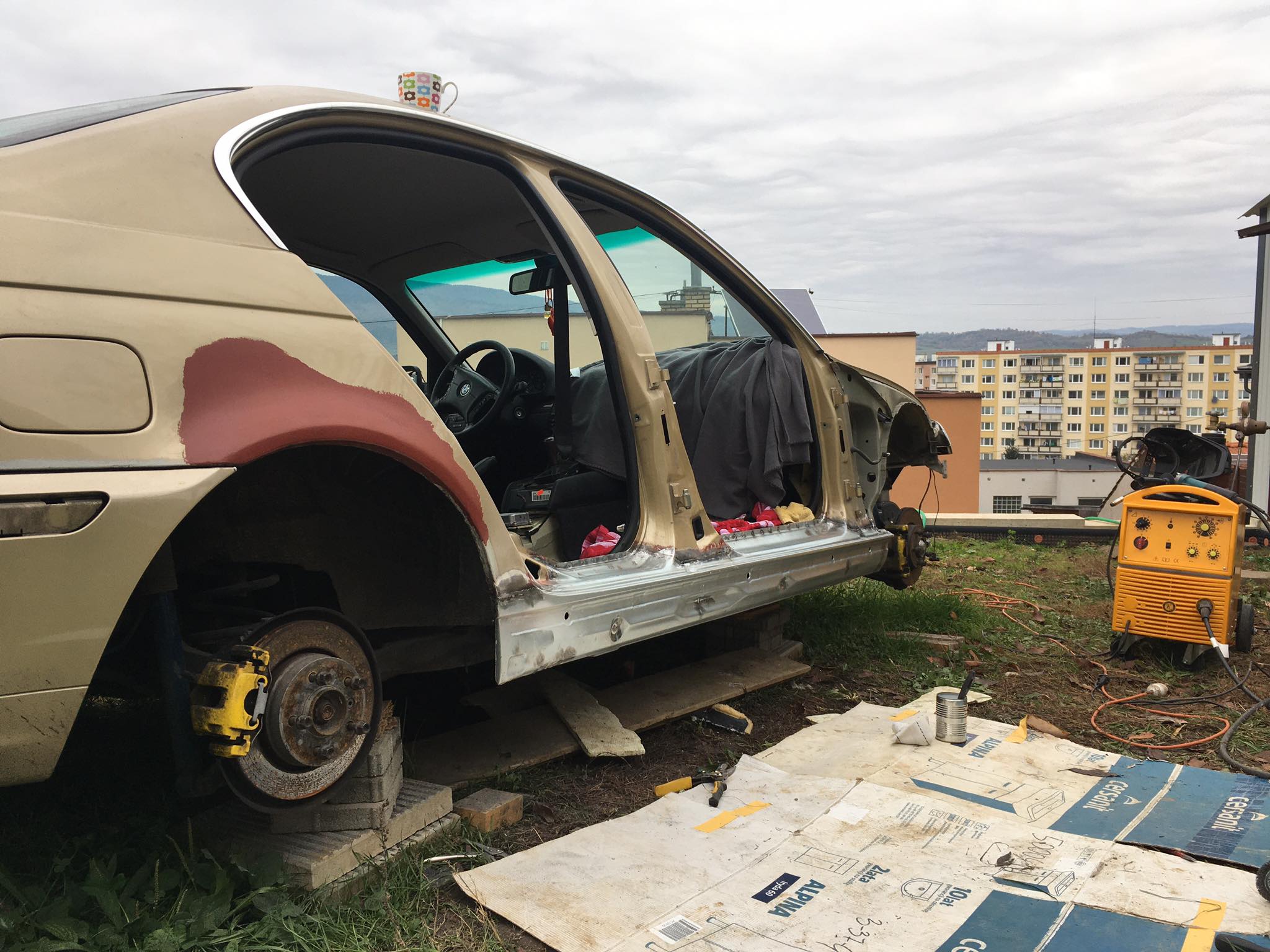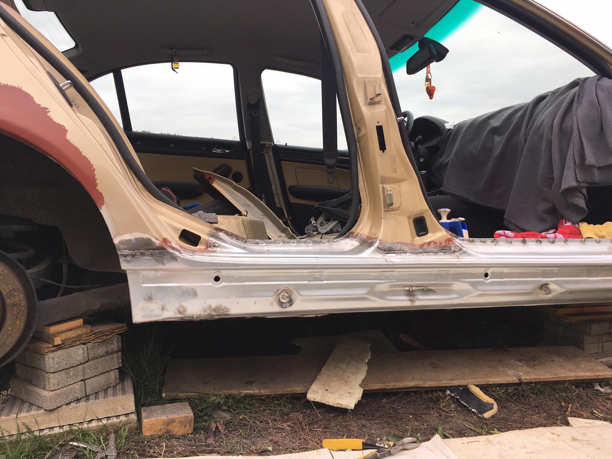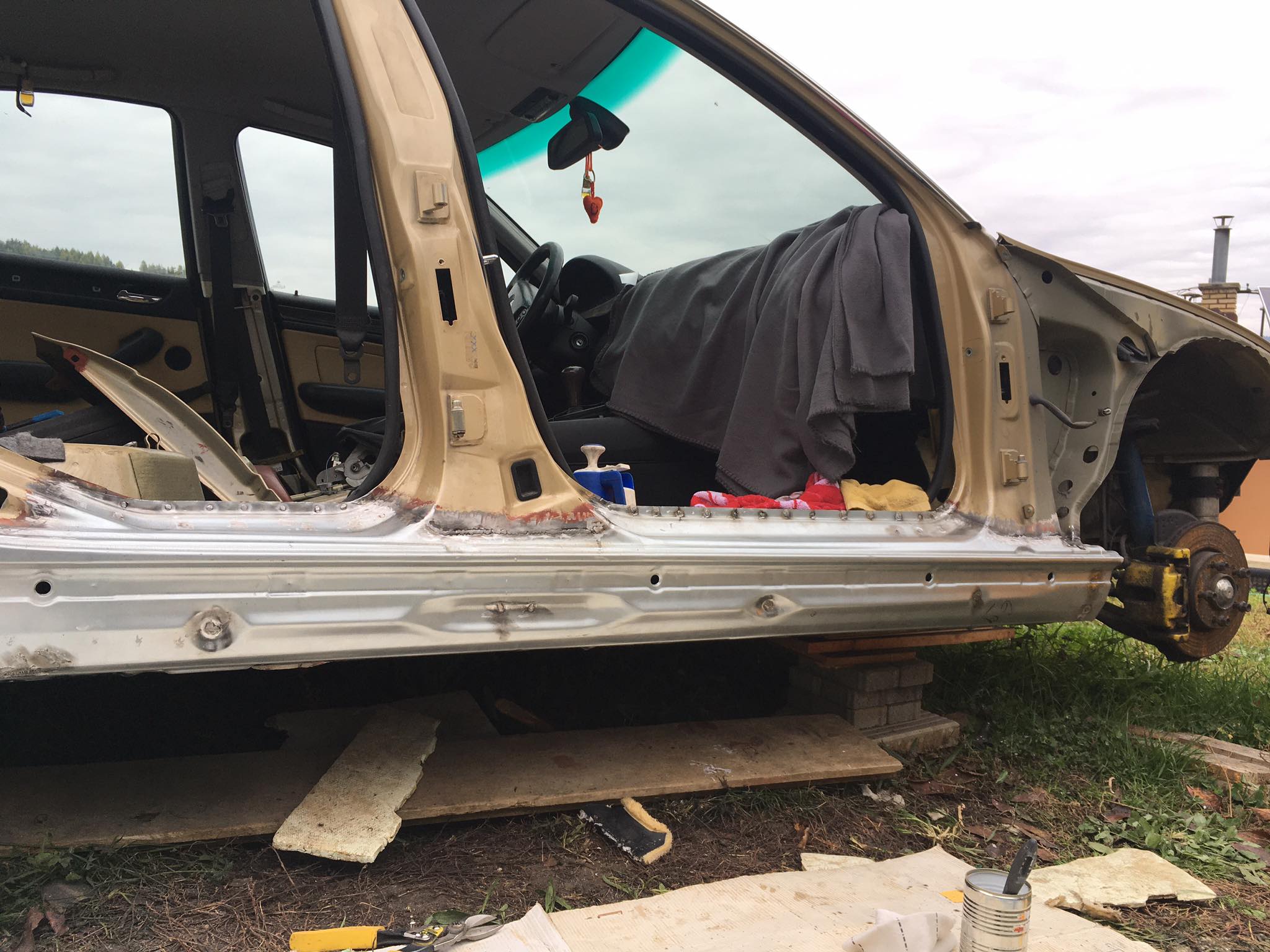 Pridávam aj foto, čo som stihol porobiť v priebehu. Auto teraz vypadá ako z cirkusu, no na pekný vzhľad si bude musieť počkať. Potrebujem ho už ako soľ. O nejaký týždeň - dva idem na STK, a tak musí byť všetko pripravené. Dokončujem detaily a zháňam potrebné diely ako blázon, napríklad dočasné sedačky, keďže moje som dal opraviť. Ale teším sa, že po pol roku mám zas pojazdné auto a je porobené, bez hrdzavých prahov :)