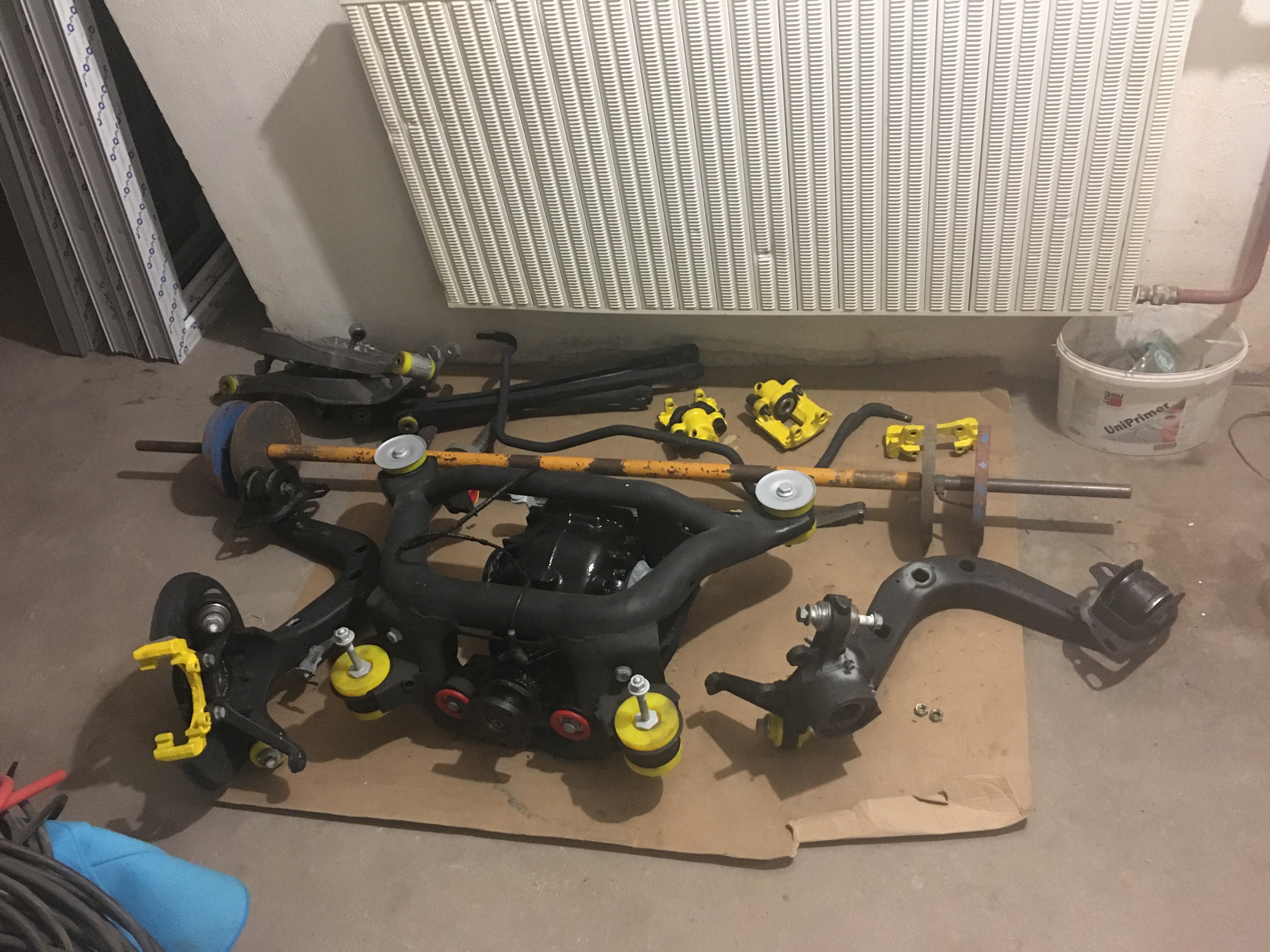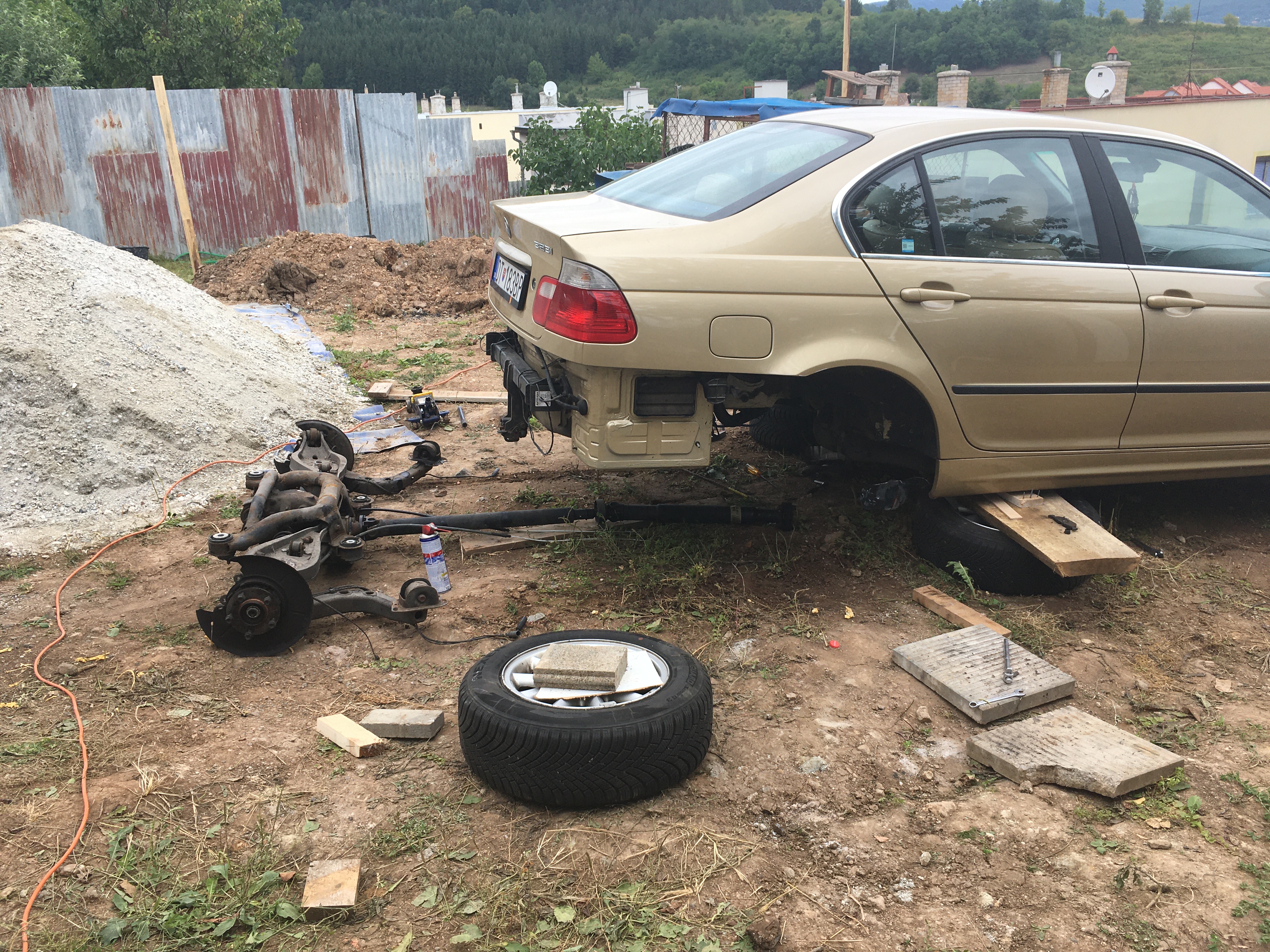 No a konečne nastal čas na zadnú časť auta. Zadnú nápravu som kupil hned po kúpe auta a postupne som ju daval dohromady, aby som potom veeeeeeľmi zjednodušene povedané len vymenil "kus za kus". Toto sa mi aj podarilo a nakoniec som disponoval komplet zadnou nápravou nafarbenou, so strongflexami, nové ložiská a čepy, spevnil som centrálny zdvíhací bod, nové brzdy komplet zadok aj s podkovami ručnej, atď... Nezostalo len pri tom. Už od začiatku som mal v úmysle napchať tam kratší koncový prevodový pomer, rozumej komplet diferenciál s kratším pomerom. Zohnal som 3.38:1 z 2.2ky M54 manuál - stačilo len vyčistiť, nová náplň, natrieť a prehodiť do neho moje staré unášače na poloosy, nakoľko 2.2ka má unášače malé zo 4 valcov a nenapojil by som moje poloosy. Pôvodný pomer bol 3.07:1. Jedného dňa začala takmer mesačná prerabka komplet zadnej časti. Robil som to nepravidelne, cez voľný čas. Zdvihnúť zadok, podložiť, rozobrat komplet zadok az na holú kasňu, odmastit a vycistit, obrusit, odhrzdit, navariť 4 zakúpené vystuzovacie pláty na uloženie napravnice o kasňu. V tomto mieste sa chcem pozastaviť. E46 to teda nevyhrala čo sa konštrukcie zadnej nápravy resp. jej ulozenia týka. Ja síce mám ulozenia od výroby patrične vystužené (od 02/2000 ich vystuzovali) a tak sa nekonalo žiadne "katastroficke" vytrhnutie zavitovych vloziek z kasne von, ale pol roka ma doprevadzalo veľmi nepríjemné pukanie plechu pri akceleracii a pusteni plynu, ktoré ale po prerabke zadnej časti úplne zmizlo. Pripisujem to drobnej, a zároveň jedinej praskline na jednom zo zadných uložení napravnice, ktorú som ale patrične odvŕtal a zavaril pred samotným navarenim vystuh. Bolo toho fakt neskutočne veľa a veľa som sa toho pri prerabke naučil. Viac vám asi prezradia fotky. Za zmienku stojí určite aj totálne zhnite brzdové potrubie v zadnej časti, ktoré som nahradil novým. NIE, NIE JE TO MEĎ. Je to meď - niklova zliatina, ktorá ja pevnostne bližšie k tomu oceľovému potrubiu a je na míle vzdialená od toho čisto medeného (moje prsty by vedeli o tom po ohýbaní rozprávať), ktoré bezstarostne predávajú v každých autodieloch. Také by som osobne dal max. na chladničku alebo hydroručku možno? Nervy mi potrénovalo aj výfukové potrubie na spoji potrubie-zvody, ktoré proste niekdy nebolo dolu a sroby na nom sa podobali na vysušené zajačie bobky, než na 6hrany. Keď sa ale chce tak všetko sa dá. Kombinácia malej "fortunky", flexky, srobovaku, malého kladivka a hlavne sade kobaltovych vrtakov na odvrtanie 4 štyftov bola účinná 🙂. Vyfuk samotný je kvalita lebo po vyčistení nylonovou kefou sa ukazalo ze mu nič nie je.