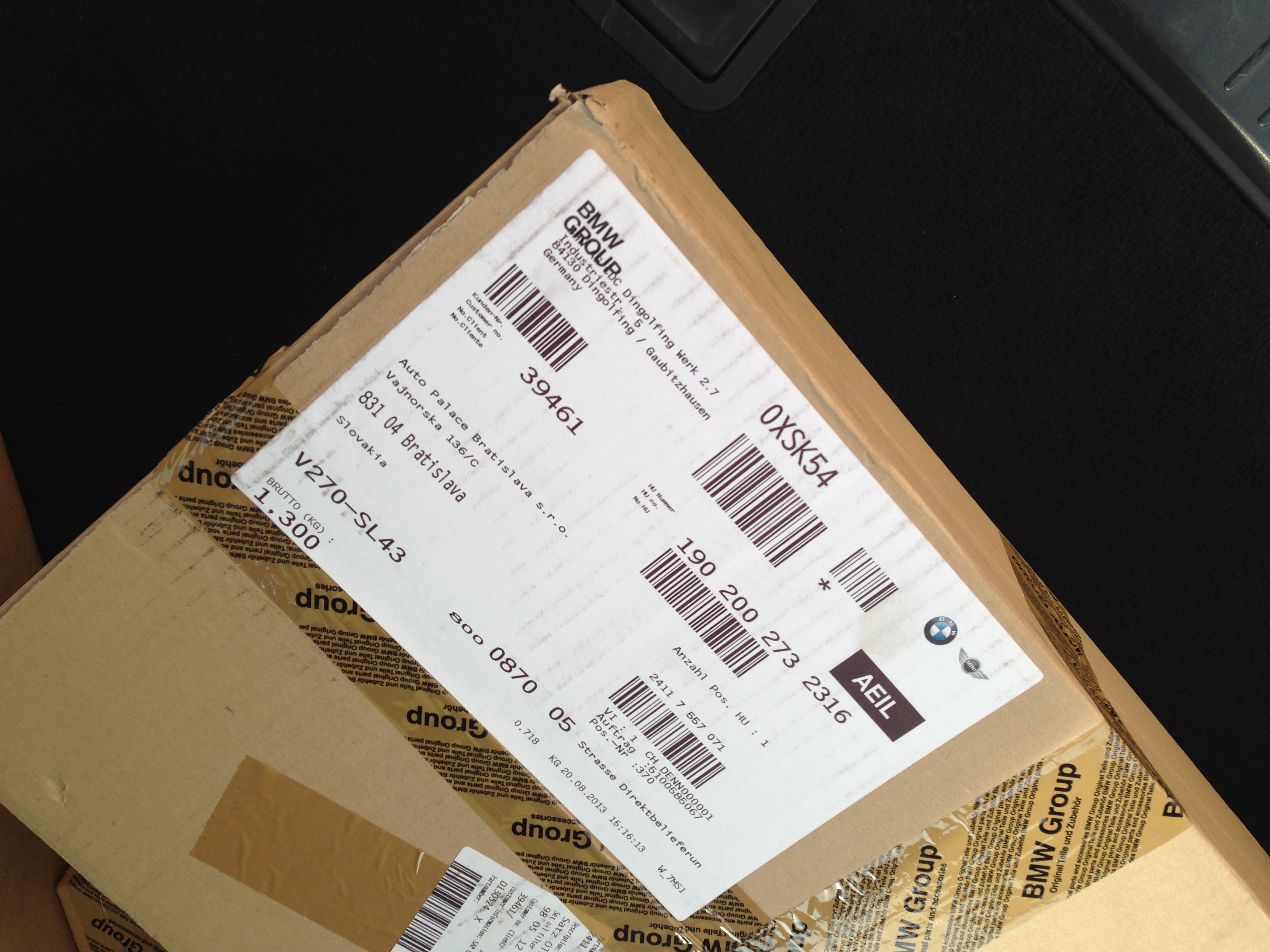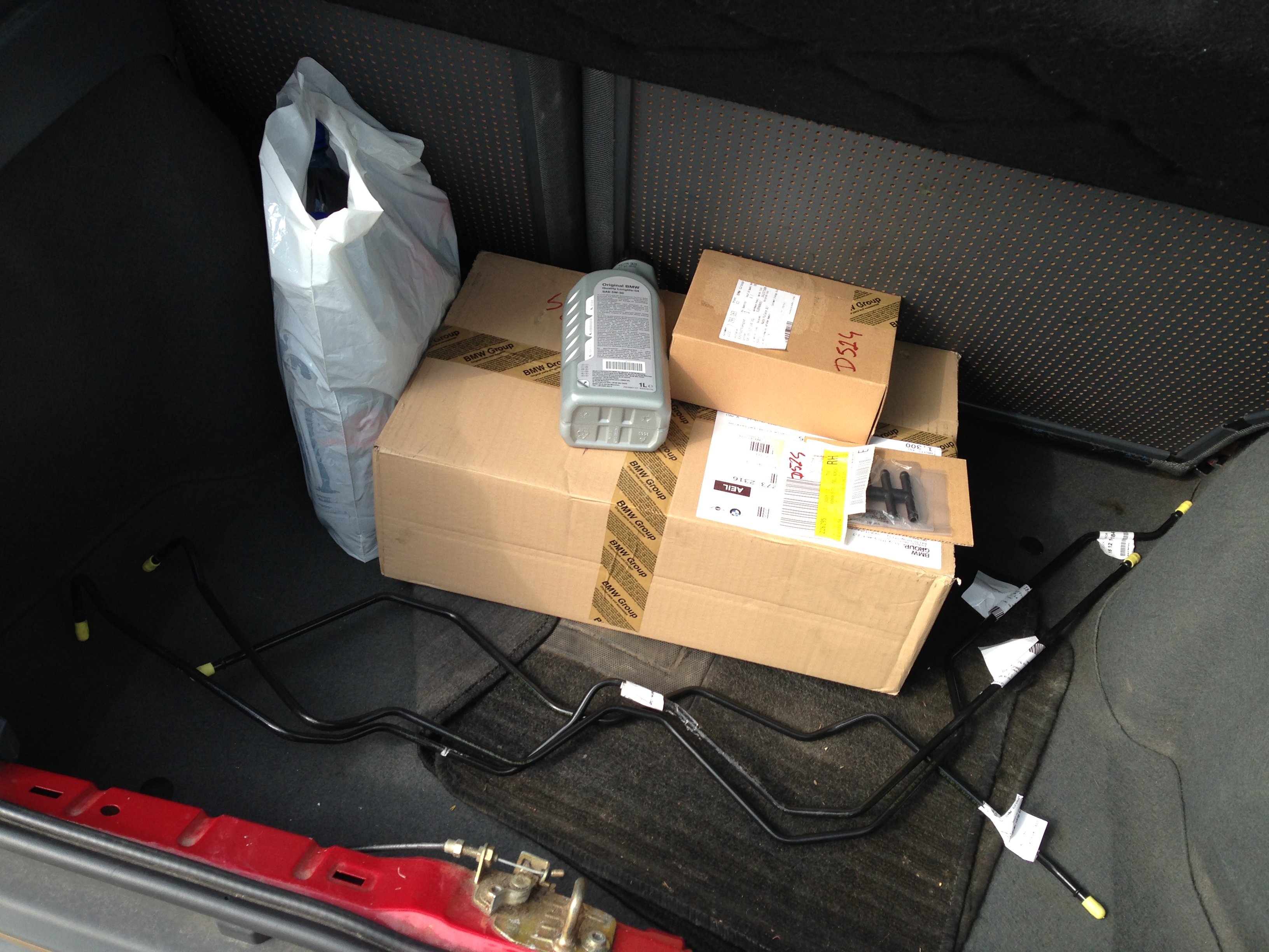 V piatok konečne došli všetky diely z BMW (skúsil som nový Auto Palace na Vajnorskej, ale žiadna sláva, prístup nič moc a ešte aj fľašky na olej aby som si doniesol). Takže máme sadu olejového servisu na automat (filter, olej, tesnenia, skrutky na vaňu), nové palivové čerpadlo, všetko palivové potrubie čo je pod autom, olej do diferenciálu, odvetrávanie kľuky + budeme meniť motorový olej, filtre aj s palivovým a chcem dať spraviť aj zásuvku do kufra. Rád by som bol, aby to do pondelka bolo hotové.