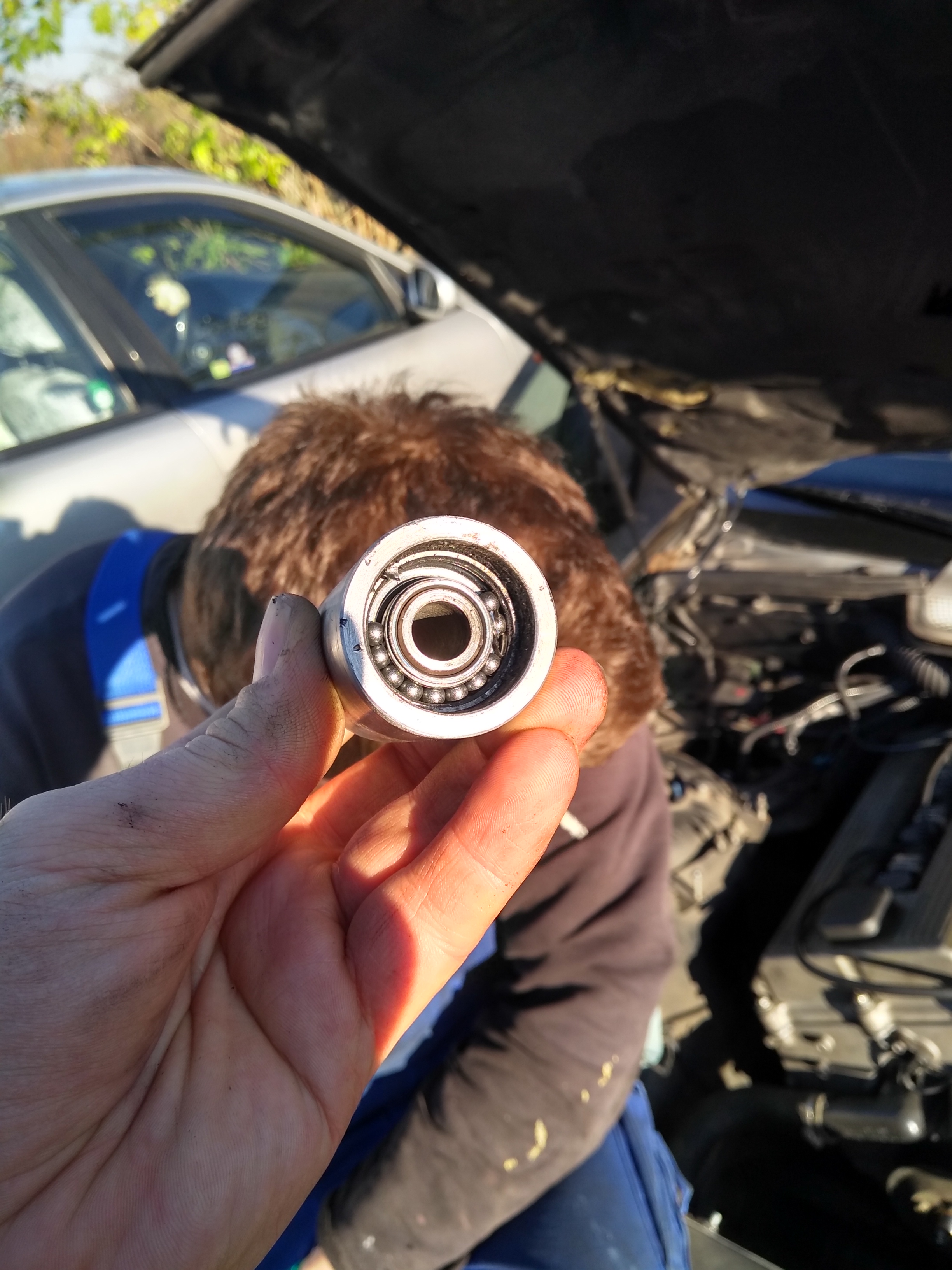 Kladka na prisponovanie remena kvoli alternatoru (vyssie som to riesil) ma totiz maly priemer, cize ma niekolko nasobne vacsie otacky(aj som to ratal ale uz som zabudol) ako zvysok a tak sa jej rozsypaly loziska (vid foto). To aktualne riesim, nasiel som ze loziska s oznacenim C su na vyssie otacky tak to musim znova cele preratat ci to bude stacit. Ked ne budem muset dat vacsiu kladku.