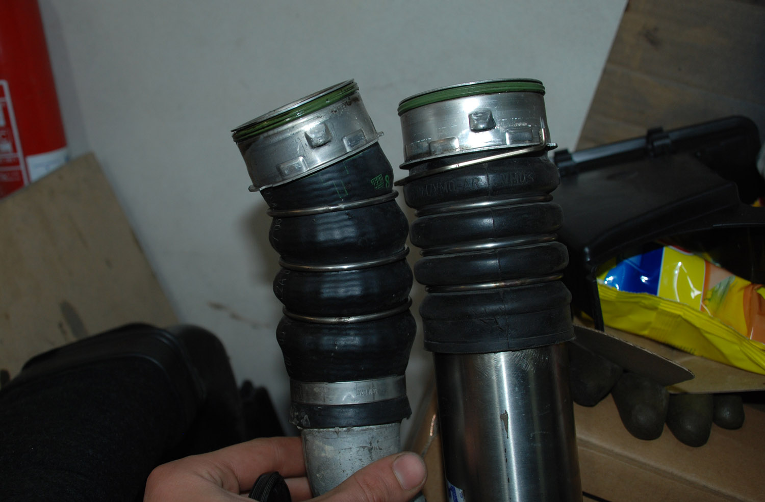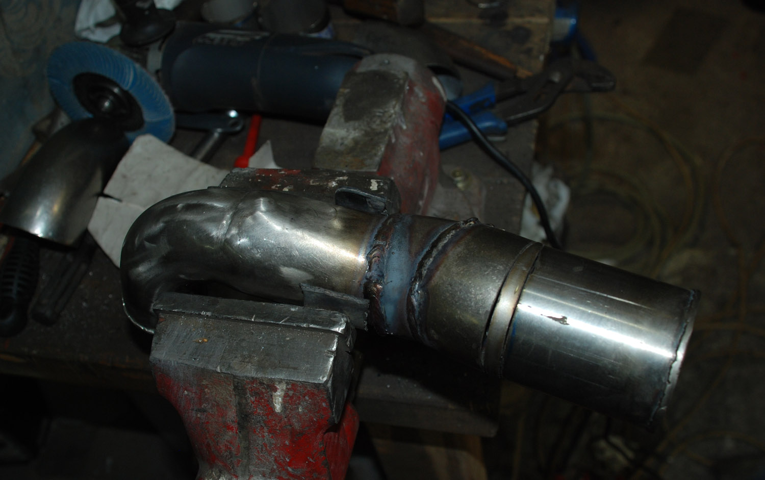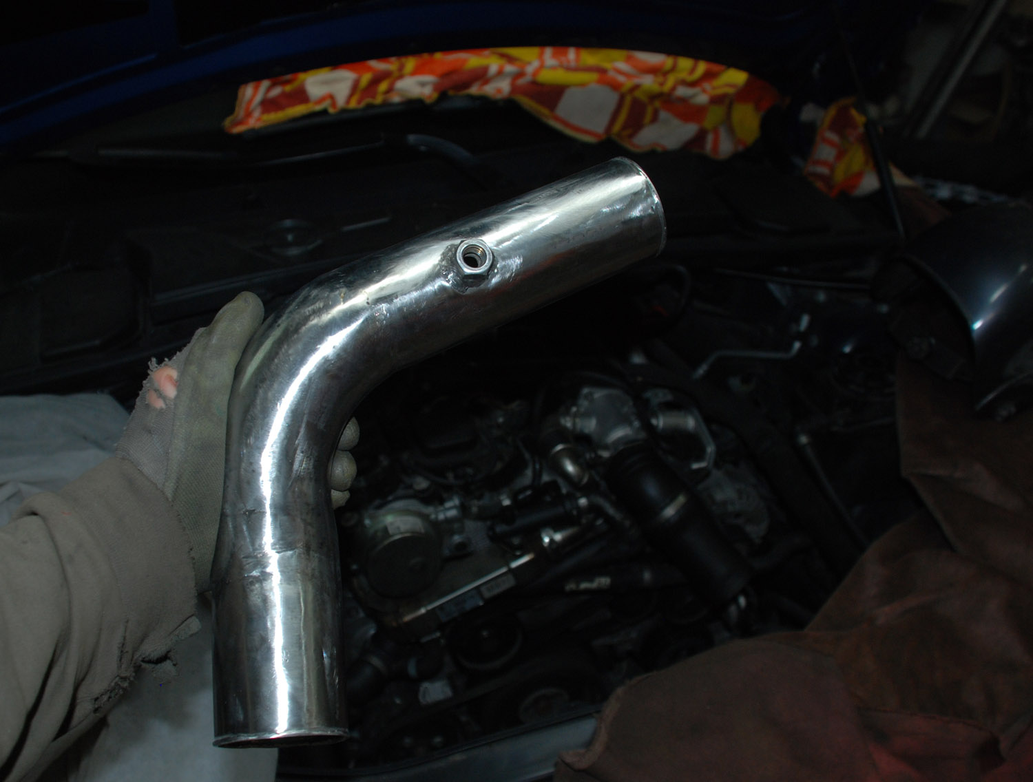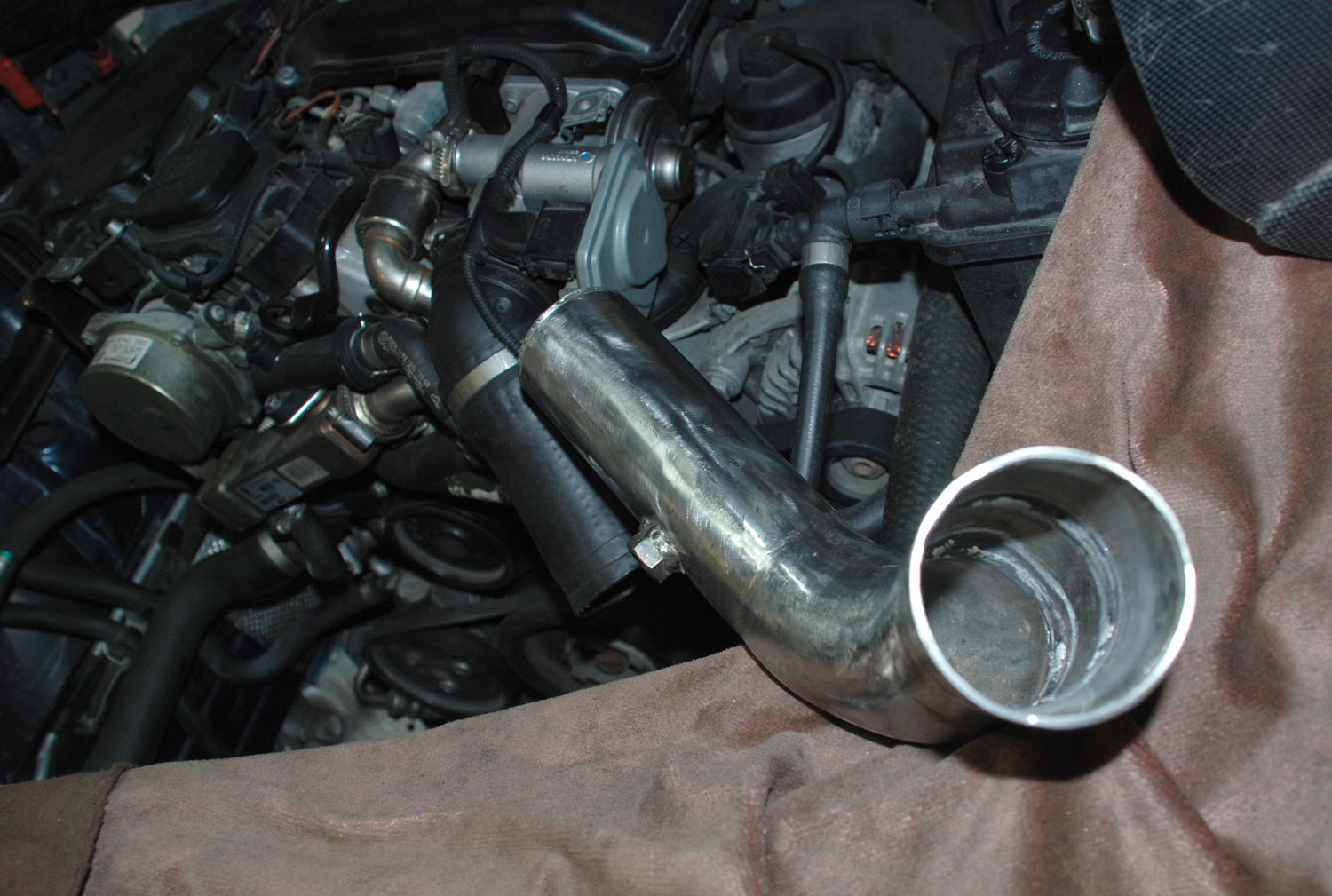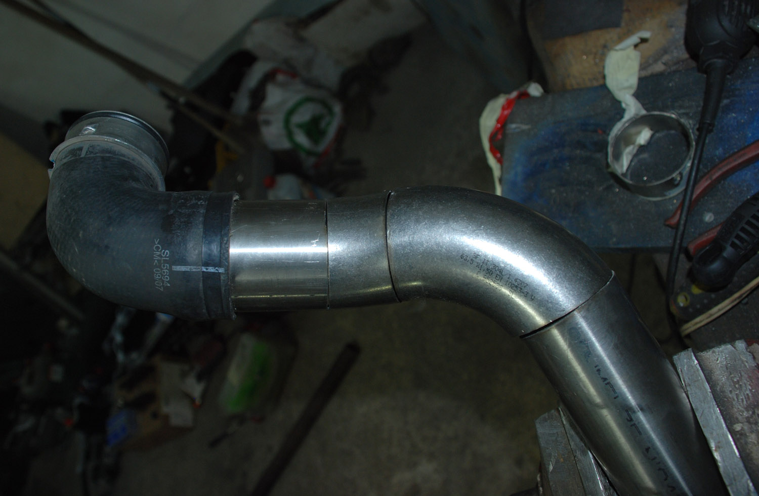 Upravené sání (custom řešení svařené z nerez trubek a kolen) - větší průměry, přizpůsobení na jiný IC