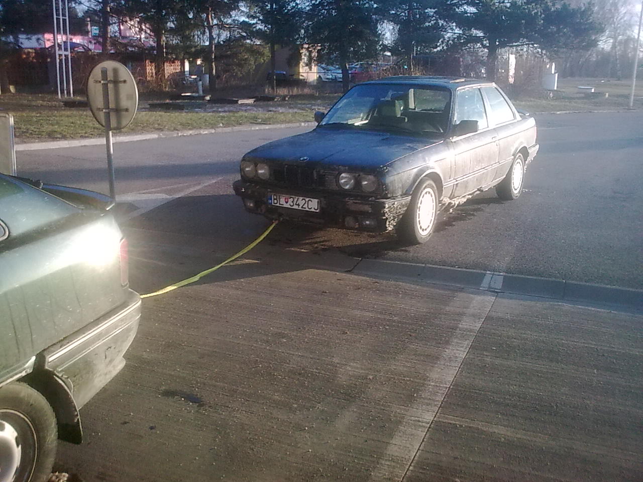15. 1. 2012 - Sadli sme do auta, smer Bratislava cca 2,5 hodiny cesty, po príchode na dohodnuté miesto sme zbadali E30-ku opustenú na parkovisku pred bytovkami, na prvý pohľad všetko Ok, celkom zachovalý lak, par škrabancov. Auto som išiel zobrat s tým že ma defektný motor, ale že sa dá na ňom prejsť. Po pár minútach prišiel majiteľ na bielom chromáku e30 tiež 325i, povedal že na aute už asi neprejdeme lebo že niečo dre v motore tak že ho máme ťahať. Po drobnej obhliadke sme sa dohodli spísali zmluvu, a išlo sa ťahať. Chalan povedal že nemáme ťahať za ťažné oko pre istotu lebo že môže byť hnilé, tak sme to zapli o nosník, povedal že on to tak ťahal. Podali sme si ruky a vyrazili, kúsok za Bratislavou som sa pozrel do speťaku a všimol som si že niečo nieje v poriadku, tak sme zastali na krajnici, zistili sme že, lano je takmer pretrhnuté že sa rezalo na nárazniku (bolo zapnuté cez dieru na náduch) a navyše sme si všimli že sme ohli nosník ktorý bol hnilý. Zapli sme to teda ako sa ma, za ťažne oko, po prejdení cca 5tich metrov, sme za sebou tahali iba naraznik s výstuhov a ťažnym okom a tricka stála na mieste. Takže sme vytrhli tažne oko, no proste štastný den