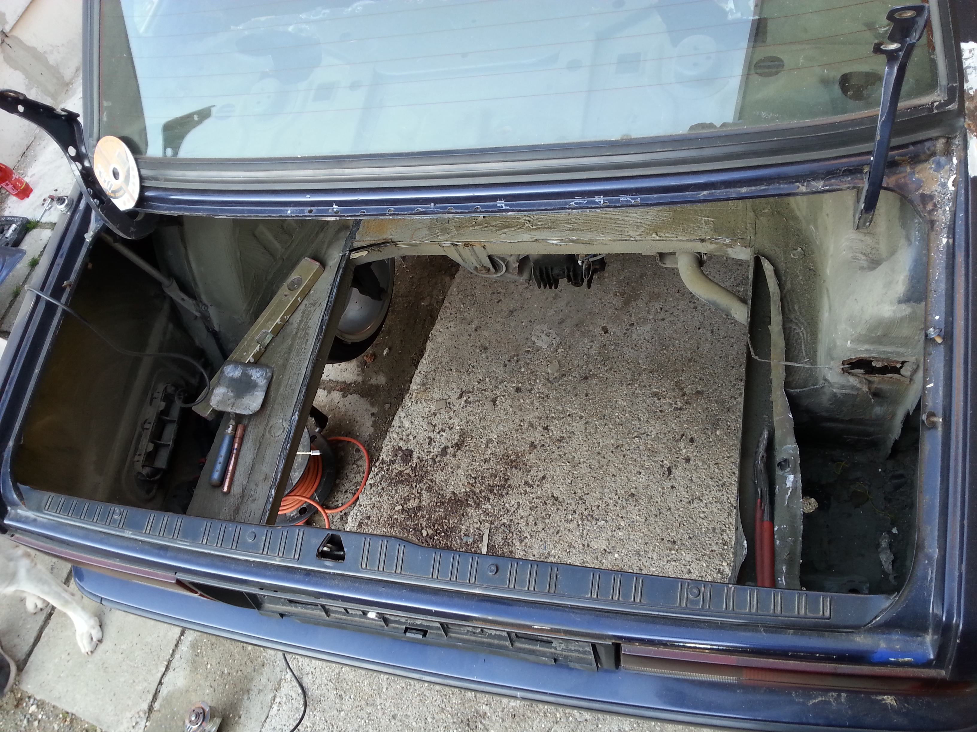 Nová kasňa bola úplne zdravá , na podlahe iba 3 malé diery...lenže kasňa bola prerábaná na drift =D> vzadu rezerva vyrezaná a navarený plech s asi 20 litrovou nádržou :mrgreen: :mrgreen: , zadné čelo vyrezané kvôli výfukom ](*,) , vyrezaná zadná priečka na sedačky, zavarený otvor na veko paliva :roll: [-o< ](*,) ](*,) ](*,) zavarené zámky na dverách ](*,) :thumbup: predlžené predné ramená(nadvarené) [-X