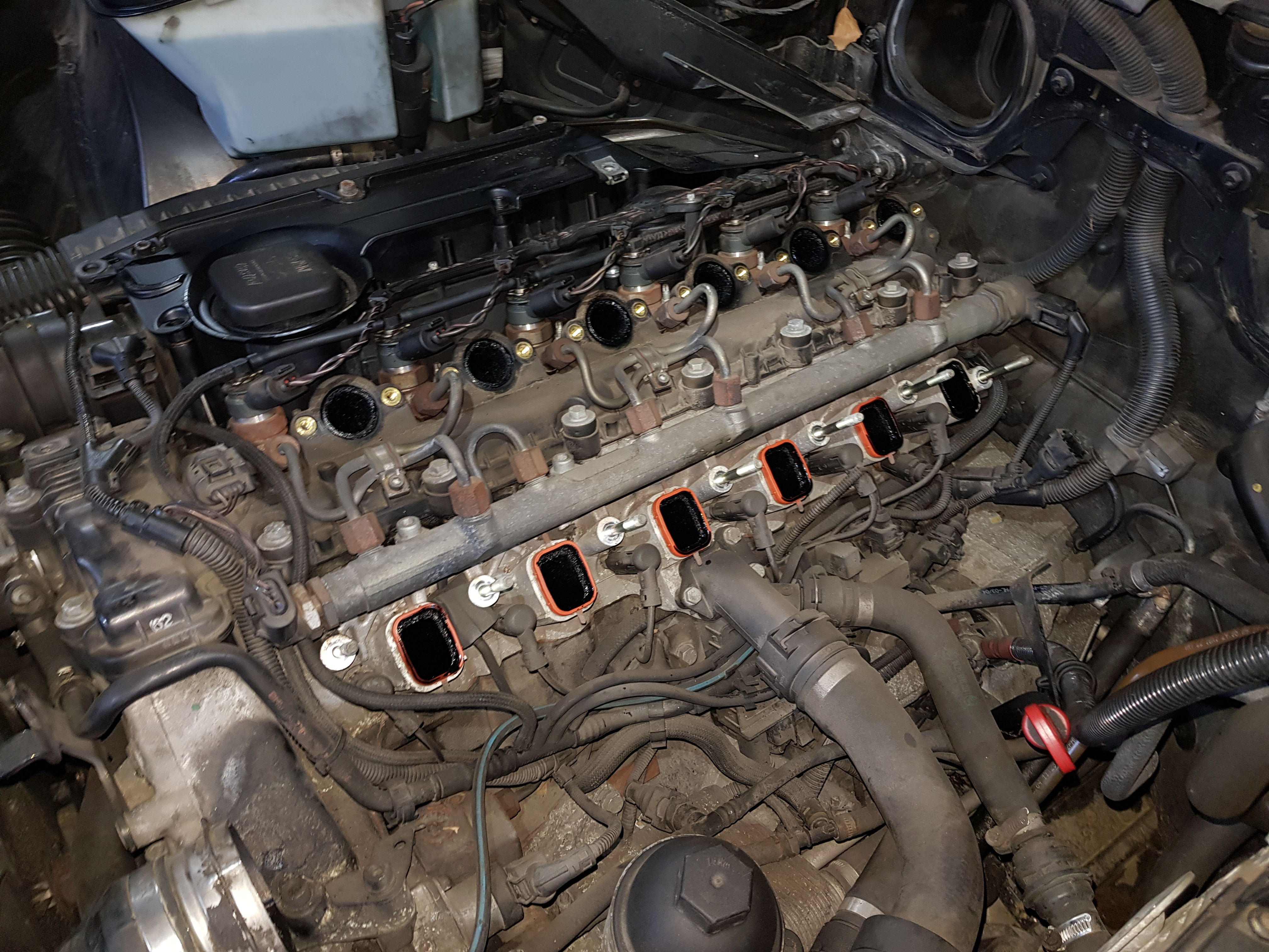 ) pre istotu som vymenil chladiacu. Bola tam naliata fialová, teda asi G30?. Vypustil som náplň šróbom v bloku motora vedľa turba. Potom som dolial teplej čistej vody, naštartoval. Za ten čas čo som zhadzoval spodné dekle, hlavne ten hliníkový čo je veľmi kokotsky vymyslené na e53 narozdiel od napr. e60, motor stihol vychladnúť. Takže som musel čakať kým sa to na voľnobehu ohreje, otvorí termostat a prepláchne. Zapol som všetko čo sa dalo, výhrevy sedačiek, okna, svetlá, hmlovky. Za cca 10 min už začala voda kolovať. Zhasol som motor, znovu vypustil a opäť nalial čistej horúcej vody. Štart motora, odvzdušnenie už išlo za 3 minúty, nechal som bežať ešte 10min a vypustil. Išla už veľmi bledo fialová voda z toho, tak som zavrel vypúšťak a nahádzal dekle. Namiešal som novú G12 1:1 do -30°C, zase volakde ušetrili kkti lebo prednedávnom to bolo 1:1 do -36°C.