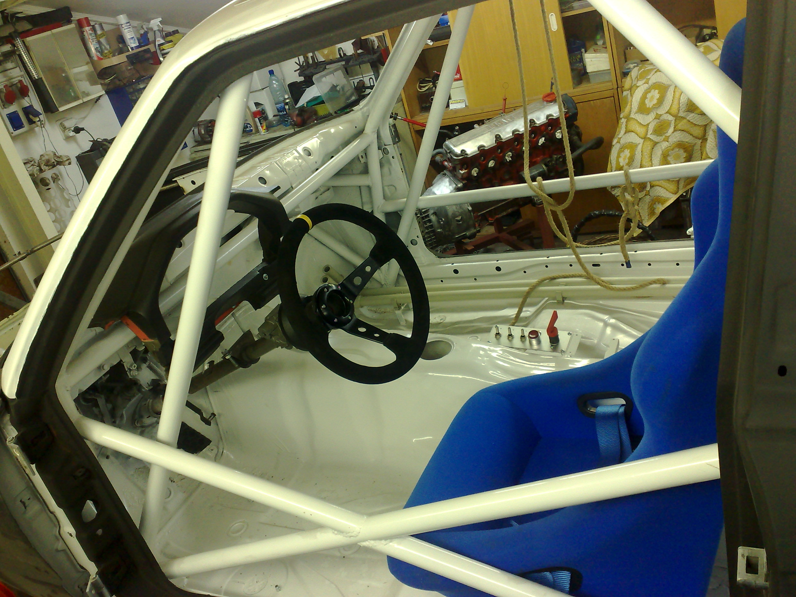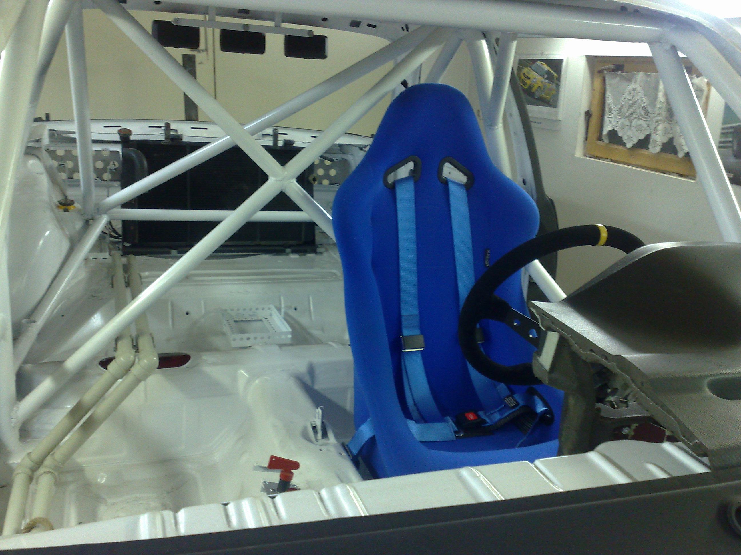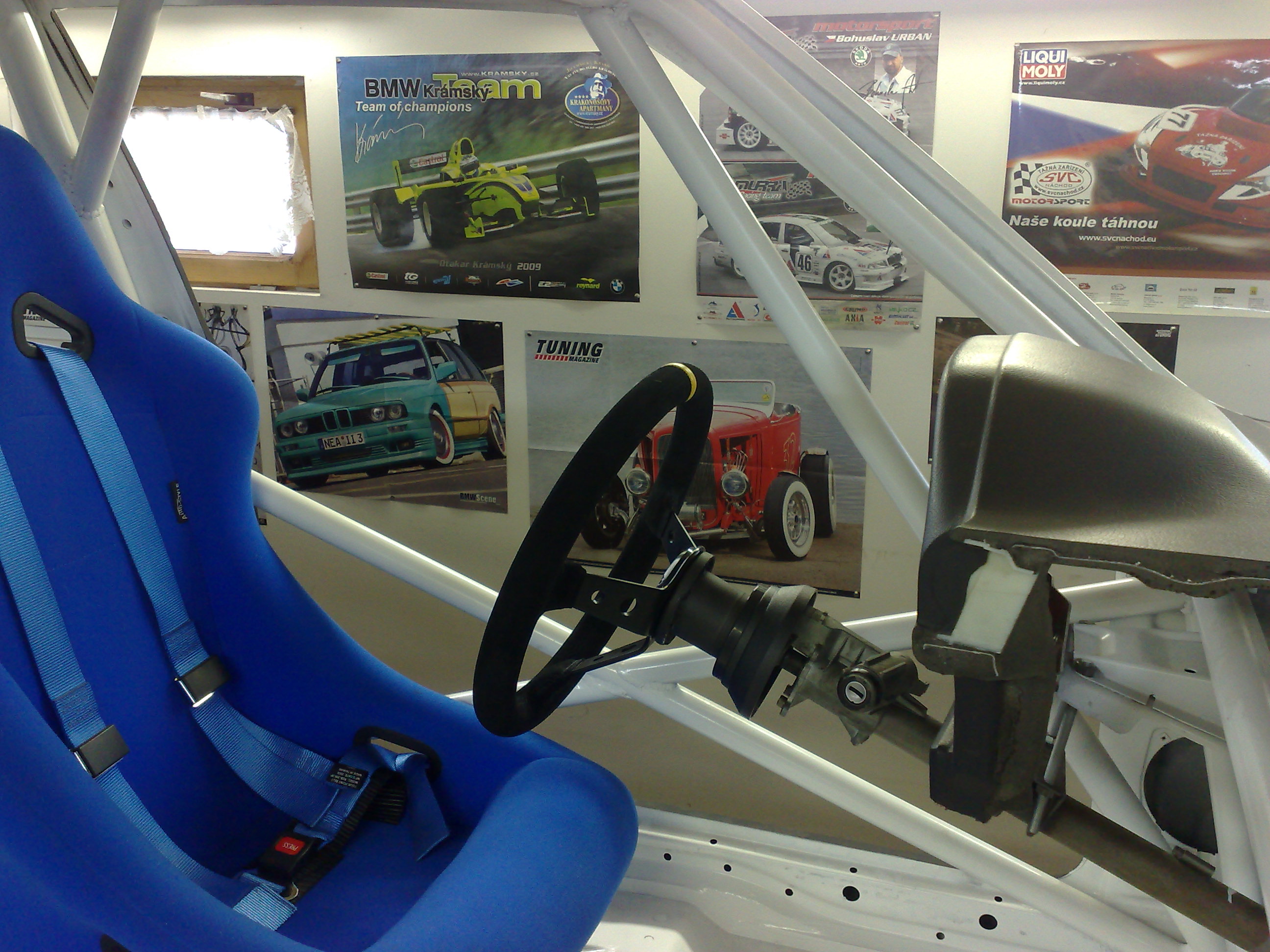 Provizorne namontovana sedacka,pasy a volant s nabou..