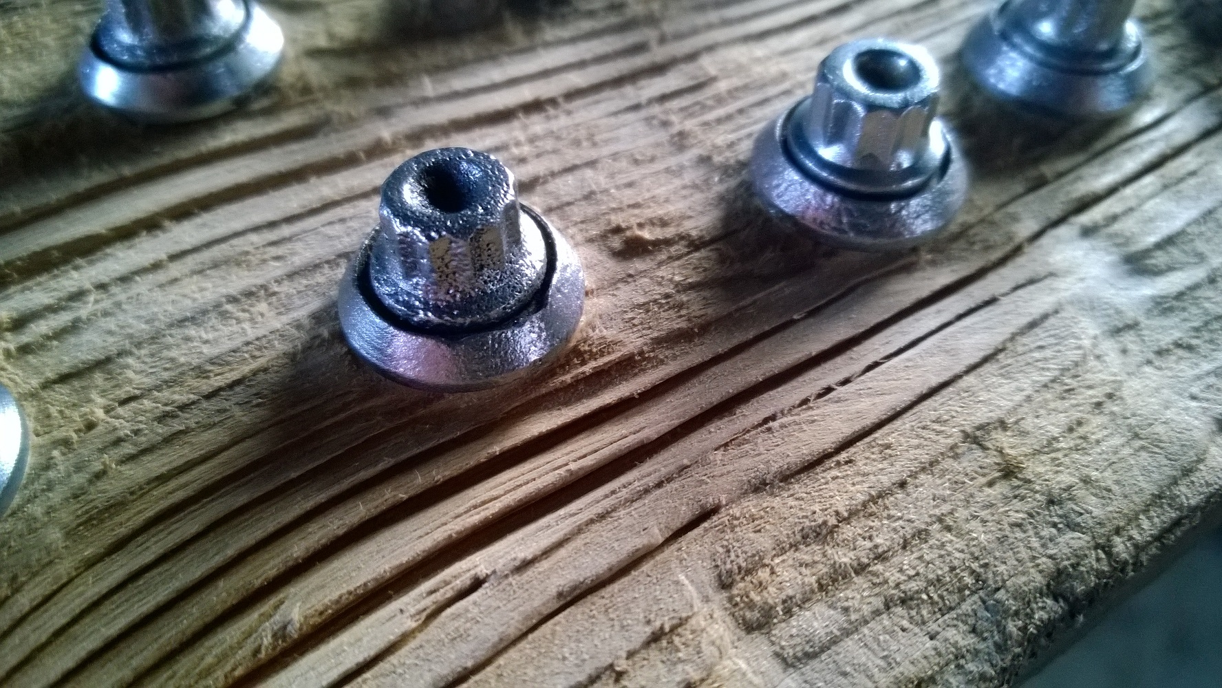 Ako som pisal pred casom, zacal som rozoberat kolesa. Po tom ako som urval orech a vasich radach, som kupil zmrazovaci sprej. Po pravde velmi nepomohol. Dalsi orech sice nepadol, ale 3 matky som musel rezat a ruky som si 3 dni necitil. Aaaaale disky su rozobrate, srubky som utopil v octe a veril ze to pomoze. Ako vidno na fotke, ani po cisteni zubnou kefkou, pardon flexou to nie je ono. Musia ist nove, 1,03eur/srubka z Holandska bez dane. Zatial kaslem na to, mozno este motyka vystreli a stare sa podari spravit. Srubky som utopil v oleji a pustil sa do lestenia kolies, fotky nemam, mozno zajtra spravim. Mam spravenu asi tretinu jedneho kolesa a aj to len hnedou pastou - nemam cas. Ale ide to pomaly.