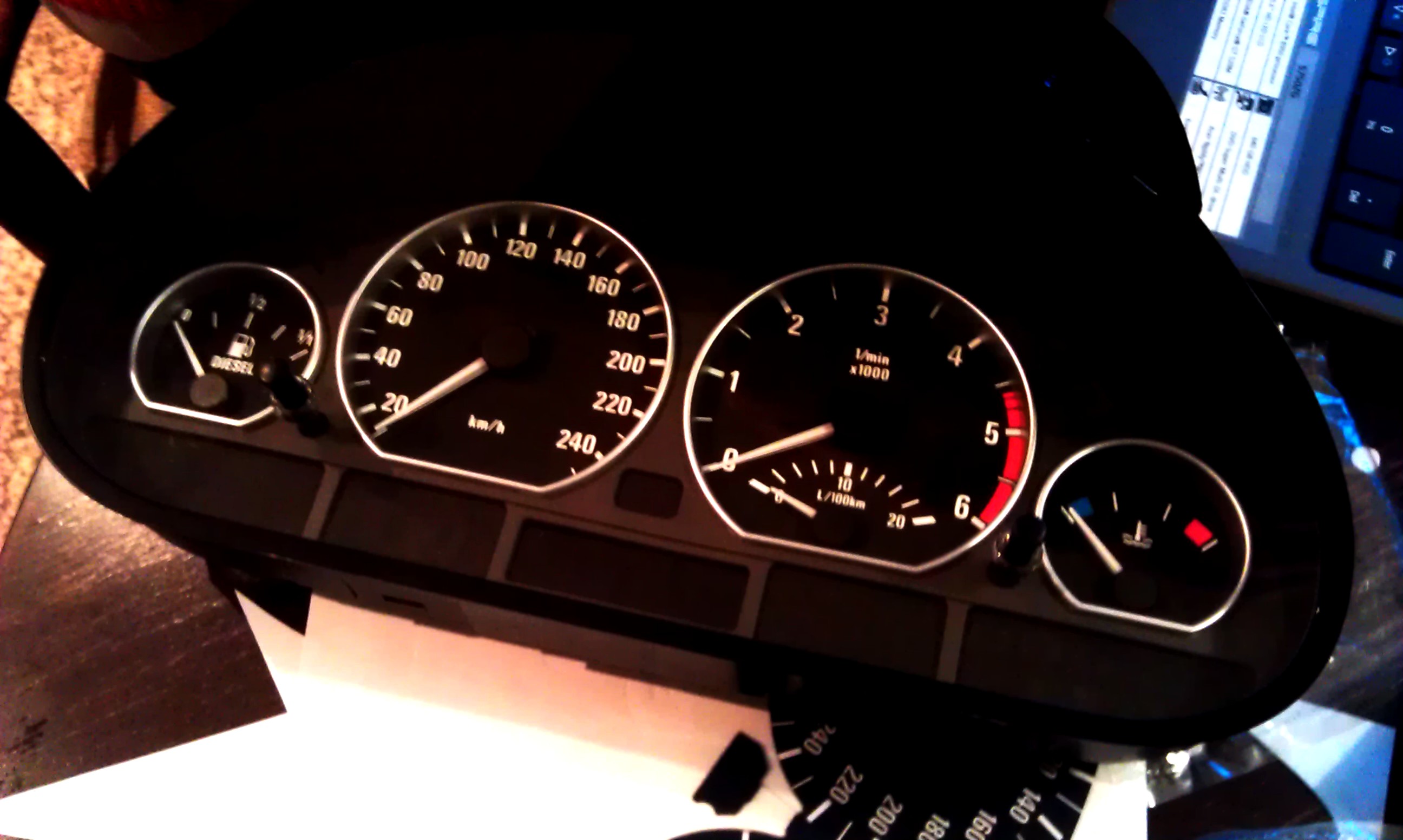 aj som zabudol že po vianociach pribudli tacho-krúžky. Prefotil som aj pozadie budíkov aby v noci nepresvitalo svetlo a pozadie bolo pekné čierne. Dal som tam dve kópie a čísla som pretrel olejom.
