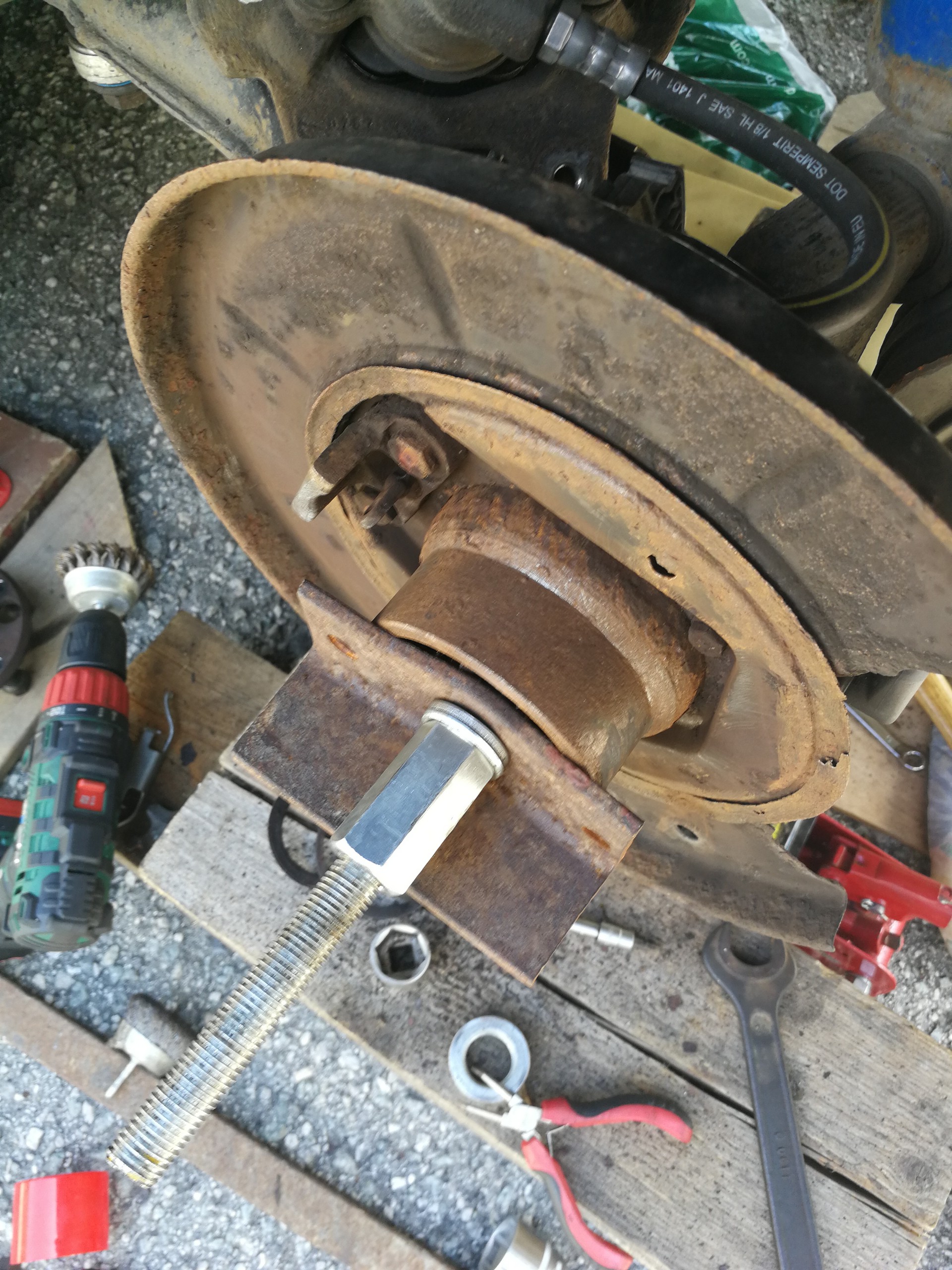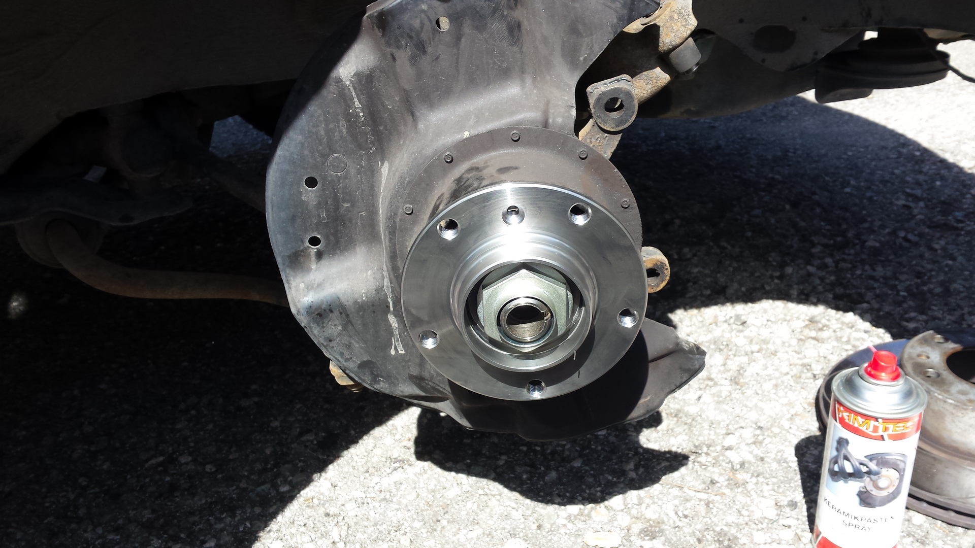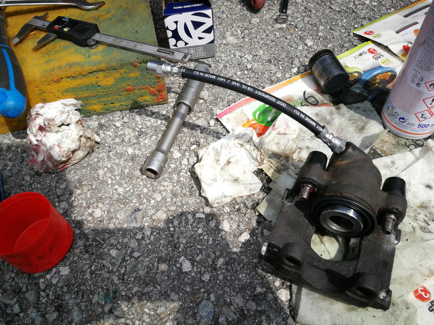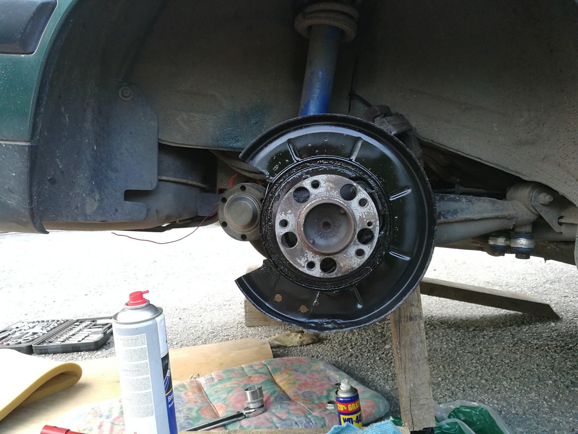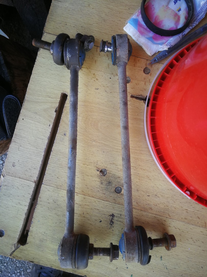 Tento rok prišlo k výmene bŕzd. Vzadu boli snáď pôvodné a v predu najprv Meyle (pokrútili sa), potom jazdené ATE Powerdisc (pravá strana sa tiež zvlnila), tak reku dám nové všetko. A aby to bolo komplet, s tým išli aj ložiská (najprv len predné, zadné neskôr). Po výmene kotúčov zmizli dunivé vibrácie zo zadne nápravy pri jazde na dialnici. Výmena predných ložísk bola veľmi príjemná robota, čo už sa nedá povedať o zadných. Hlavne vylisovanie ložiska bol najhorší úkon, kedže to vylisovať nešlo. Zaujímavé, že na prednú nápravu sú v sade aj matice, na zadnú už nie, takže origoš BMW 7,5€/kus. Pri výmene zadných ložísk som zistil, že zadný tlmič má už lepšie časy za sebou. Po hľadaní a dvoch neúspešných objednávkach som konečne našiel shop (jedne z dvoch ns Slovensku), kde mali presne to čo som potreboval. A potom také menšie úkony....hadičky, valčeky, žhavičš...atď.