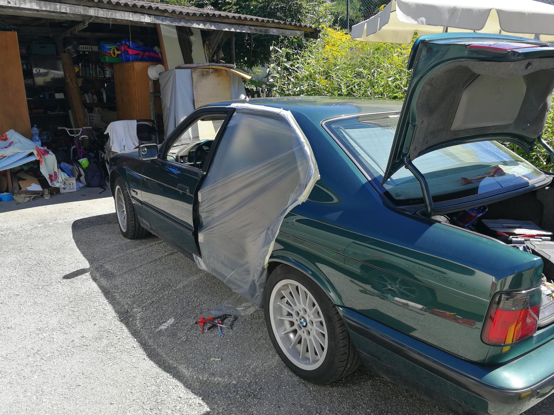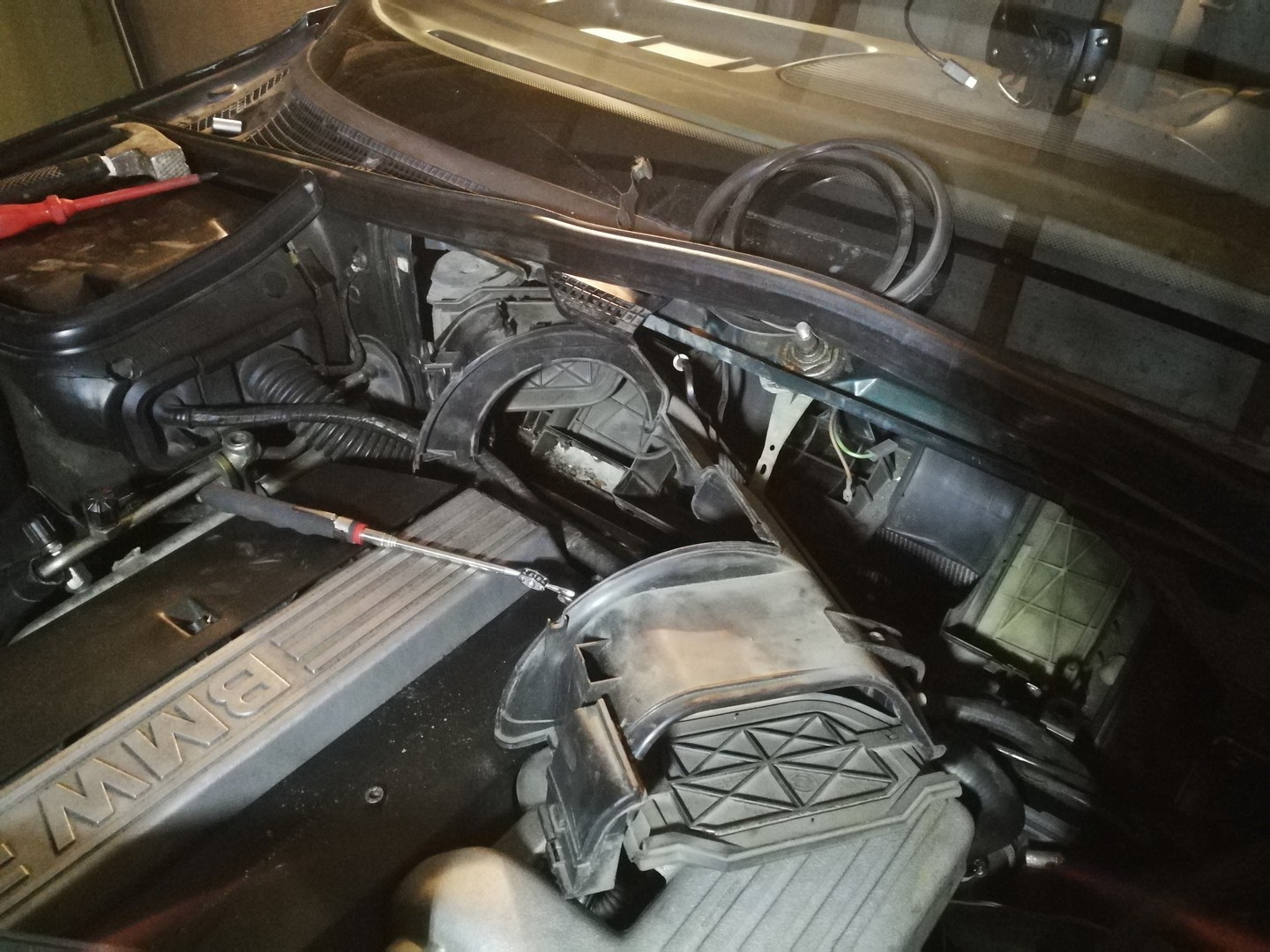 Čelné sklo, ktoré ma už aj tak dosť sralo dostalo zásah kameńom a slnko dokonalo svoju prácu, takže šlo nové - cez Jumaz. Spojka, ktorú som tam mal asi rok (SACHS) začala nepochopitelne prešmykovať, výmena za LUK a zatiaľ pokoj. Kôli problémom s kúrením som sa pozrel na ventily kúrenia, kde som čakal, že budú zadrbané, gumičky popraskané...ako to väčšinou býva, no na moje prekvapenie boli ako nové. Čo však bolo "zlé", bolo pomocné čerpadlo pri ventiloch. Koliesko s lopatkami sa v podstate nekrútilo, spuchol plast okolo osky. Trošku prebrúsiť vnútro a opäť to maká. Na podozrenie, že sa mi hmlia okná v zime som vymenil radiátor kúrenia - "popiči" robota. Ako sa oteplilo kúrenie aj tak začalo blbnúť, kúrilo aj keď som nechcel. Z nejakého dôvodu po určitom čase otvorilo ventil kúrenia na vodičovej strane a nereagovalo na nič. Takže okno a nohy na plné pecky. Všetko som prekontroloval, ale chybu nanašiel, ostávala výmena IHKR modulu, no opravilo sa to samo - bmw voodoo. Podarilo sa mi zohnať BOSCH svetlá, ktoré majú číre sklo, kdeže tam mám bixenon optiku, ktorú ale tiež vymenil za novšiu + spolu s novýmí výbojkami.