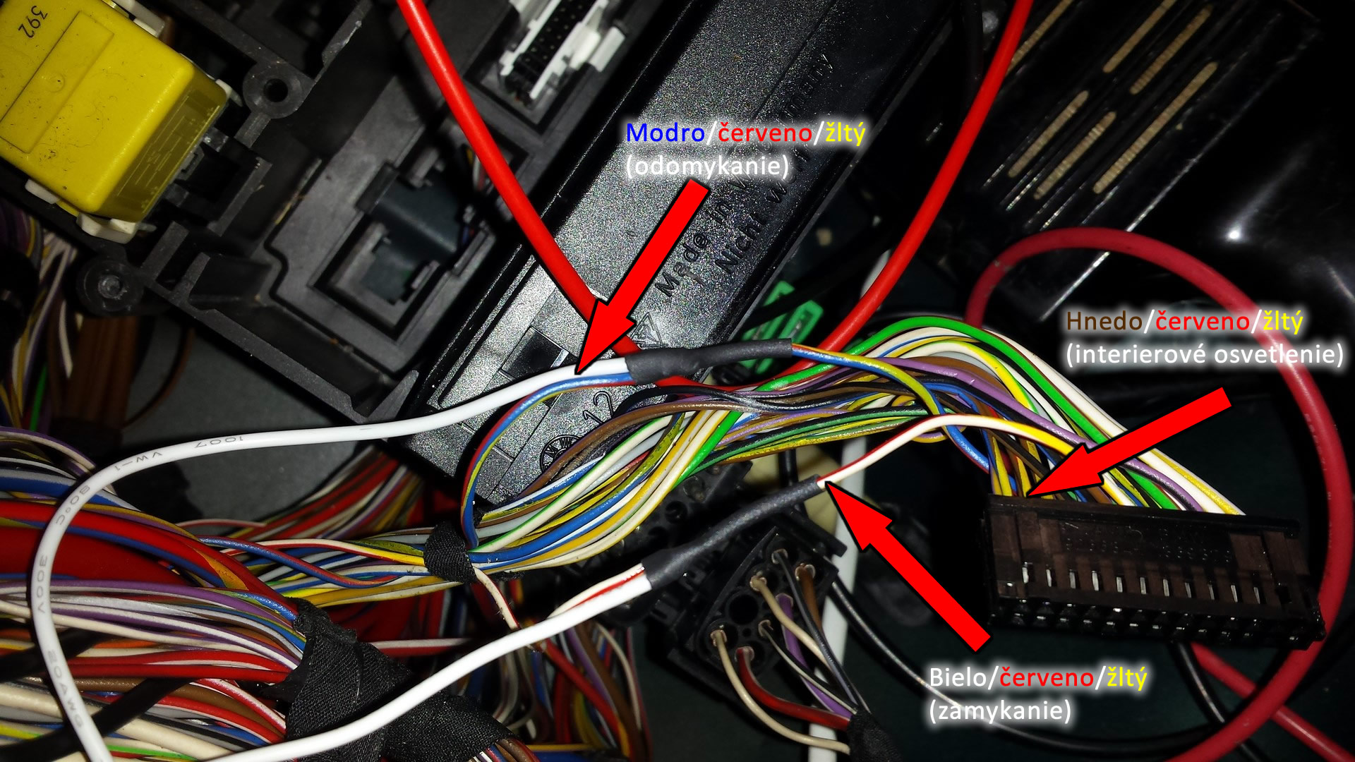 Zapojenie nebolo zložité, všetky potrebné káble sú na jednom mieste - pod zadnou sedačkou, len som to chcel spraviť poriadne, tak to pár hodín zobralo. No a ako to je zapojené? Aby som sám nezabudol ako som to zapojil