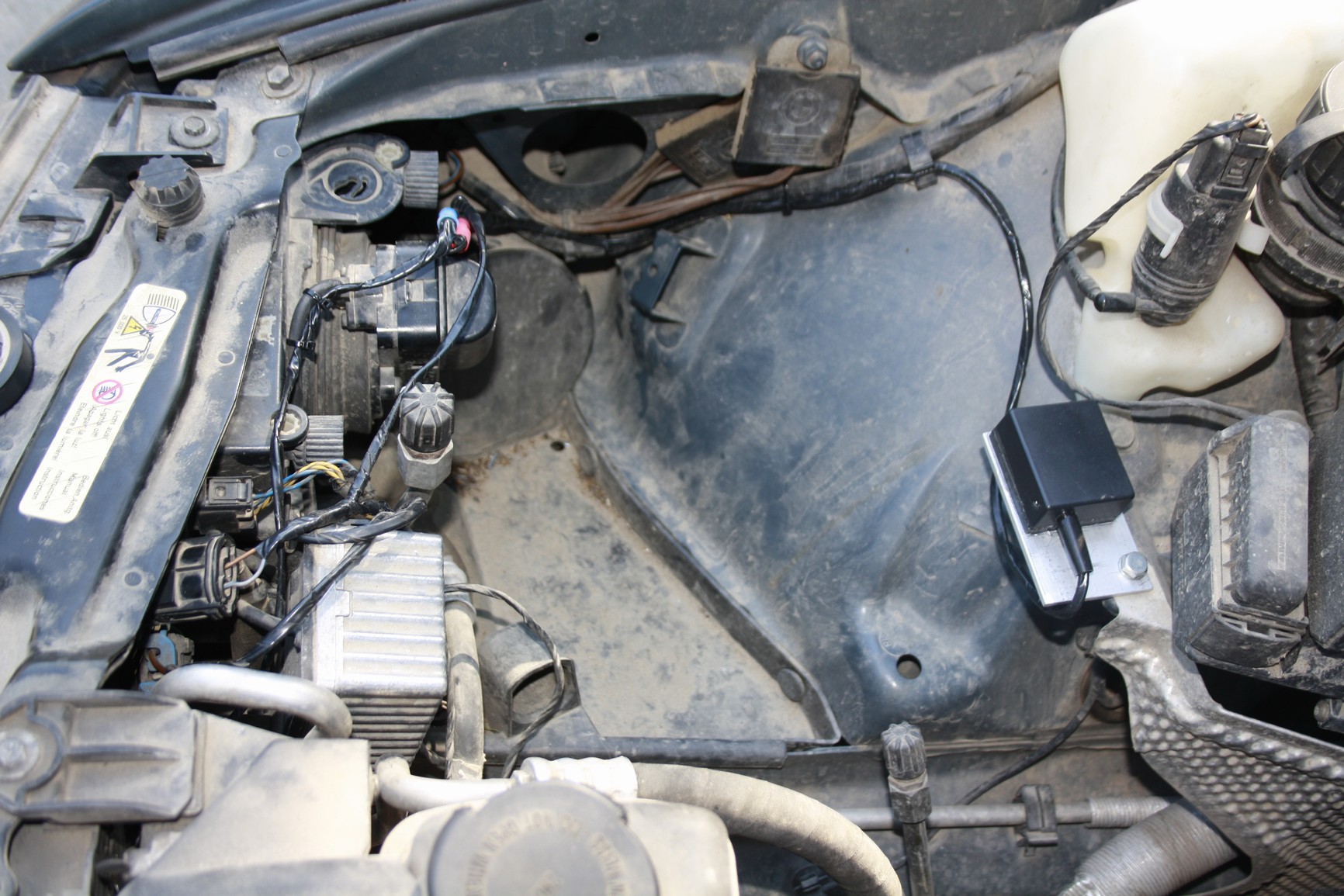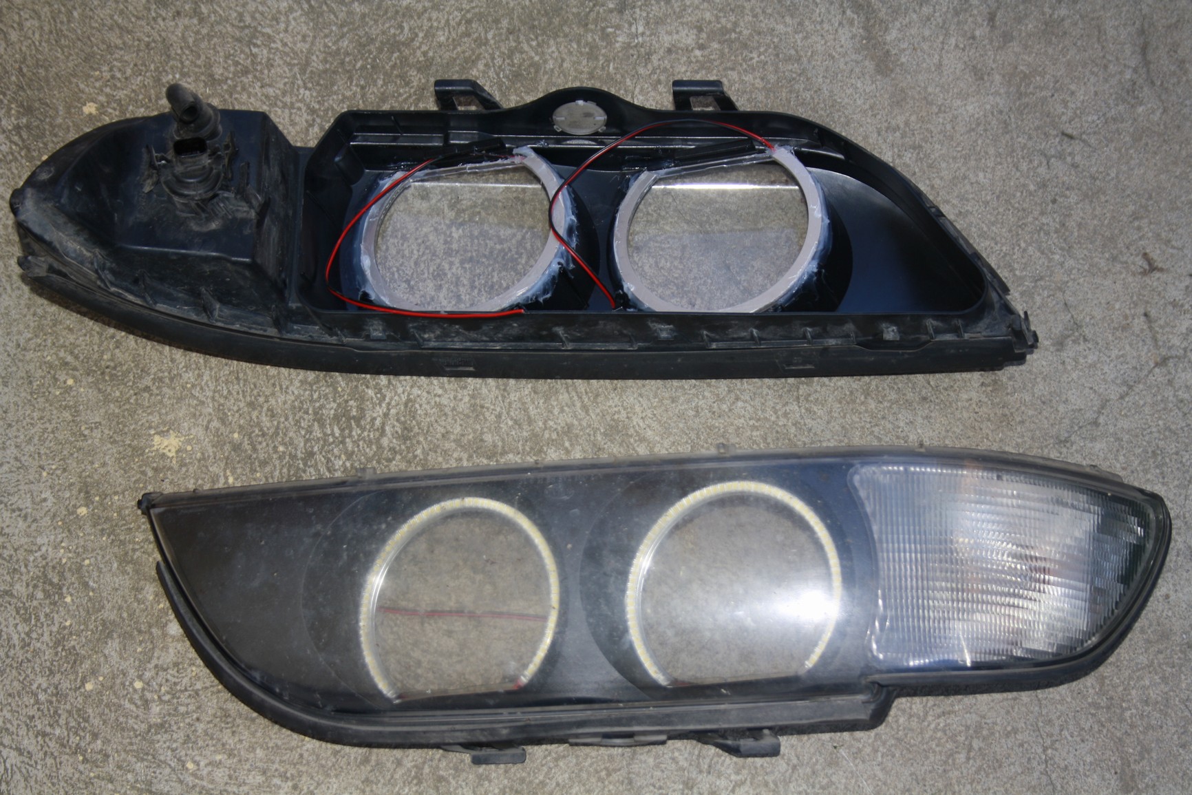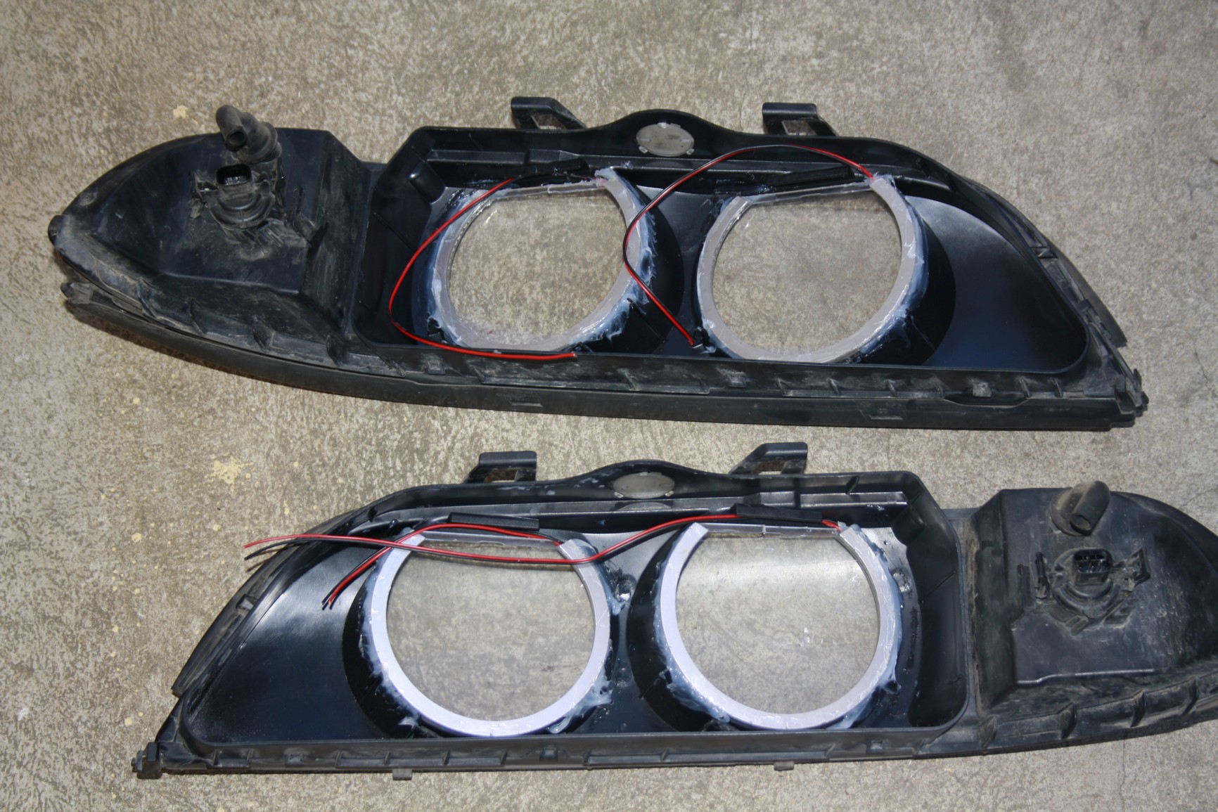2) Po druhe bolo zachovat chybovu hlasku na modeloch E39 bez toho, aby bolo kable tahane cez otvor parkovacej ziarovky a konektor iba smesne vysel v motorovej casti. S timto vysledkom som sa nemohol uspokojit. Niektore verzie obsahovali tzv. konektor na pripojenie namiesto obimky ziarovky. Ale ziadna sada neobsahovala tuto nahradu na ziarovky H6V (5W parkovacky na mojej E39). Vyriesil som to tak, ze povodny konektor ostava pripojeny ako doteraz, akurat nezapojite ziarovku. Kable z CCFL alebo Led kruzkov som vyviedol von vetracim otvorom, ktory je na svetlach standardne blizko smerovky a cele kablovanie som paralelne priletoval na kable pre parkovacku. Celku kabelaz som zabandazoval cierno paskou a je skovate do original kablovania a je na nerozoznanie. Takze ani z vonku nie je nic vidiet. Pri vypaleni sa samozrejme odjavy chybova hlaska a svieti nahradna smerovka (ako je to standardom).