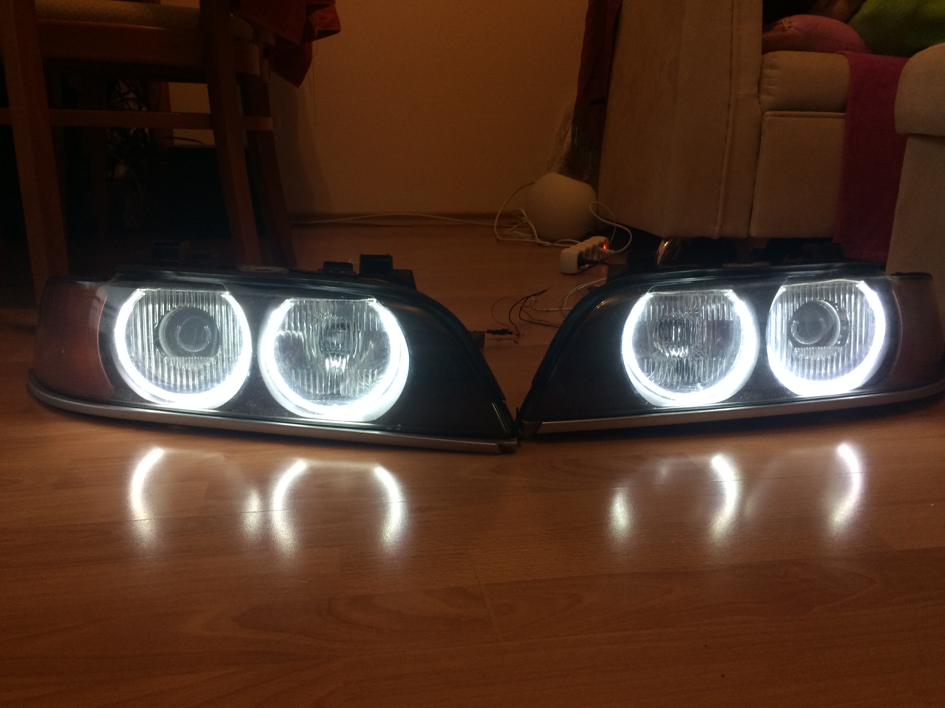 Ja som to robil akurat dnes tiez na pred faceliftovej E39. Kupil som z ebay kruzky. Dal som dolu zadny kryt, skla. Na tie skla som tie kruhy prilepil obojstrannou paskou, ktora bola v baleni. kable som prestrcil cez parkovacky, kedze tie uz potrebovat nebudem. rovno som umyl skla, vylestil a tiez paraboly a sosovky na xenonoch. Este musim vymenit tie nastavovacie tycky, zlamali sa krucinal... ](*,)