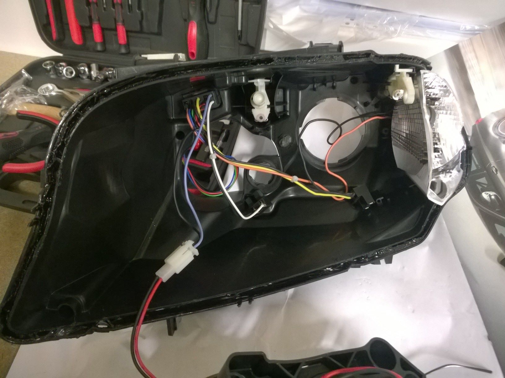 - vo fotonávode je zobrazené rozobratie svetiel a výmena optiky - inštalácia angel eyes spočíva v demontáži pôvodných a osadení nových vysokosvietivých angel eyes. - každú z troch nožičiek angel eyes som poistil dvojzložkovým lepidlom