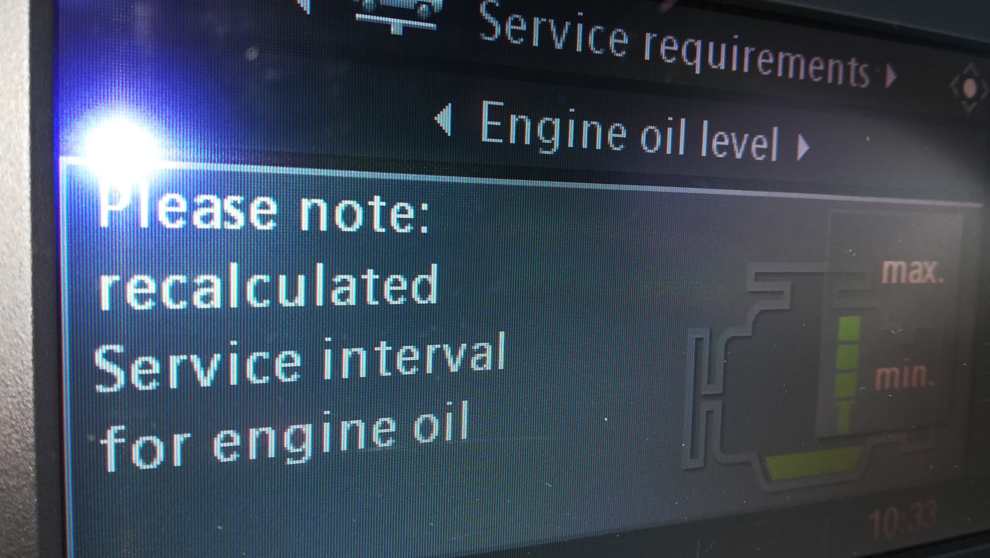 Auto má cez 200 tiscíc, a pri jendo olej servise sa nám nedal resetnúť itnterval cez diagnostiku. tak sme to nechali tak. A na USA forach sme našli že ide o chybu softweru, ze pri 200 tisíc sa blokne reset intervalu oleja a ide to len manuálne urobiť. Tak sme to urobili ale nedopatrením som ho resetol dva krát:) tak teraz mám výmenu v 12/2019