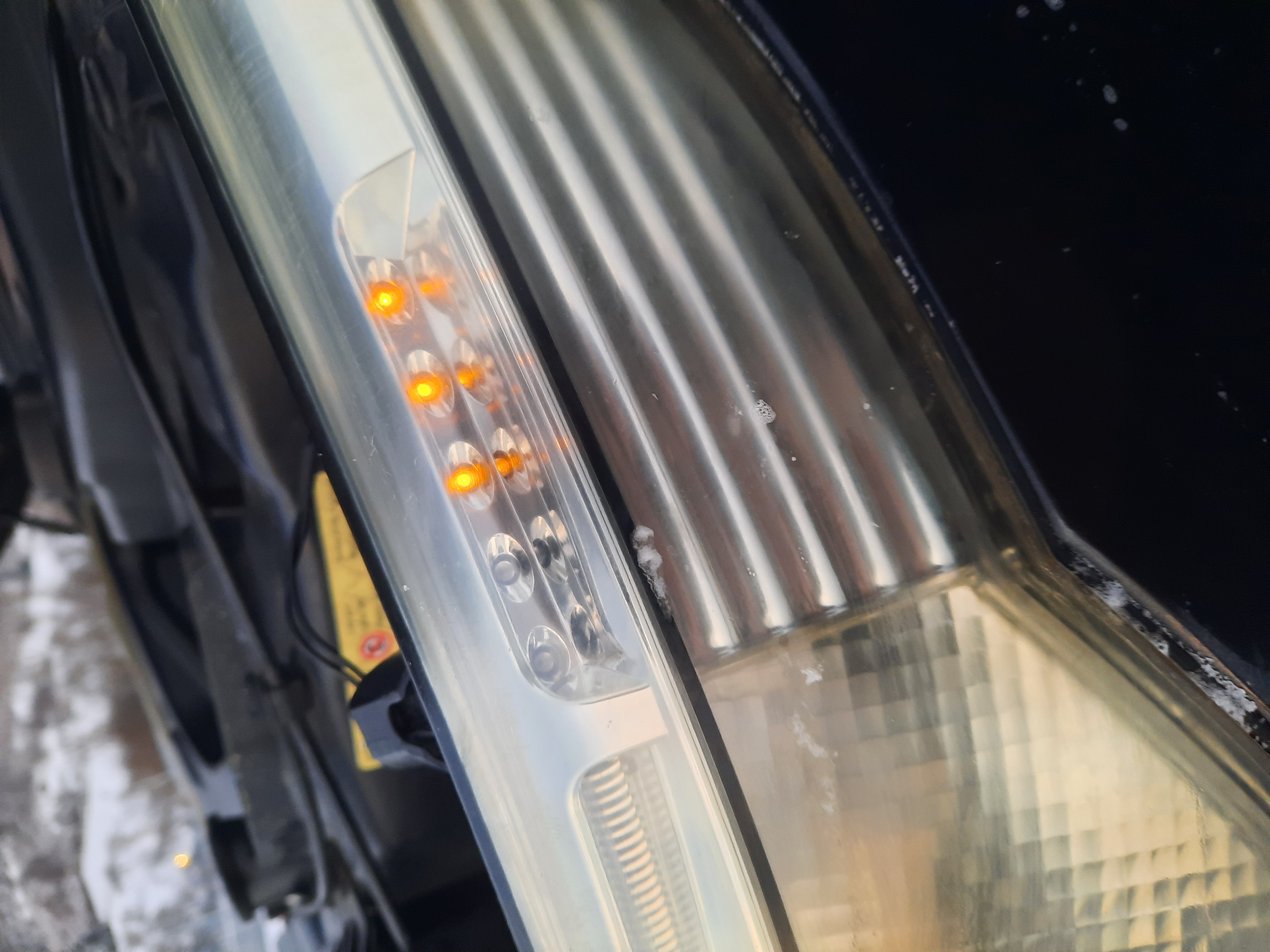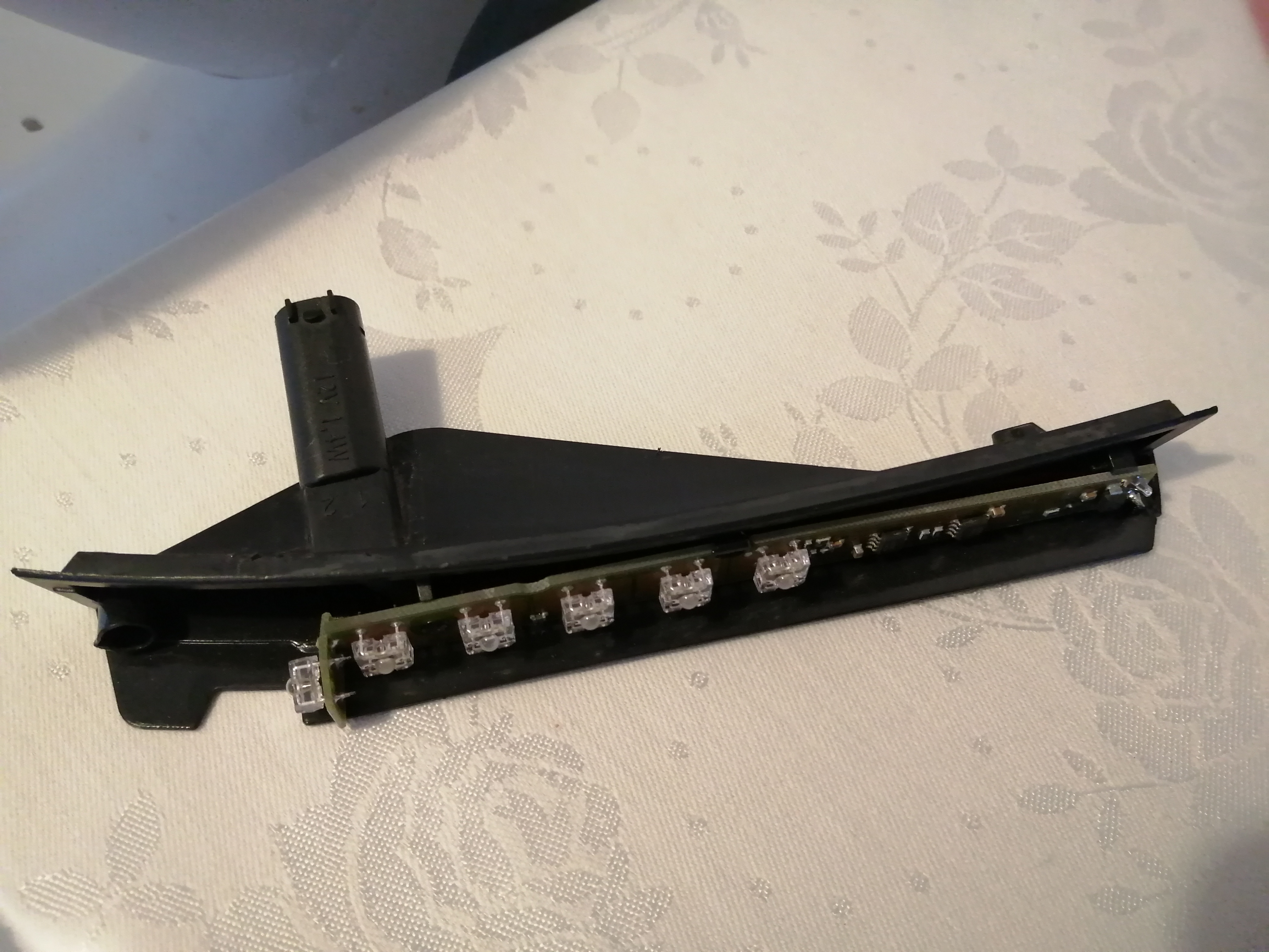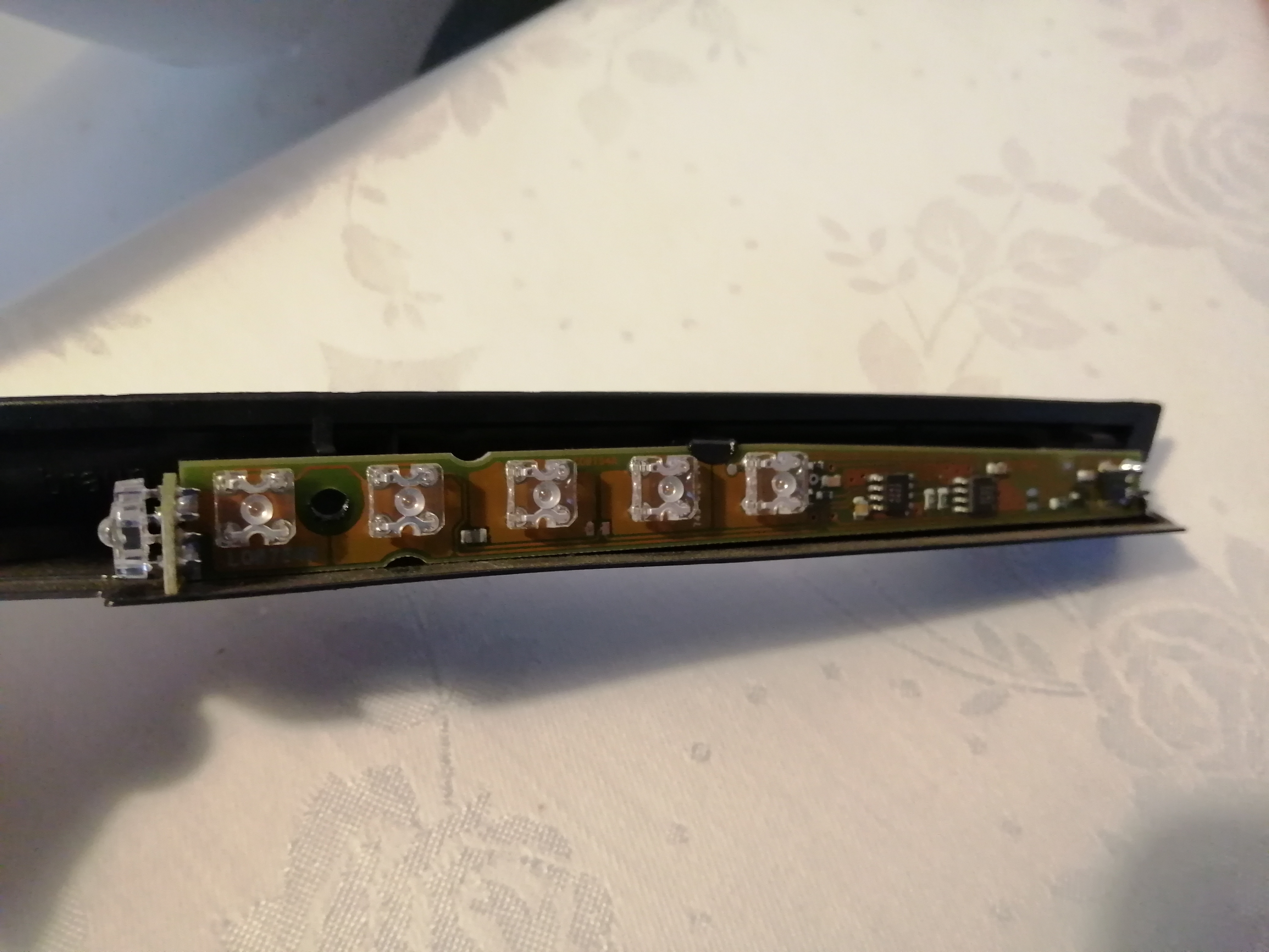 Nech sa páči. Bohužiaľ, neskoro som si všimol, že mobil zaostril na LED a nie na čipy, ale je ich tam vidieť, aj keď sú rozmazané. Tá jedna LED vpredu svieti do toho samotného svetlovodu obočia. Tých zvyšných 5 je jasných...