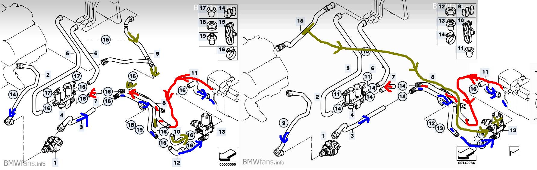 Spodny vlavo sa pripaja v E60 na vstup webasta (smer sipky by mal byt opacny) a zvysne 2 by mali byt vstupy do ventilu - bud zo spatneho potrubia radiatora alebo z motora ked uz sa ohrieva aj motor.
