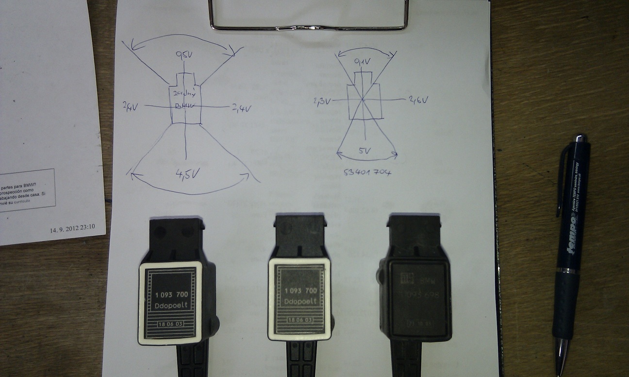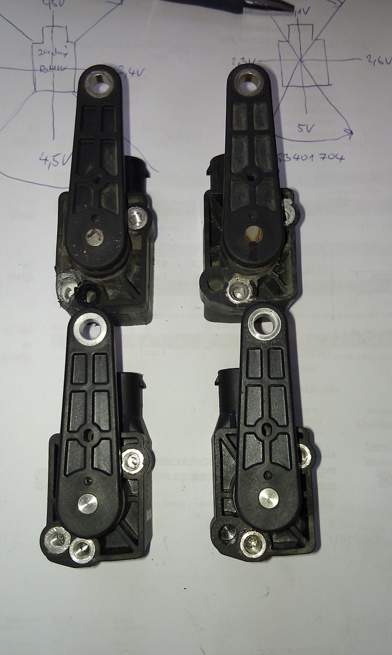 Zistil som, ze snimace sa napajaju napatim 5V, pricom 0V je na pine c.1, 5V na pine c. 5 a pin c. 4 je vystup, kde sa pri funkcnom snimaci da merat napatie 0,5V-4,5V podla uhla natocenia. Zadny snimac je O.K. ale predny ani netukne. Na vystupe je stale 0V. Tak som to objednal v BMW. Cena 80€ :shock: Do pondelka 10:00 to viem este stornovat.