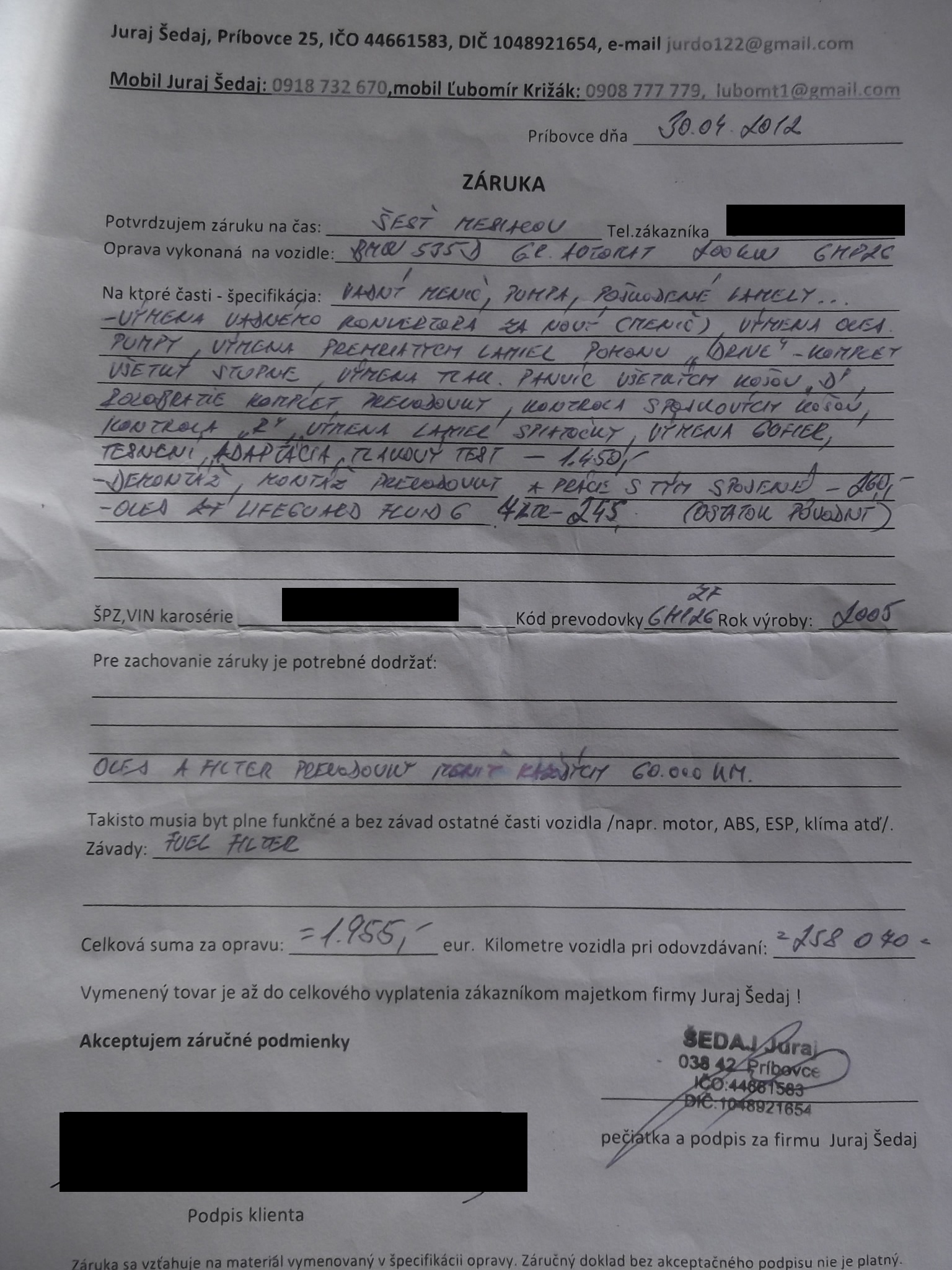Na základe referencií na tomto fóre, som kontaktoval pána Križáka (LuboMT) a auto som mu odniesol do servisu, kde ho prevzal na opravu. Pri skúšobnej jazde pán K. nevedel určiť či bude vadný hydromenič, alebo bude potrebný repas prevodovky. Dohodli sme sa, že prevodovku otvorí, skontroluje či je OK alebo nie a ďalej budeme konzultovať po telefóne náklady spojené s opravou. Po nejakom čase sa mi ozval a oznámil mi už len cenu za opravu 1955€, oboznámil ma s vykonanými prácami, aj keď dohoda znela inak! Prišli sme si prevziať vozidlo, riadne zaplatili za opravu, zobrali sme si auto a hneď na prvom semafóre pri dobrzdovaní- zastavení prevodovka kopla. Hneď som volal pánovi K., ktorý o probléme vedel, pretože povedal, že to spravilo aj jemu, že treba pojazdiť a malo by si to sadnúť. Po nejakej dobe nasledovala cesta na dovolenku, kde sme prechádzali cez horský prechod a pri jazde dolu kopcom sme zistili, že prevodovka si podraďuje ako ona chce (otáčky vyleteli na cca4500ot.). Po návrate na SR som kontaktoval pána K. a povedal som mu o tomto probléme. Dohodli sme sa, že auto donesiem na reklamáciu. Pred zanesením auta pánovi K. bolo auto v servise BMW na vymazaní adaptačných hodnôt a odišlo bez chyby. Za cca 5 týždňov, čo auto stálo v servise mi nevedeli stále povedať, že kde je chyba. A potom to celé začalo. Vraj dali na kontrolu mechatroniku, ktorá nevypisovala žiadnu závadu! Potom mi oznámili, že ju museli zrepasovať, lebo že vraj bola vadná (diagnostika nevypisovala žiadnu chybu). Repas stál 600€. Po založení mechatroniky začalo vypisovať chybu selenoidu 3, na čo mi povedal pán K., že to dá odstrániť. Pohádali sme sa cez telefón, že mechatronika bola dobrá a on tvrdil, že bola vadná, čo nevie podložiť.... Dohodli sme sa, že budem akceptovať cenu za repas 600€, ale nebude mi účtovať ďalšie náklady s tým spojené (práca, olej atď....), nakoľko mal všetky chyby na prevodovke opraviť pri prvotnom repase, aby som neplatil duplicitne za práce. Toto však nedodržal. Ešte som zabudol napísať, že keď som auto doniesol na reklamáciu, už hneď vedel napísať predbežnú cenu opravy 1000€, ešte ani nevedel, kde bude chyba a nehovorím o tom, že auto prišlo do reklamácie! Napísal mi sms-kou cenu za opravu 1020€, čo som nebol ochotný zaplatiť. Oznámil som mu kedy si prídem po auto, aby sme si mohli vydiskutovať náklady na opravu. Samozrejme pán K. tam nebol a celé to nechal na jeho kolegu, ktorý o problémoch skoro nič nevedel. Kontaktovali sme pána K., že sme v servise a potrebujem s ním hovoriť osobne, aby sme si vydiskutovali cenu, ktorá nebola dohodnutá. Chcel to riešiť len po telefóne a telefonát skončil hádkou a následne mi zložil telefón!!! Fakt seriózne jednanie!!!!! Mám podozrenie, že neboli vykonané práce, ktoré uvádza pán K. Po cca polhodine mi poslal SMS, že ma v tom servise už nechce vidieť, že som neseriózny a nakonci bolo DONEVIDENIA!!!! Takto som veci možno riešil, keď som mal 15 rokov a nehovorím o tom, že náš zákazník náš pán..... S jeho kolegom sme išli na skúšobnú jazdu, kde sa javilo, že je to dobré, no po najazdení niekoľkých kilometrov, začalo auto vykazovať chyby také ako pri dávaní auta do reklamácie po repase.... Moje pochybnosti o prevedených opravách sa potvrdili.