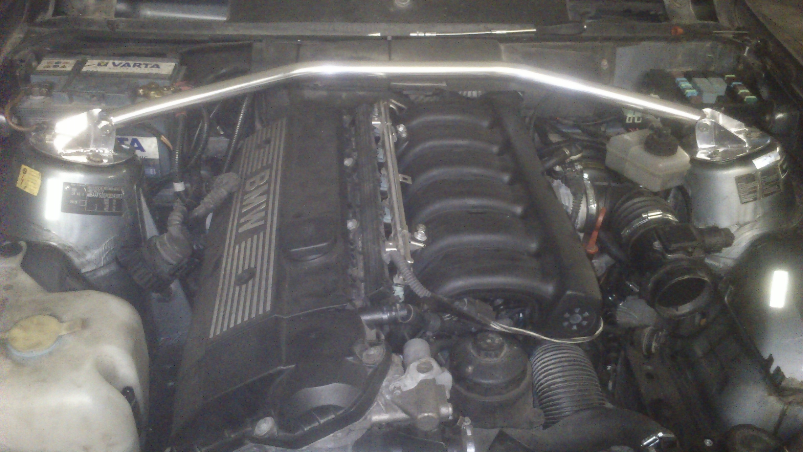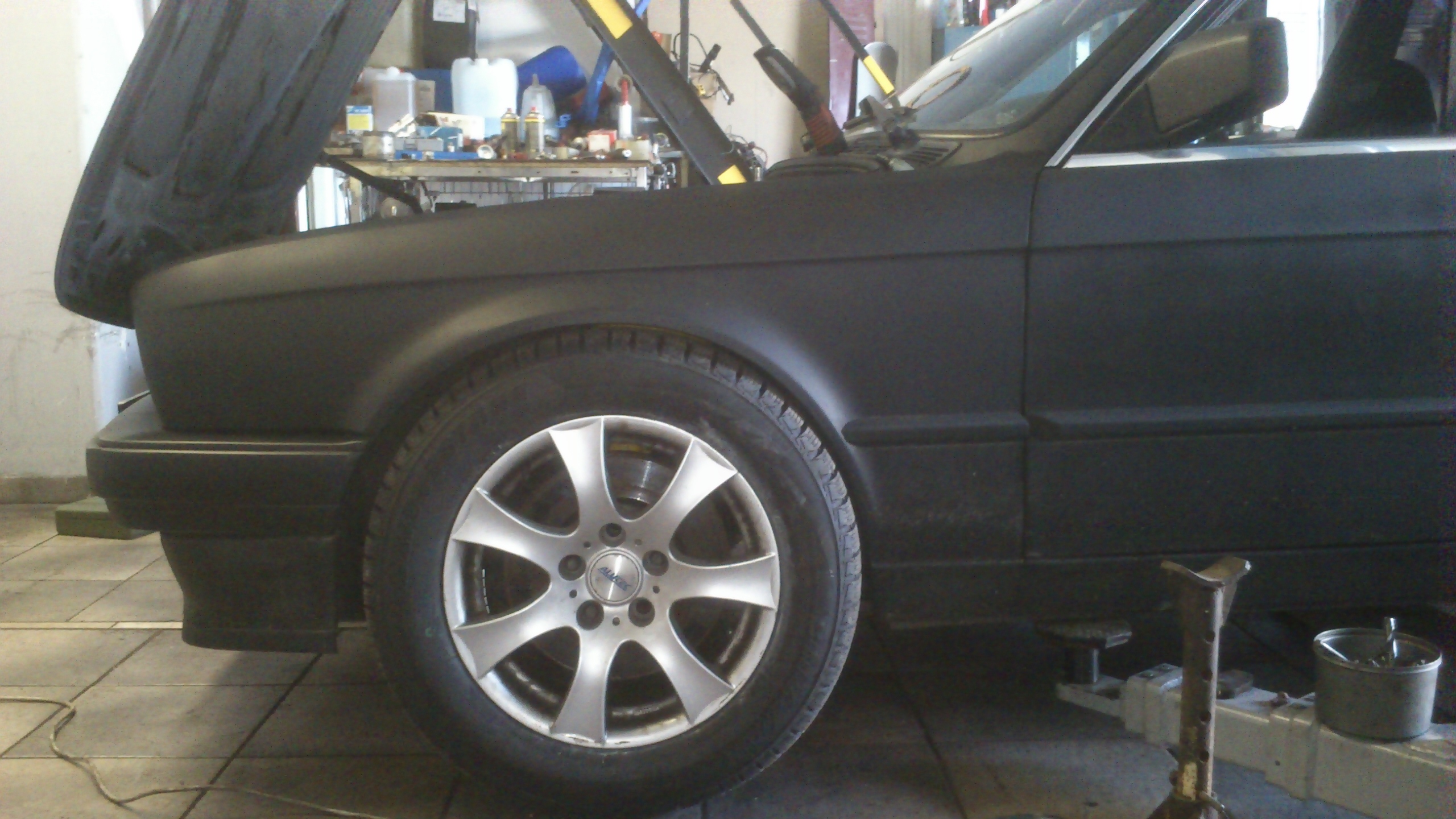 Potom standart, KO, EK, STK, prihlasenie a kedze som nevedel kedy co bolo robene, tak komplet servis, rozvody, sviecky, nemrzka, brzdove trubky, kvapalina, hadicky a auto bolo na znackach. Potom nasledovali drobne upravy, folie na okna, vymena reproduktorov, radio, centralne zamykanie+ dialkove ovladanie, vymena kolies, vymena svetiel, vymena budikov( z rakuska na 325 chrom a ukazovali cudne veci), vymena volantu(4rameno za troj), servoriadenie E36, servocerpadlo MB "A"168, Vedel som, ze 1,8 stacit nebude, tak som zacal chystat veci. Kotucove zadne ramena, E36 M3 3,2 komplet brzdy, E36 M3 3,2 predne ramena, asi Mtechnik komplet podvozok( BMW performance je na tlmicoch) zlte tlmice, cervene pruziny, diferencial 3,15 Torsen, disky 17" Motorsport, 16" Borbet A, 20mm predny stabilizator, brzdovy posilovac E30 325 ix, brzdovy valec E34- 25,4mm( koli brzdam), motor s prevodovkou M52B25, chladic E36 325i, el. vrtula klima E36, sanie M50B25, kabel na baterku do kufra E36, komplet polyuretan silentbloky, rozpery tlmicov, zadne vyklopne okna, zadny spojler M technik Zender a kopec malych drobnosti, ktore radsej ani nepocitam. Po 3stvrte roku jazdenia po Slovensku som sa dal na prerabku a to hlavne preto, ze som mal pod nohami wella woter. Po odstrojeni( sedacky, plasty, koberec som nasiel dieru na vodicovej strane pri prechodke kabloveho zvazku do kabiny a evidentne tade curigala voda do vnutra. Takze hor sa na vyvaranie. Z jedneho miesta "vpredu"(ostatne casom) sa zrazu naslo viacej, nevadi vyvarim, zapatlam, nastriekam a fertis.