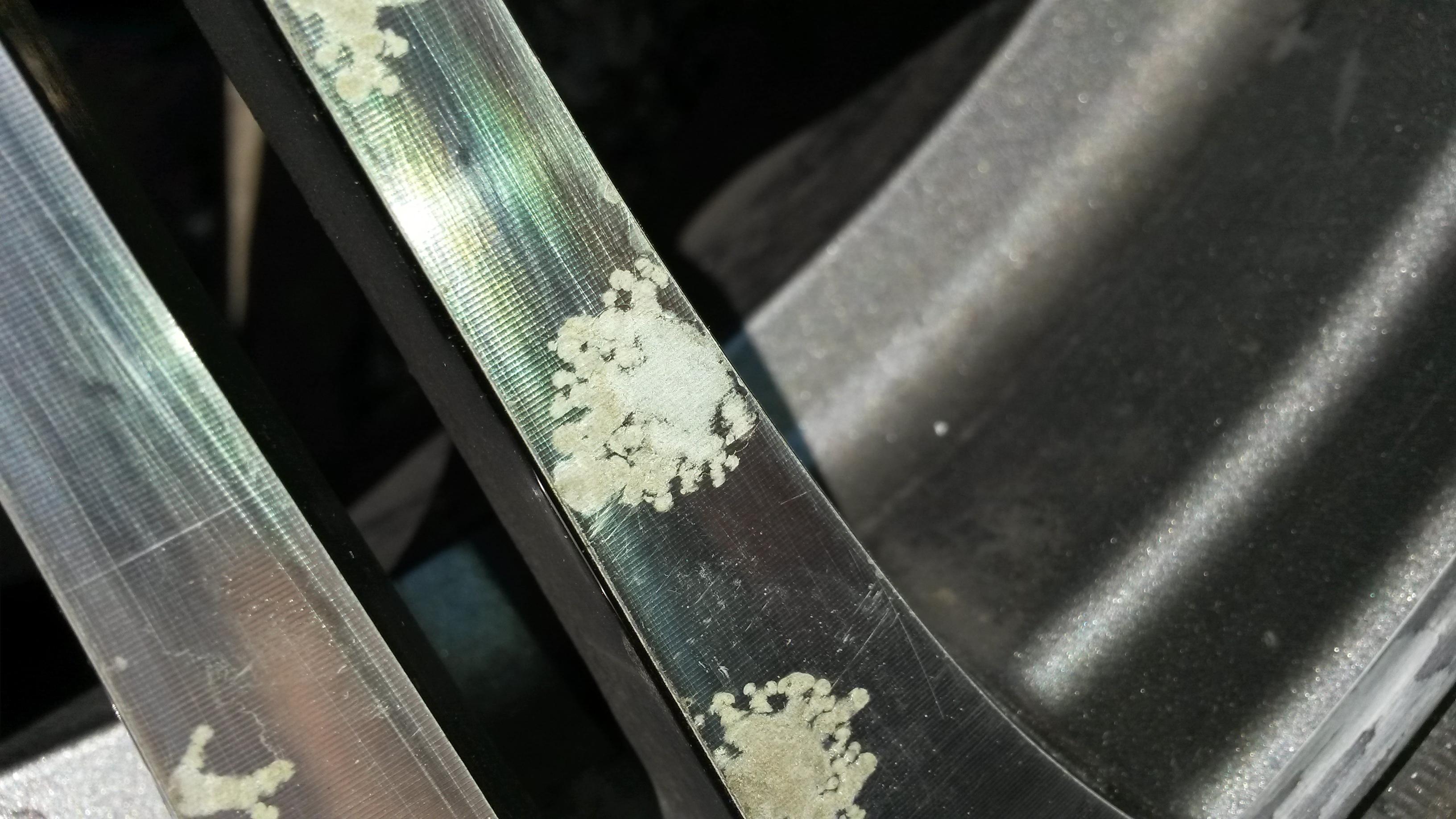 Hrdza to urcite nie je. Jedine ze by si mal tie elektrony zo zeleza... Vyzera to na oxidovu vrstvu Al2O3, staci to obrusit. Co si robil predtym ako sa ti tam zjavila ? Striekal si to nejakou chemiou ?
