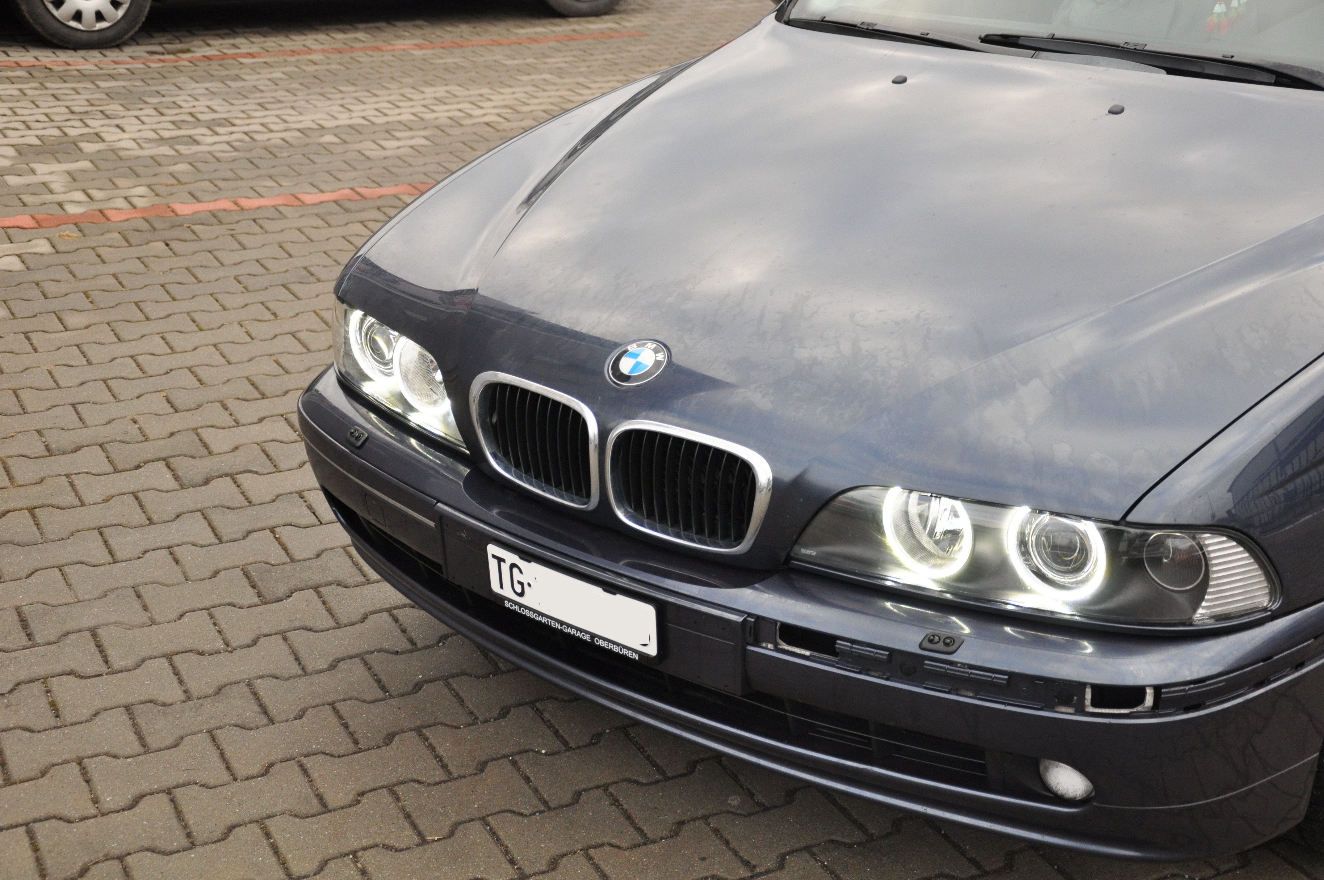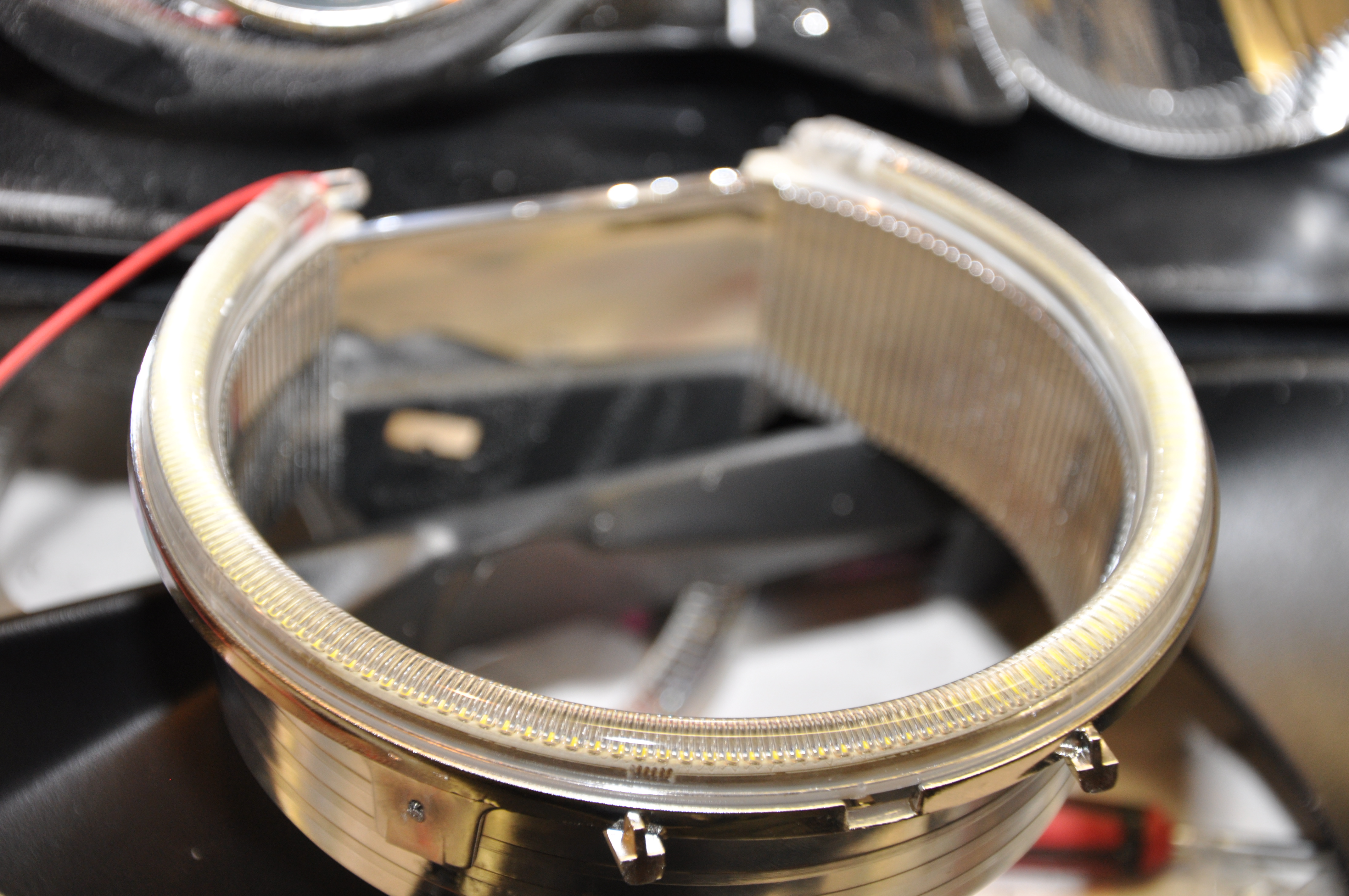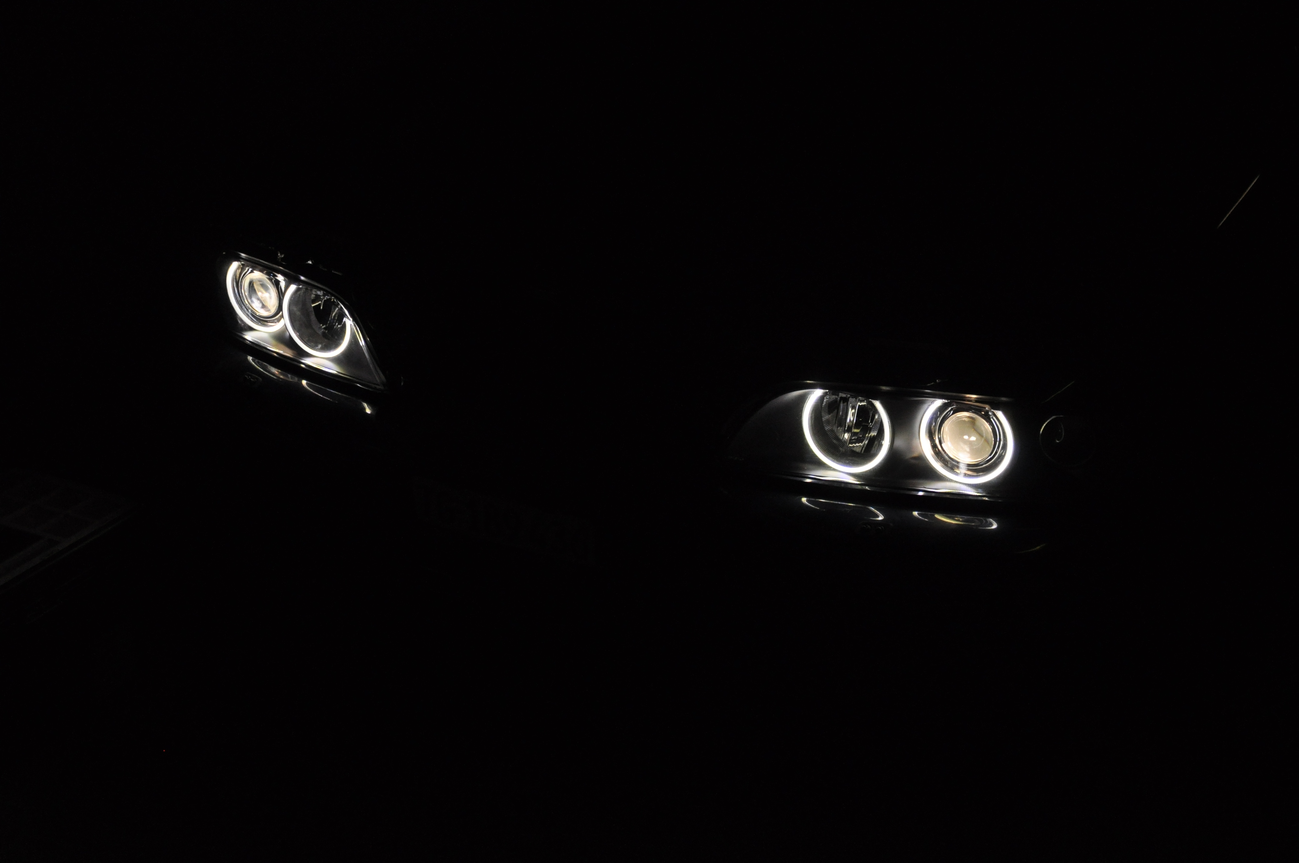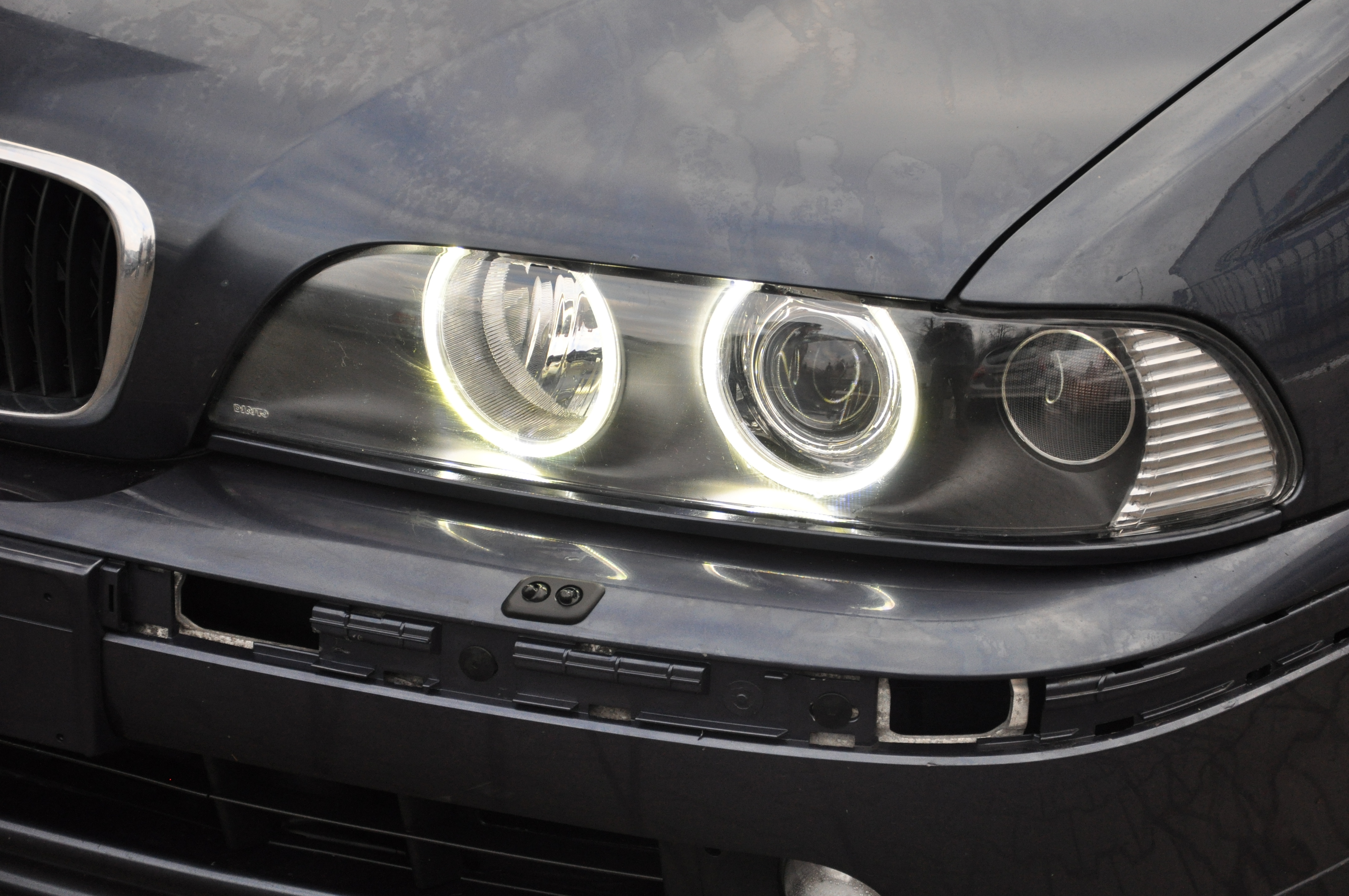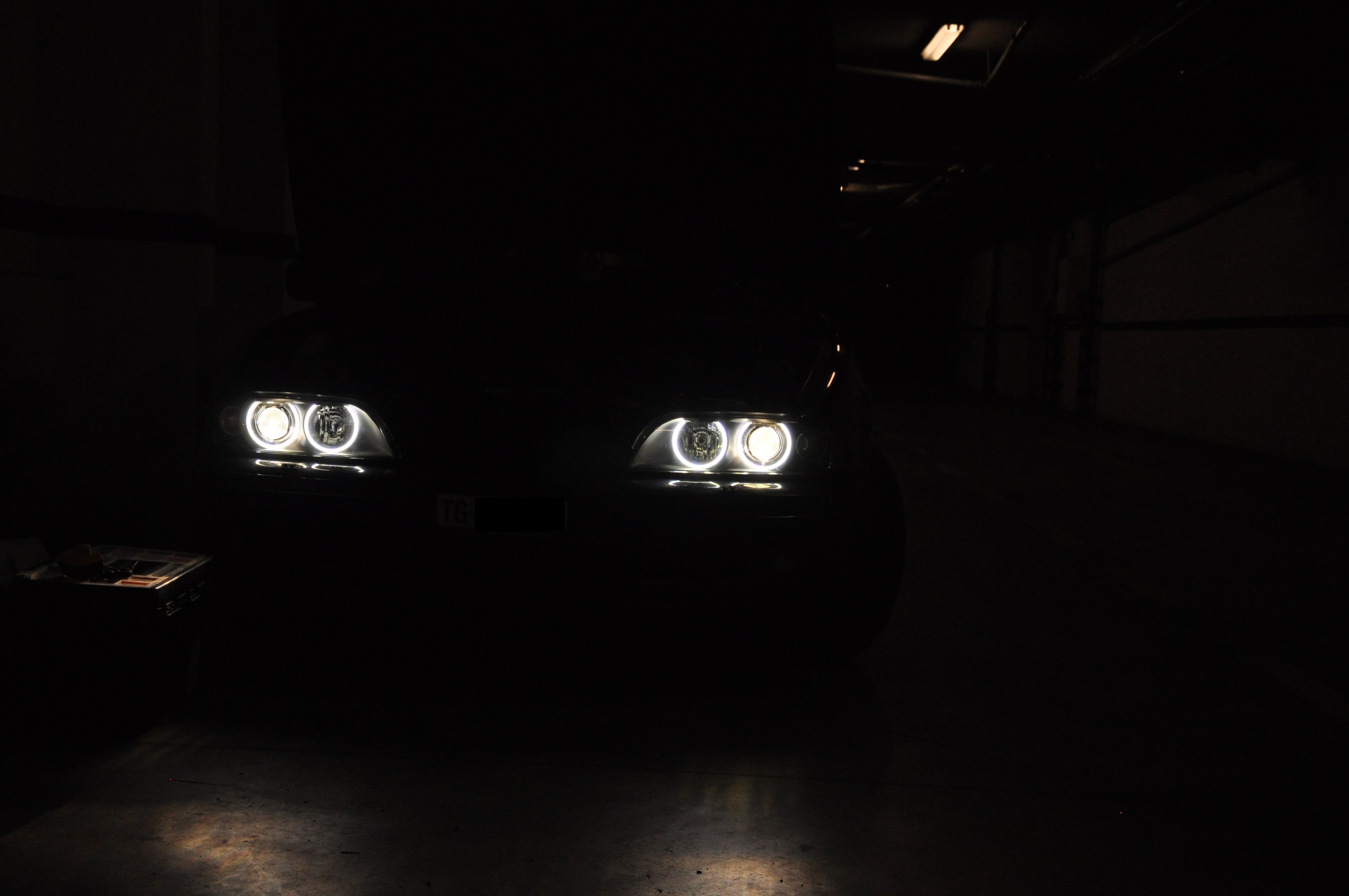 Pred finále, teda nalepením nových plexi som si ešte ja osobne posvietil na angel eyes. Po malej minútovej úprave (odštiknutí hornej spojovacej tyčky) sa nainštalovali presne na miesto pôvodných kruhov. Tu to sadlo naozaj krásne a ani ja ako známy "pedant" by som s niečím podobným problém nemal:) Hrdý som na vyriešenie napájania cez originál konektor. Teda miesto spoja nie je exponované vzdušnou vlhkosťou a svetlá sú aj pri pohľadu zozadu prísne originálne.