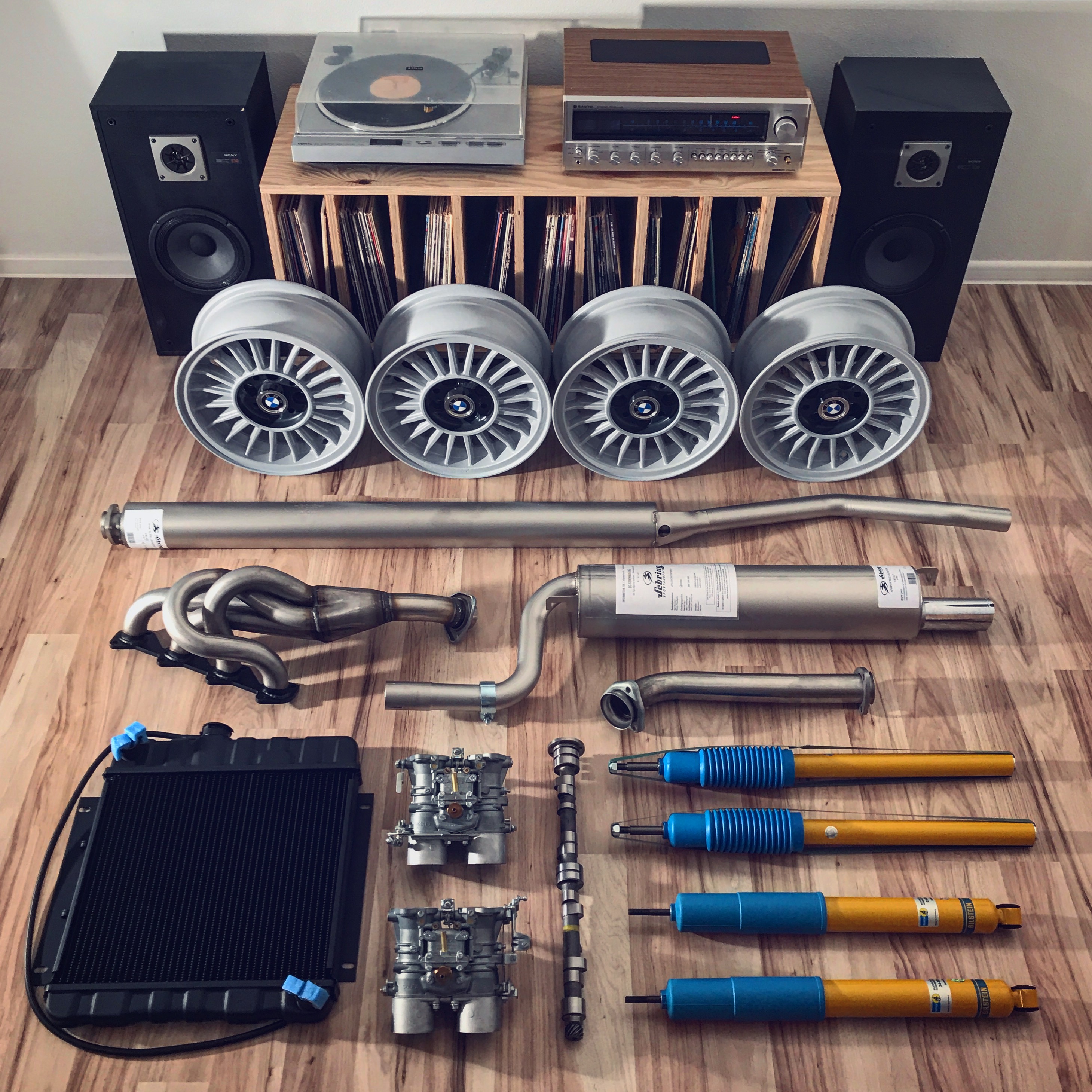 Kolesa budu 13ky "turbiny" z e21, uz ich mam zrestaurovane. Podvozok pojde 1,25 palca nizsie, tlmice bilstein sport. Vsetko bude na urethanoch od Ireland engineering, taktiez pruziny, a nastavitelne stabilizatory od IE.