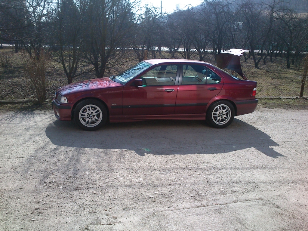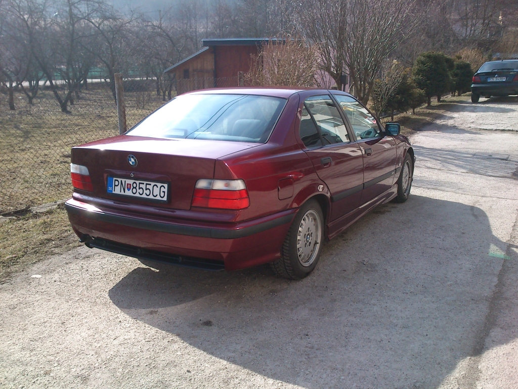 Vlastne jedná sa o 320i e36 rokom výroby 12/1996 vo farbe calypsorot metallic a exterierovým m paketom. V 2005 bolo dovezené z Nemecka. Zatial mám auto len 2 mesiace, ale nemôžem na neho jediného krivého slova povedať.Samozrejme má svoje muchy ako hučiace zadné ložiská, ktoré sa už plánujú objednávať a niekedy vŕzga volant(už som si zvykol). Na aute som zatial vymenil nové čelné sklo a stierače BOSH. V pláne mám hlavne pretesnenie VANOSu, spomínané ložiská a nastriekanie predného nárazníka a kapoty lebo kamienky dali zabrať. Úpravy a doplnky? No neviem, Mpaket mám, ale chcel som riešit Lipko predného nárazníka a aj vzadu na kufry, ale zatial to nechám tak. V pláne by bolo možno aj GT krídlo. Chcem auto mať v originalnom looku teda angel eyes riešit nechcem ani žiadnych bubeníkov do kufra lebo si myslím,že na moje nároky to hrá celkom dobre.