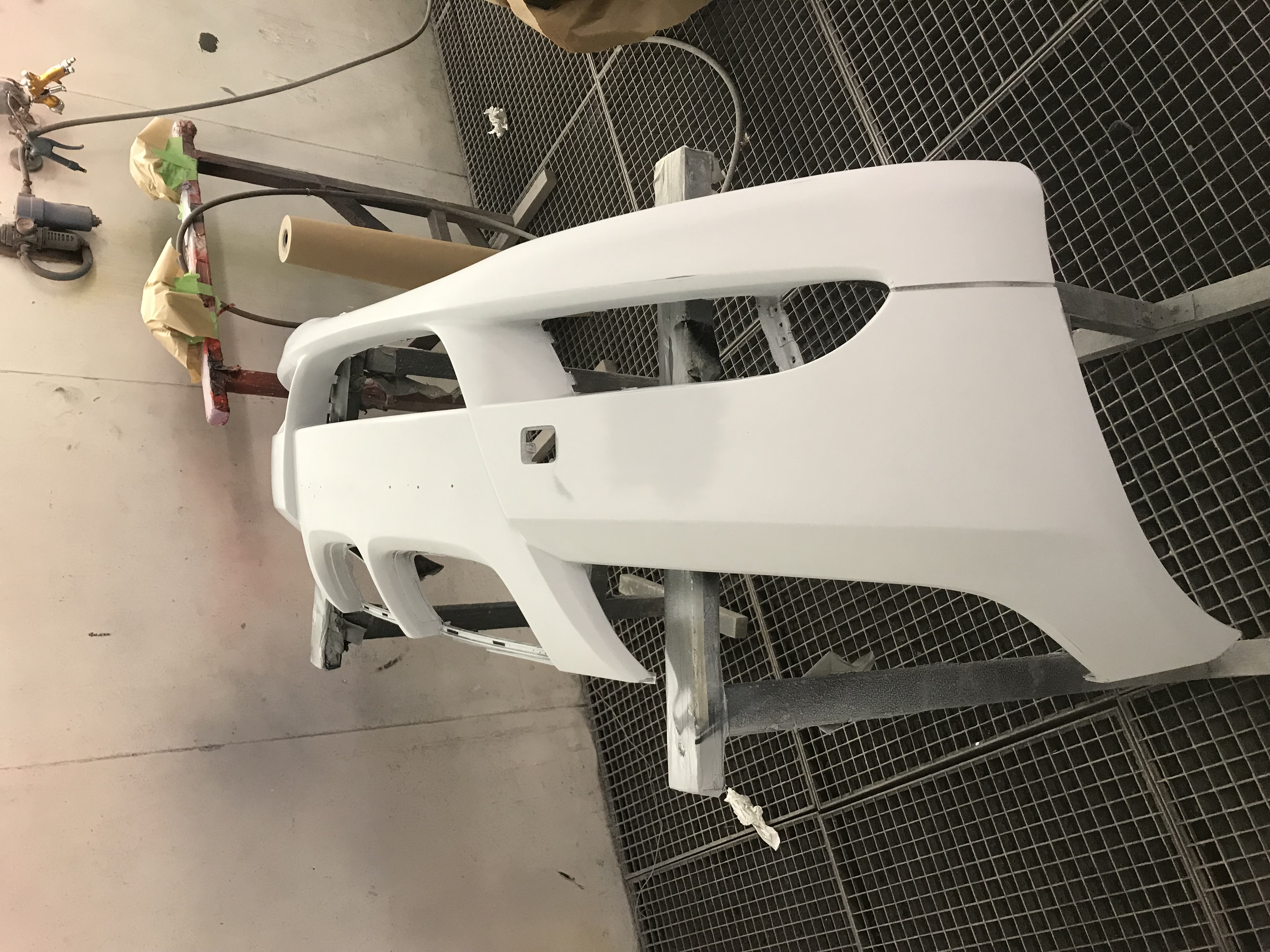 Predný nárazník rozbrúsime excentrickou brúskou až do "plastu" šmirglom P80, P120, následne zahladíme ryhy použitím brusiva P180 a najemno dobrúsime brusivom P240. Snažíme sa obrúsiť do hladka všetkú olupujúcu sa farbu, všetky škrabance, poškodenia. Celá plocha nárazníka musí byť obrúsená nakoľko tam, kde neobrúsime farbu sa nám vrstva materiálu bude po čase odlupovať.