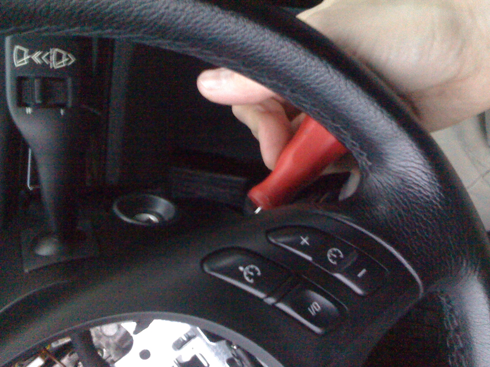 Vezmite si plochý šróbovak č.5,6, alebo podobnú veľkosť, vyčistite priestory závlačiek na spodnej strane volantu od gumy, ktorá je tam od výroby a šróbovak tam nasuňte v pozícii hod. ručičiek - 15.15=štvrť na štyri a tak isto z druhej strany..
