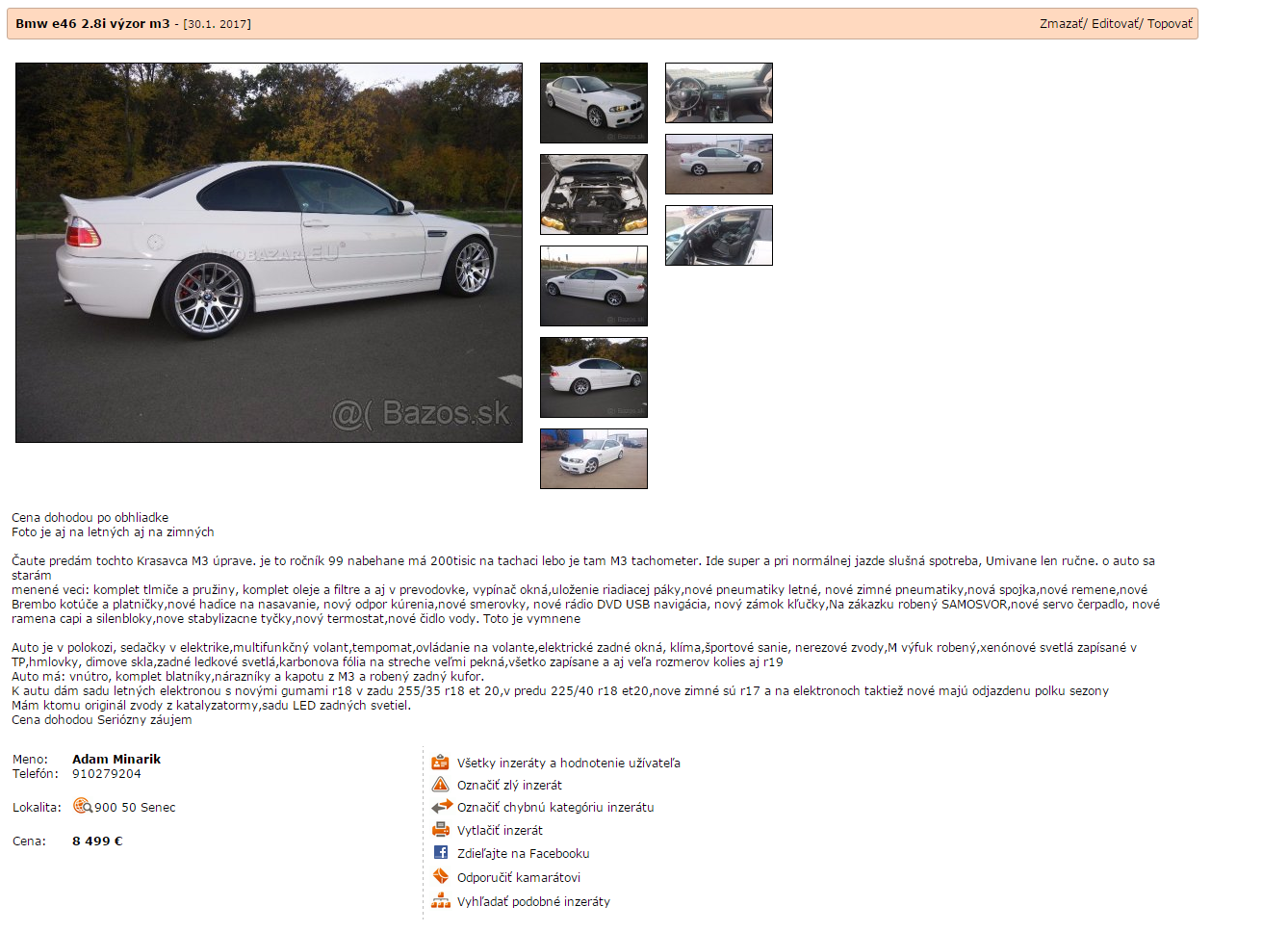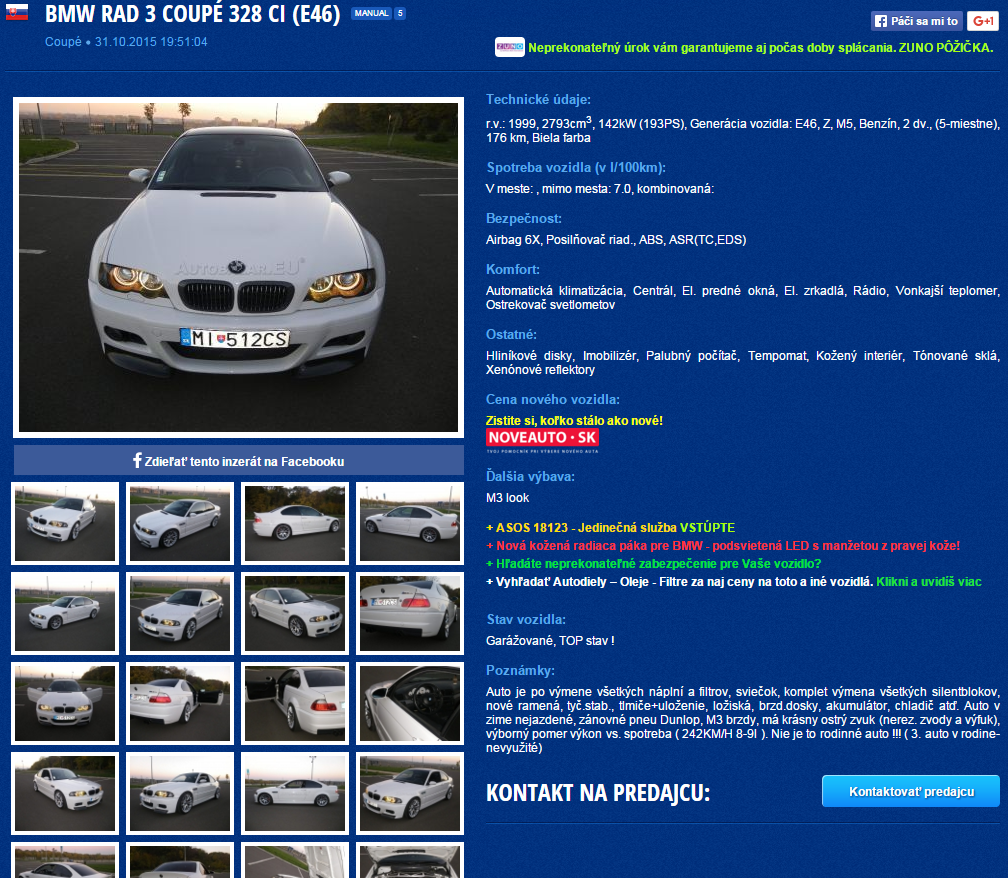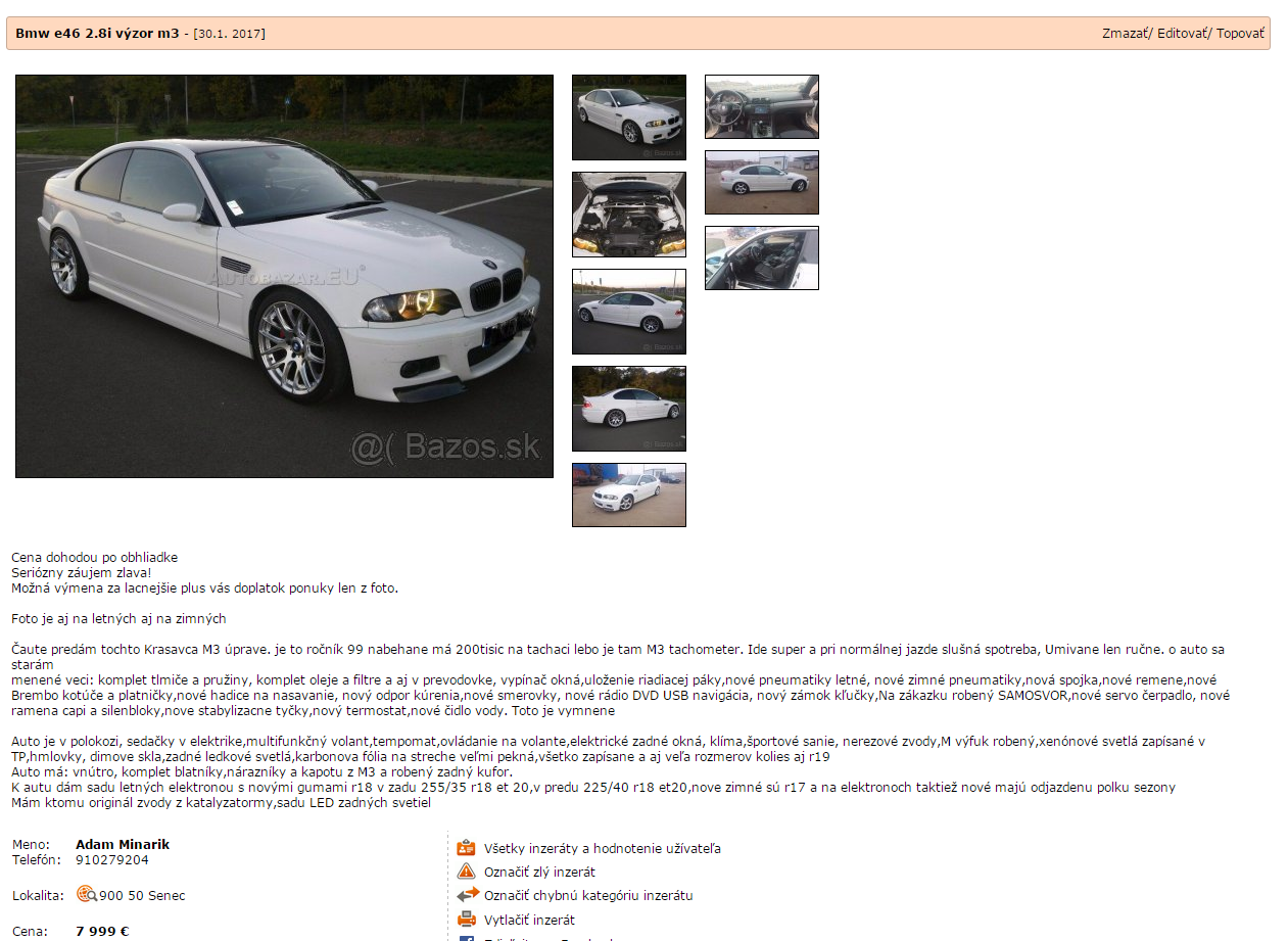 eraz s cenou šiel na 8000€, za jeden mesiac 500€ menej.Vždy ma fascinovalo tu na fóre, keď sa niekto vyjadroval k inzerátom, že "za tu cenu to nestojí" "za takú cenu nájdeš lepšie" ... Neviem kde ľudia potom hľadajú tie autá (nerátam mobile.de) :)A ešte k tým cenám, aj mne sa zdá veľa dať 8000€ za 18 ročné auto. Neviem prečo tie ceny sa tak u E46 držia....