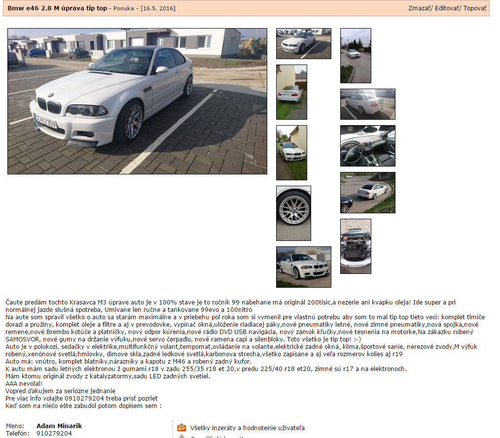 //MPower napísal:Toto auto som mal kupovat nejakých 7/8 rokov dozadu ešte od povodného majitela s CZ čo ho takto prerobil za 9000 alebo 10 000 €. Vidím že po X rokoch a XXXX km naviac stojí stále rovnako :) Ku kúpe už bolo naozaj blízko len bohužial sa nám stala dosť neštastná vec a musel som to zrušit. Viac som to auto nevidel ani nepočul o ňom.